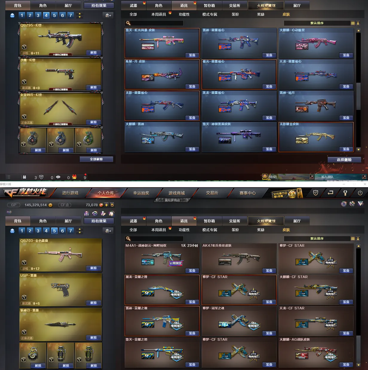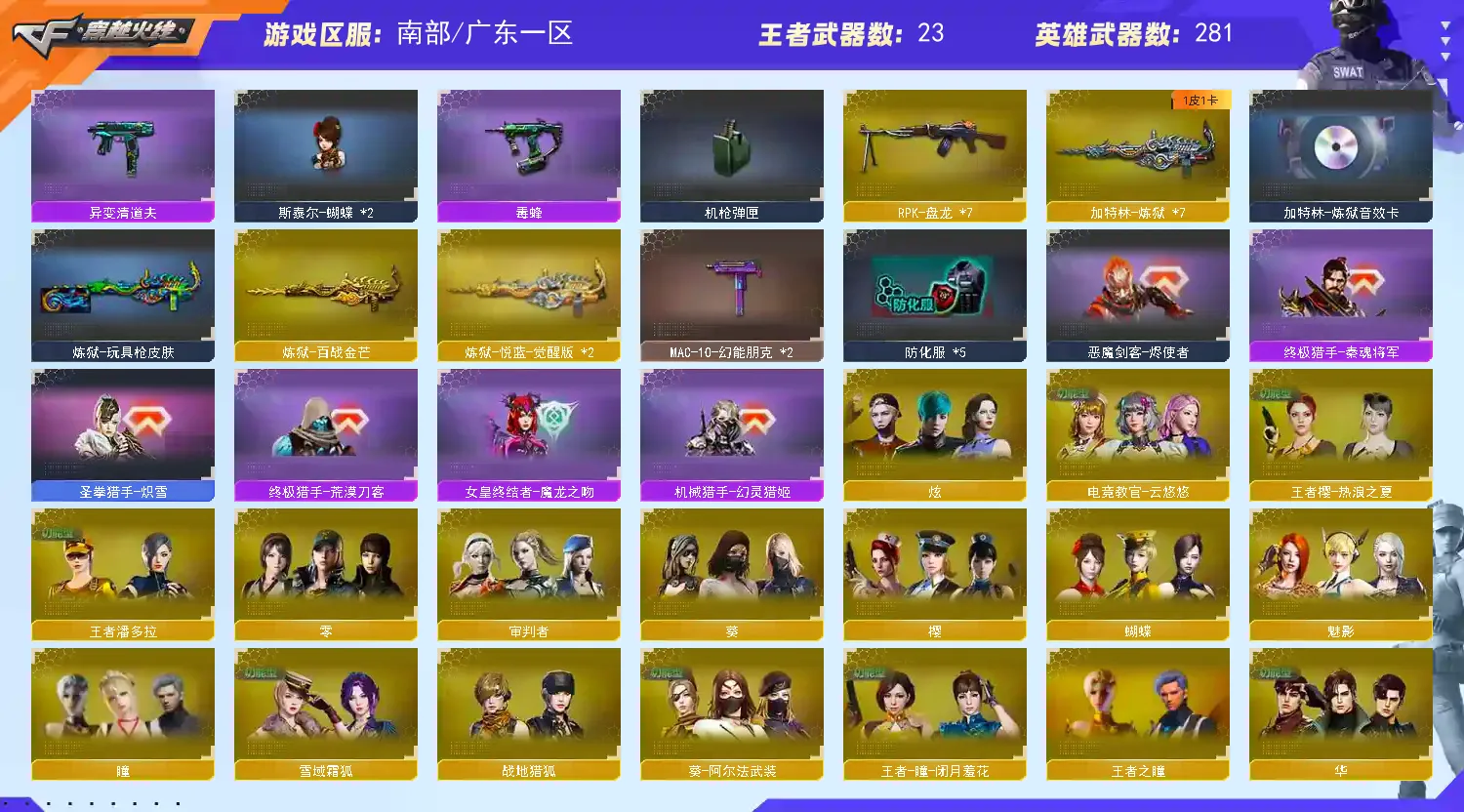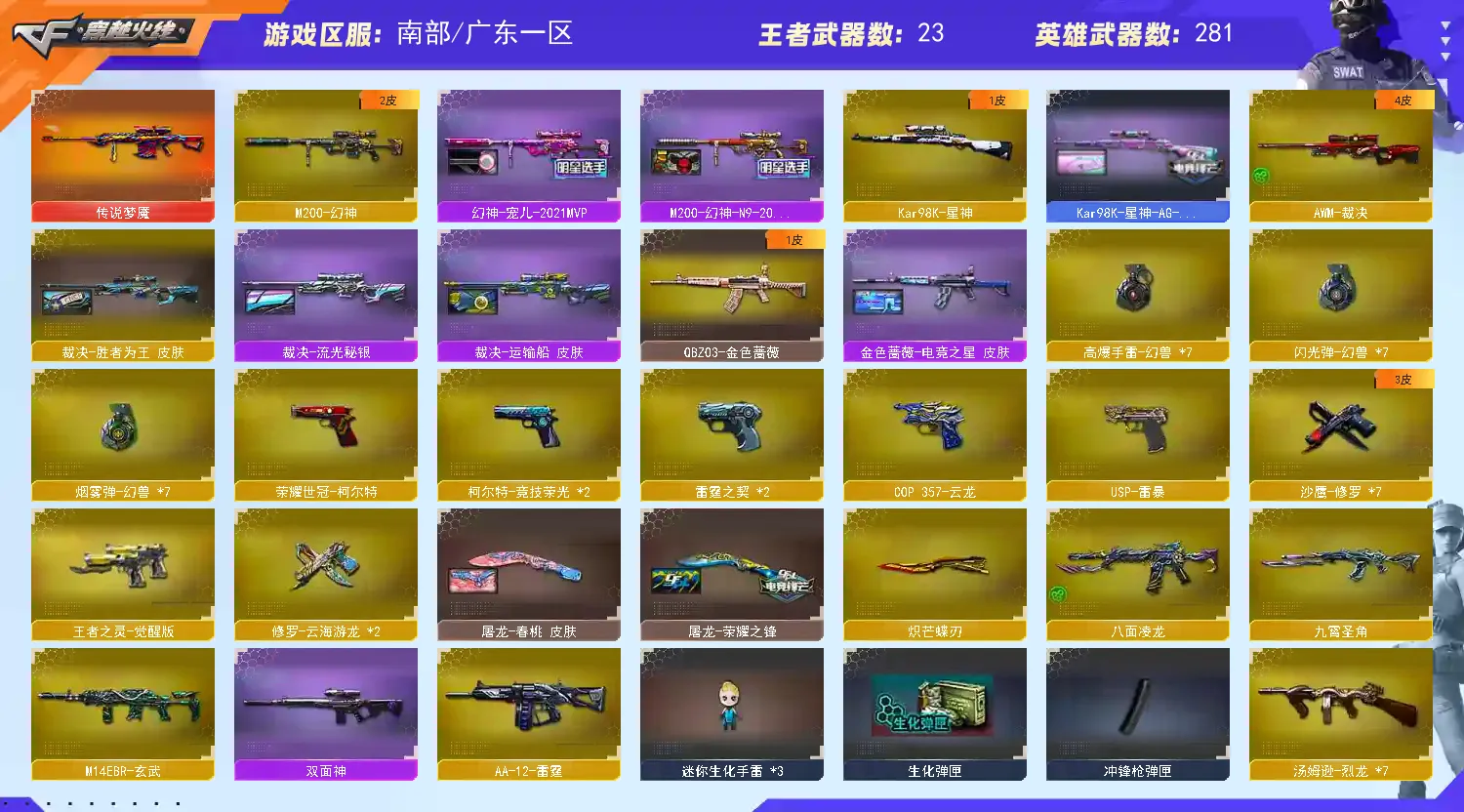 【皮肤】:黑骑士-伏羲、雷神-机甲刑天皮肤、龙啸-蛇姬皮肤、金色蔷薇-电竞之星皮肤、火麒麟-百城、炼狱-迷彩皮肤、裁决-流光秘银、裁决-运输船皮肤、炼狱-电子连击皮肤、死神-机甲核心皮肤、雷神-宇航兔皮肤、火麒麟-盘古、雷神-源计划2.0专属皮肤、火麒麟-雷神、Barrett-金色蔷薇-蛇姬皮肤、黑骑士-破界皮肤、雷神-暗月、毁灭-神秘黑洞皮肤、死神-秘银、炼狱-玩具枪皮肤、雷神-化蛇皮肤、火麒麟-心动糖果、毁灭-百城浙江皮肤、黑龙-暗月、屠龙-惊鸿皮肤、毁灭-虹光风暴皮肤、天龙-秘银、无影耀金皮肤、麒麟刺-萌杀皮肤、炼狱-月皮肤、火麒麟-平天大圣、M4A1-千变-孔明皮肤、AK47老兵传说皮肤、毁灭-英雄计划皮肤、屠龙-春桃皮肤、龙啸-清清莓果皮肤、裁决-胜者为王皮肤、