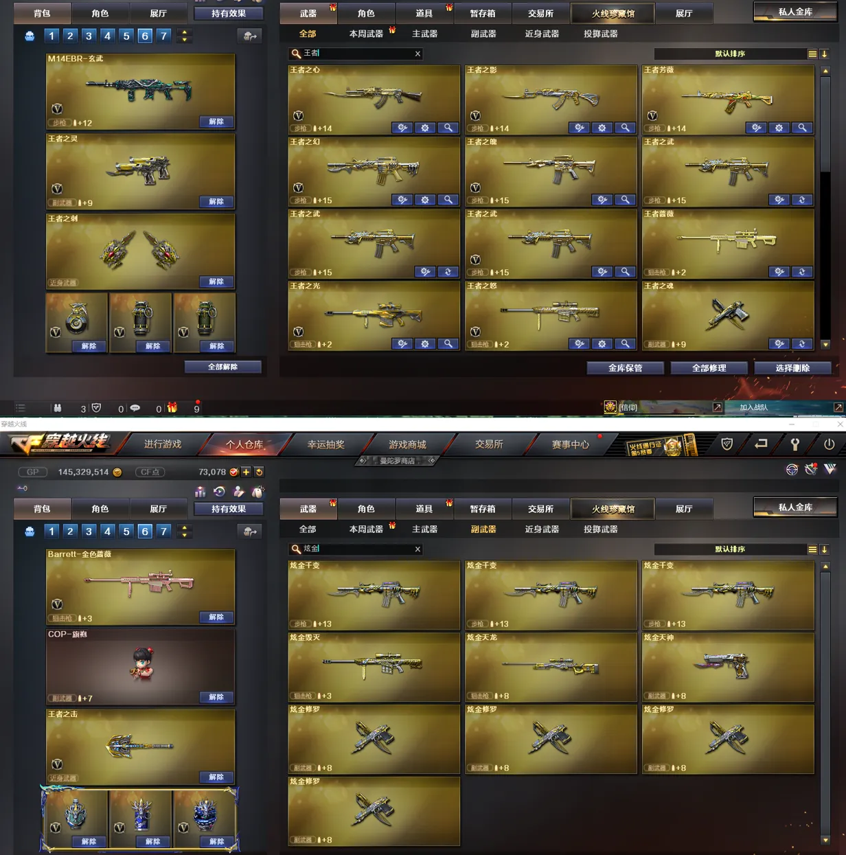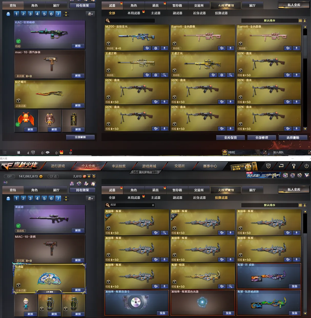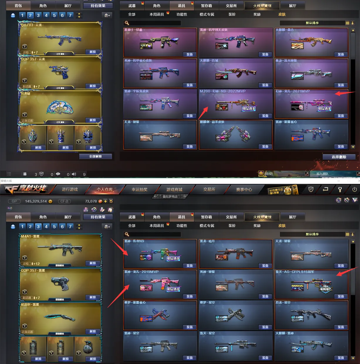【皮肤】:黑骑士-伏羲、雷神-机甲刑天皮肤、龙啸-蛇姬皮肤、金色蔷薇-电竞之星皮肤、火麒麟-百城、炼狱-迷彩皮肤、裁决-流光秘银、裁决-运输船皮肤、炼狱-电子连击皮肤、死神-机甲核心皮肤、雷神-宇航兔皮肤、火麒麟-盘古、雷神-源计划2.0专属皮肤、火麒麟-雷神、Barrett-金色蔷薇-蛇姬皮肤、黑骑士-破界皮肤、雷神-暗月、毁灭-神秘黑洞皮肤、死神-秘银、炼狱-玩具枪皮肤、雷神-化蛇皮肤、火麒麟-心动糖果、毁灭-百城浙江皮肤、黑龙-暗月、屠龙-惊鸿皮肤、毁灭-虹光风暴皮肤、天龙-秘银、无影耀金皮肤、麒麟刺-萌杀皮肤、炼狱-月皮肤、火麒麟-平天大圣、M4A1-千变-孔明皮肤、AK47老兵传说皮肤、毁灭-英雄计划皮肤、屠龙-春桃皮肤、龙啸-清清莓果皮肤、裁决-胜者为王皮肤、