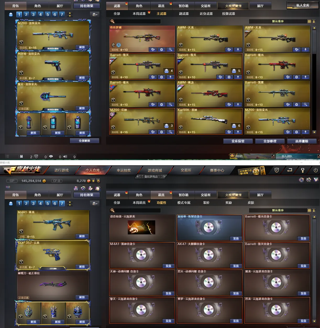 【音效】:M200-幻神-竞星跃动音效卡、加特林-炼狱音效卡、天神-动感闪耀音效卡、烈火-动感闪耀音效卡、Barrett-极光音效卡、擎天-云海游龙音效卡、AK47-火麒麟音效卡、烈龙-云海游龙音效卡、AWM-昌龙-怀旧音效卡、死神-雪域霜狐音效卡、屠龙-云海游龙音效卡、Barrett-毁灭音效卡、M4A1-雷神音效卡、炼狱-百战金芒-庆典舞曲音效卡、Barrett-碧霄极光音效卡、沙鹰-修罗-庆典舞曲音效卡、白虎-庆典舞曲音效卡、屠龙-电竞之星-竞星跃动音效卡、修罗-云海游龙音效卡、HK417-朱雀-电竞之星-竞星跃动音效卡、柯尔特-电竞之星-竞星跃动音效卡、