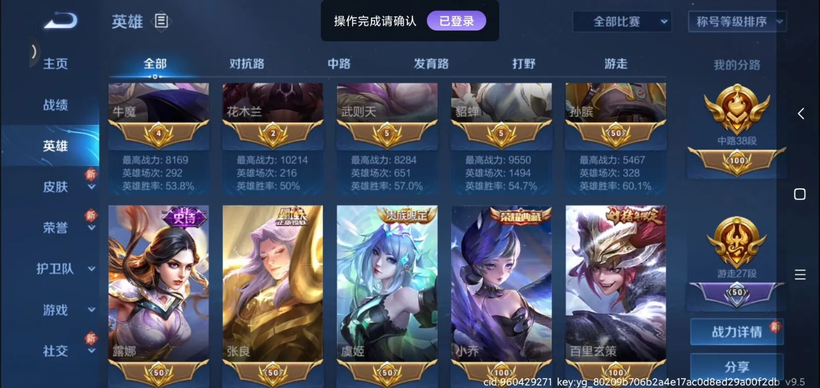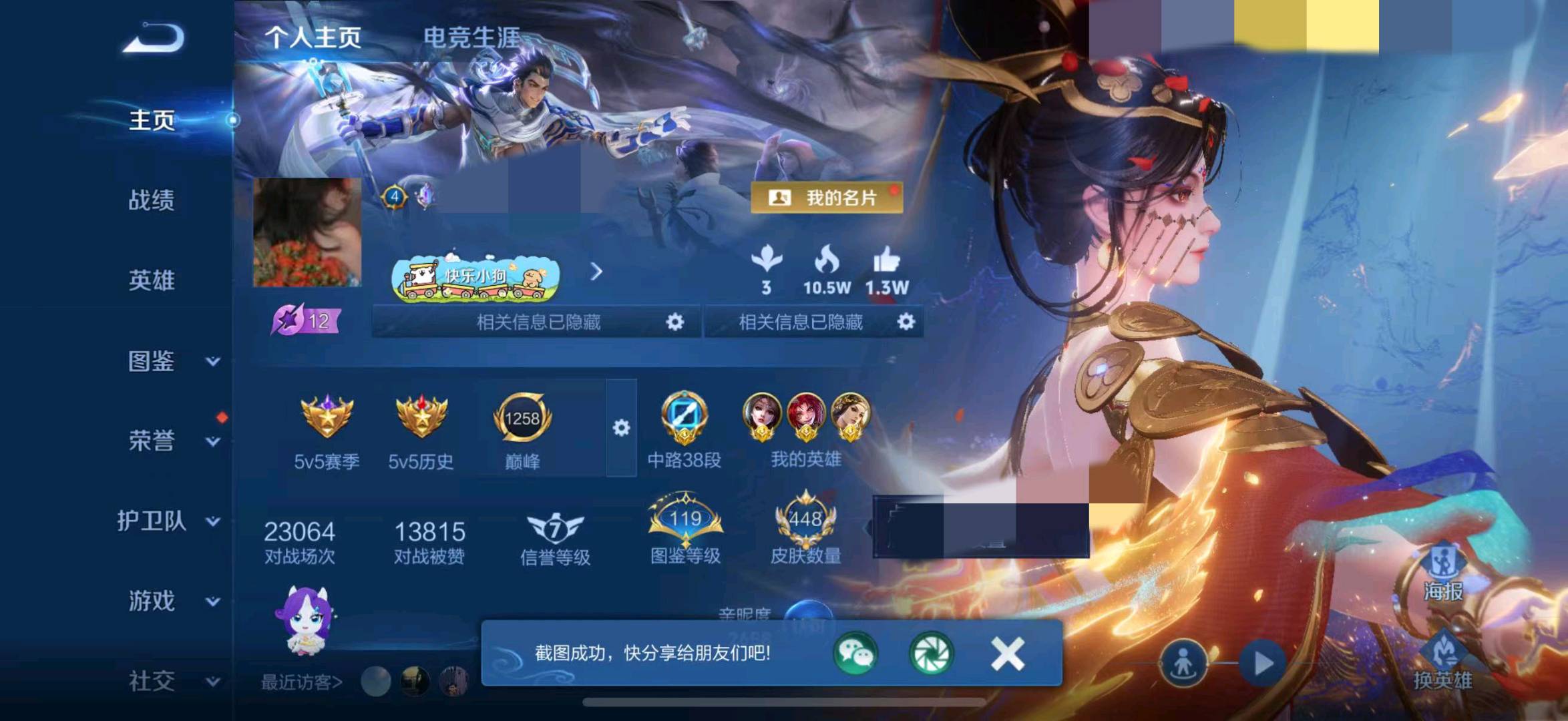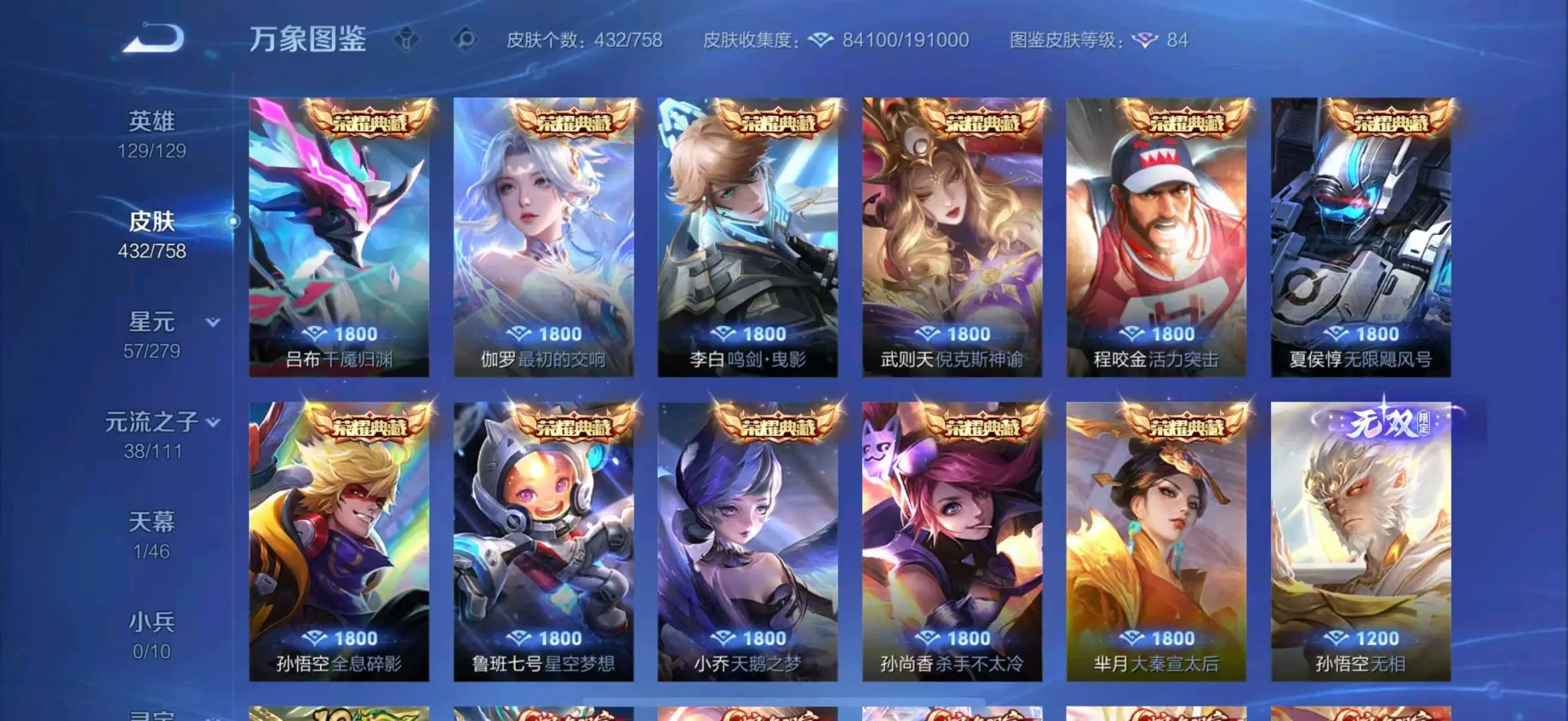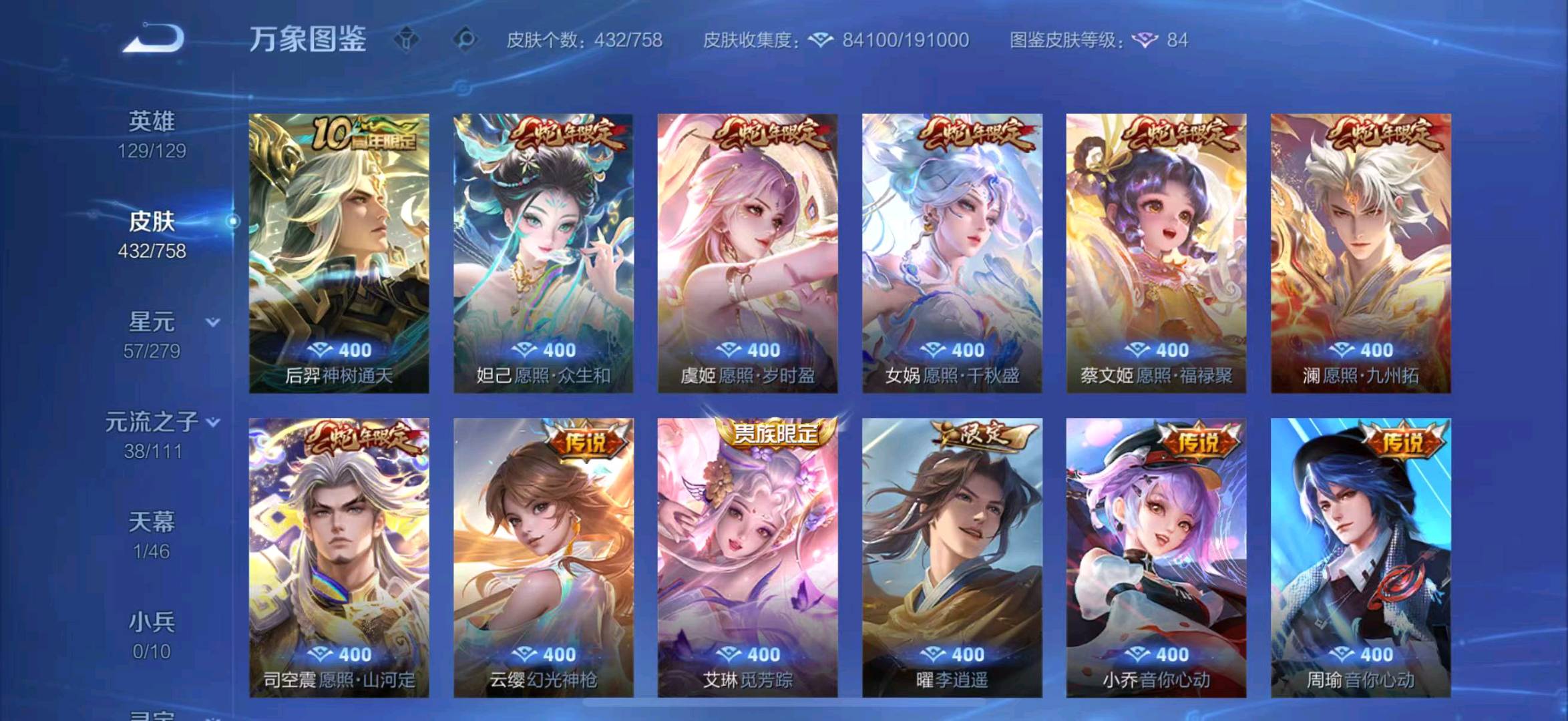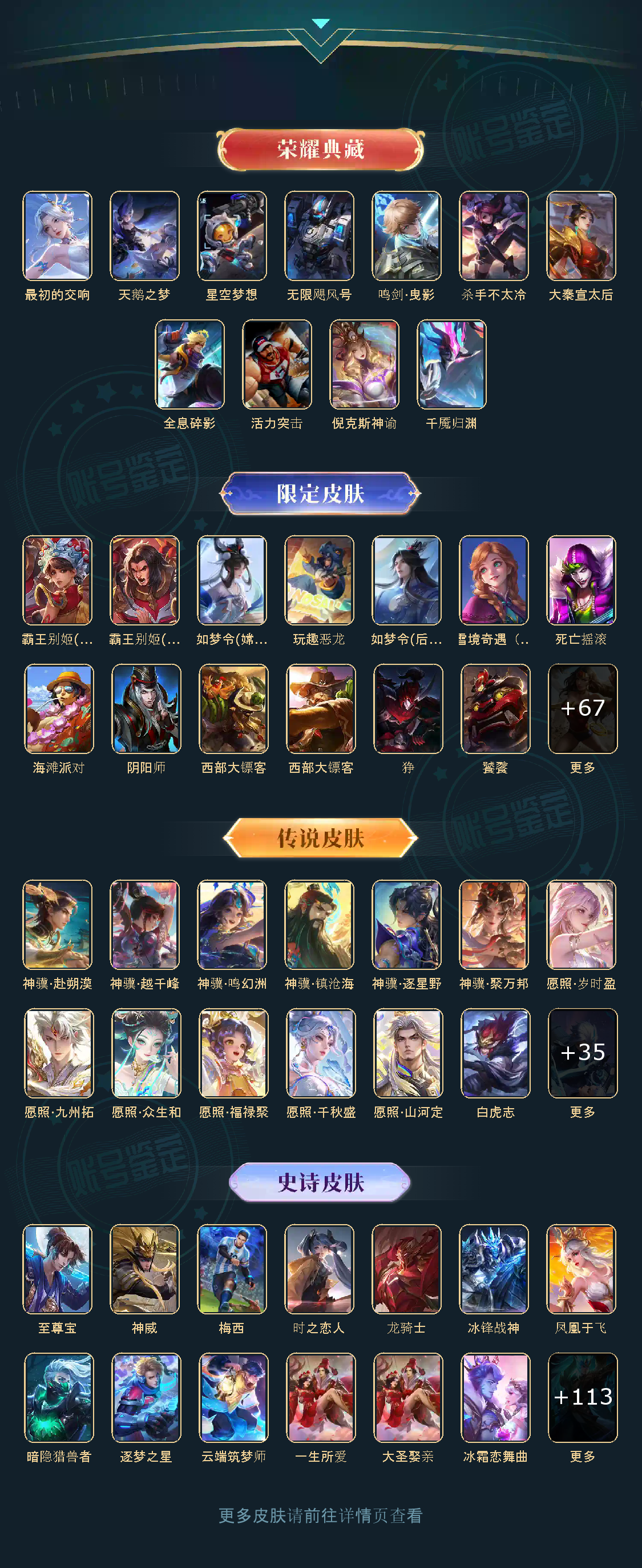 贵族等级V10,段位最强王者,英雄数量123,典藏皮肤数9,皮肤数量376,至尊宝/梅西/青龙志/白虎志/朱雀志/久胜战神/飞衡/鸣剑·曳影/李逍遥/武圣/神威/炽阳神光/时雨天司/至尊宝/梅西/青龙志/白虎志/朱雀志/久胜战神/飞衡/鸣剑·曳影/李逍遥/武圣/神威/炽阳神光/时雨天司