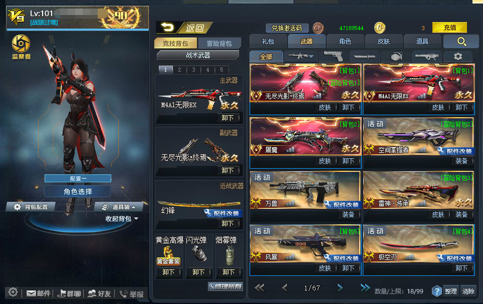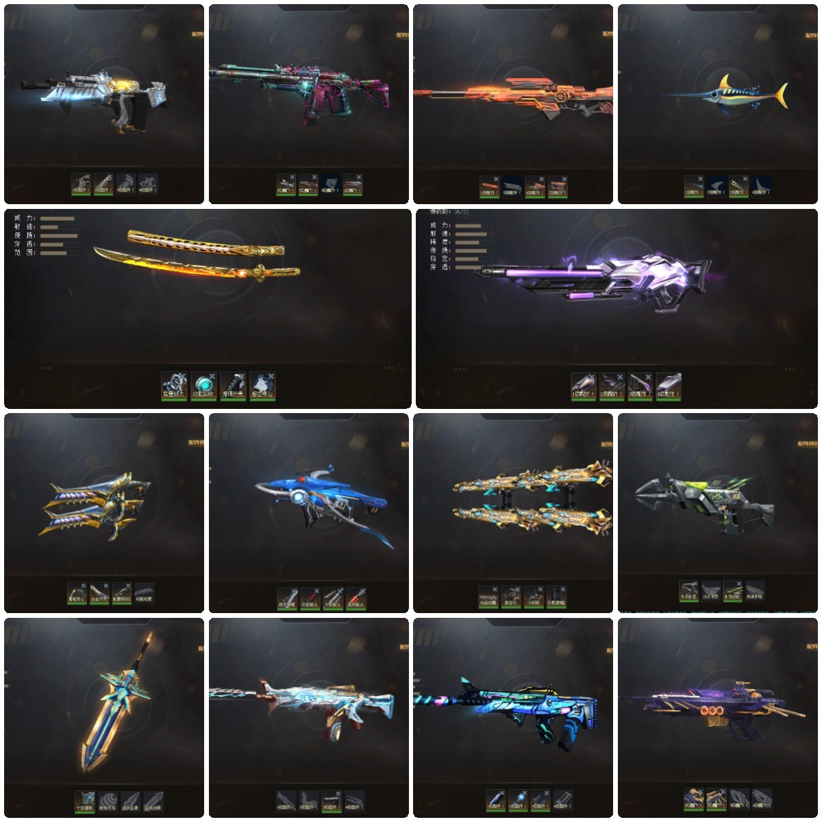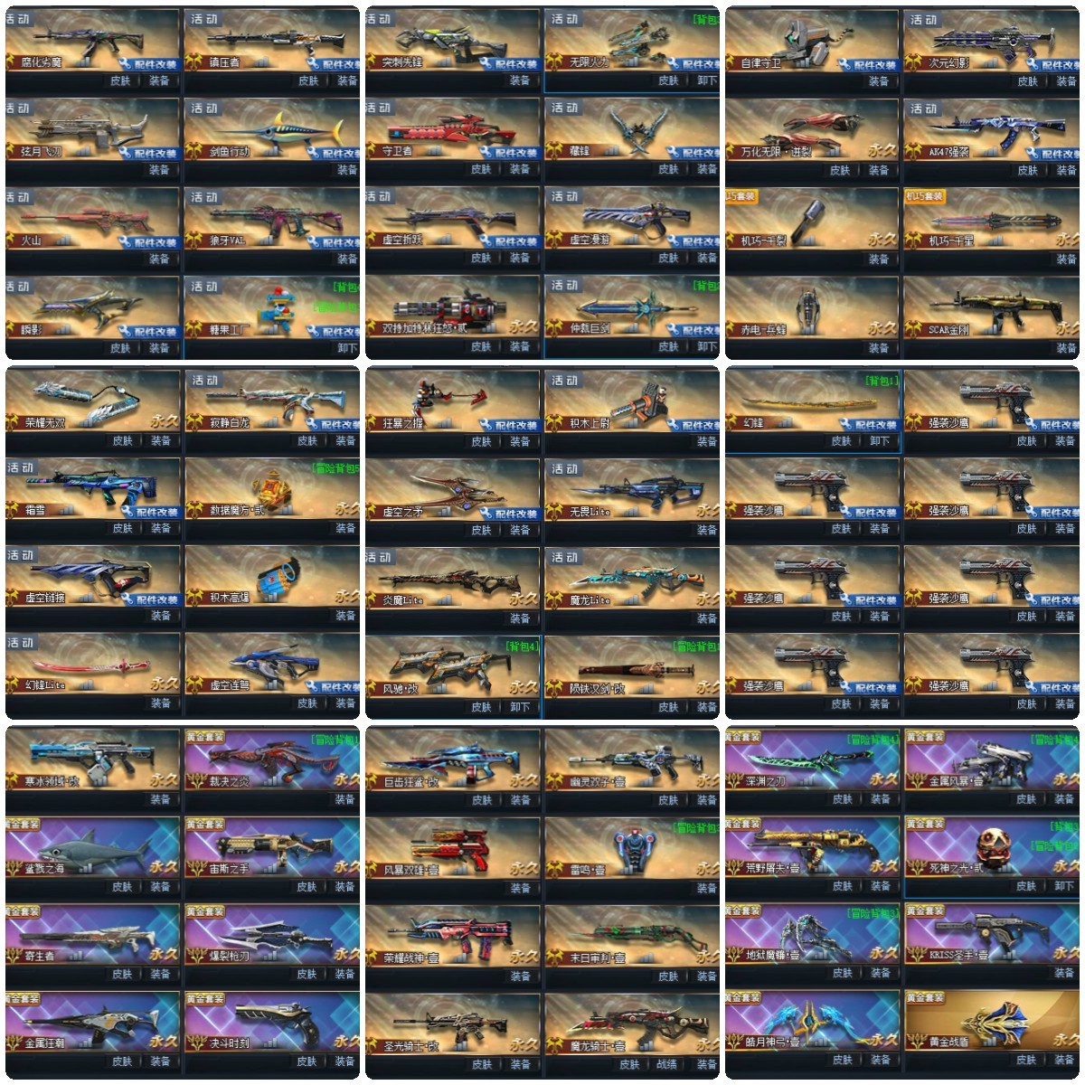【配件武器】[满配幻锋-断金][满配无限火力-审判][满配虚空连弩][满配空间掌握者][三配霜雪-另一个世界][三配浪牙][三配火山][三配瞬影][二配剑鱼行动][二配万兽][二配突刺先锋][二配风暴][一配寂静白龙-轮回+高伤][一配仲裁巨剑]