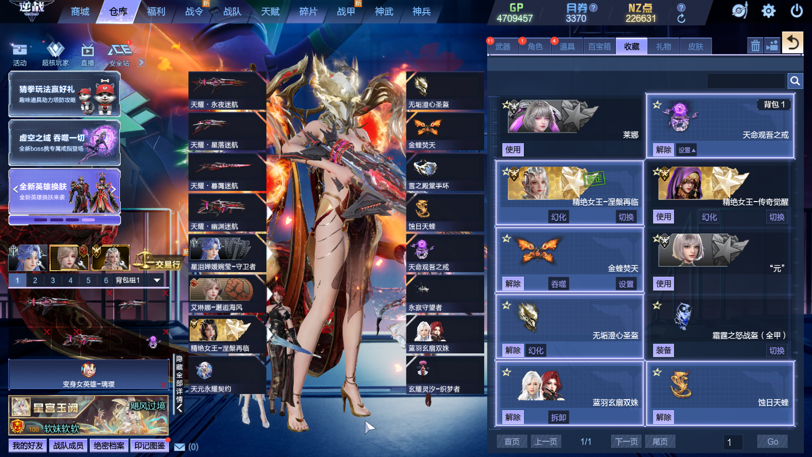 三级战甲凌空-飞羽、虹衣-神秘少女、终焉之刻6888黑翼、六核DJ天帝-剑破鸿蒙-场控天王、天王巨星皮肤、