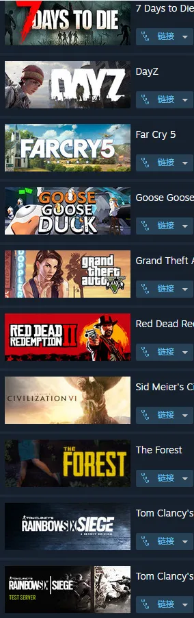 荒野大镖客2、**、GTAV、孤岛惊魂5、DayZ僵尸末日、7日杀、文明6、彩虹SIX、Forest