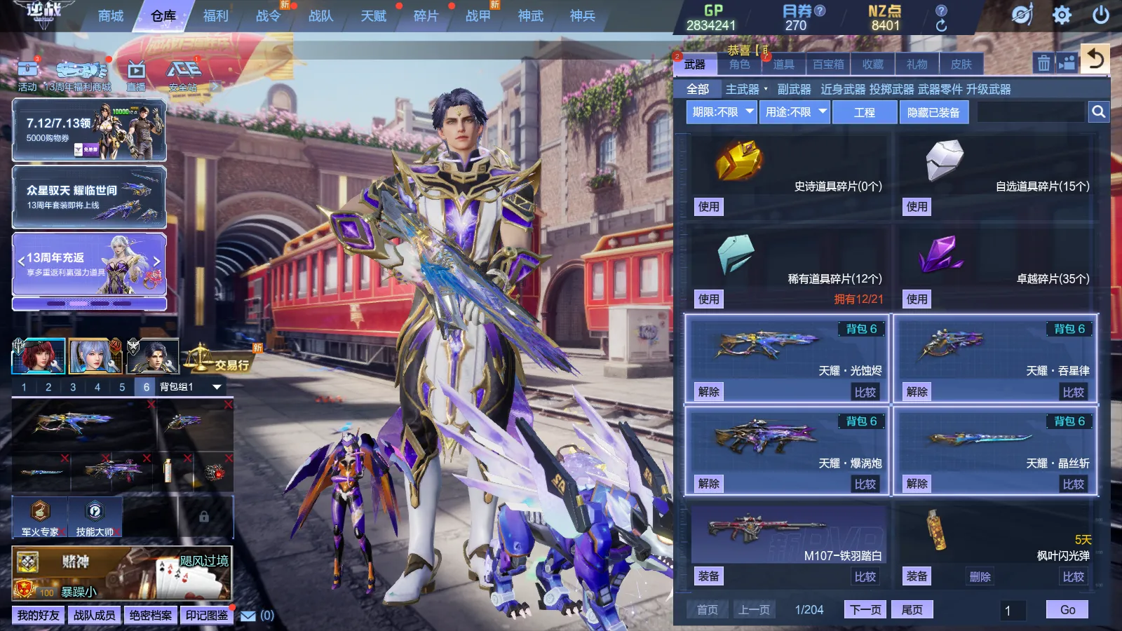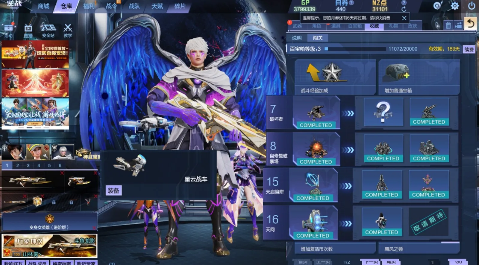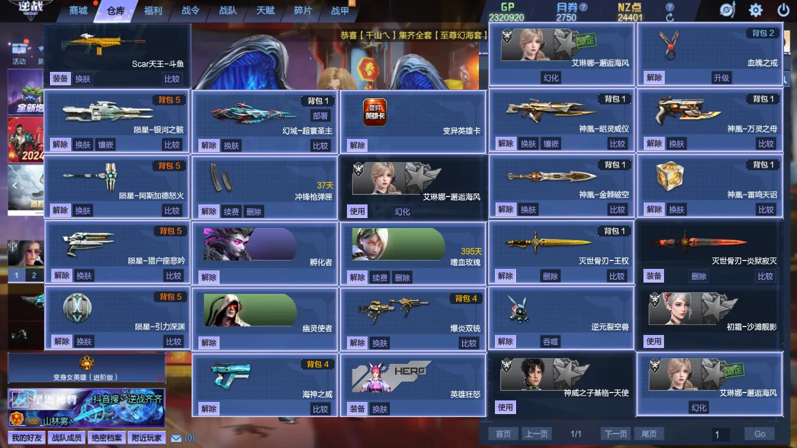 主武器:【双持UZI-泳池派对,变色龙,血魂M4,哮天犬-AK,哮天犬-狙月,诸神黄昏-末世重生,逆联赛MSR,M107-弹无虚发,钻石AK47,M107-灵魂烈焰,M107-电玩,M107-鲲鹏,镶金红玉-AK47,长风狙击-炽热牡丹,天启-深渊之瞳,长风狙击-蔷薇涟漪,天启-湮灭之影,天启-炼狱之怒,天启-苍穹之心,闪电风暴-电光,闪电风暴-雷鸣,闪电风暴,陨星-引力深渊,陨星-星门之隙,天极-永夜之主-大神,陨星-猎户座悲吟,陨星-银河之骸,天极-永夜之主,陨星-阿斯加德怒火,天极-转乾坤,天鲲激光炮,学神步枪SCAR,鬼炎M4,50式冲锋枪,巴雷特-炎狱龙魂,81-1式,M4A1-M,巴雷特-鹊桥仙,巴雷特M95-射手座,巴雷特M95-小丑狂欢,M4A1-冥王,幻域-超寰圣主,M4A1-春神句芒,88式(纪念版),M4A1-绝影,魂灵役主,95式-暗金鼠灵,95式-灵魂烈焰,M4A1-雪域迷踪,黄金AK47,95式-阿弗洛狄忒,95式步枪-阡陌暖春,M4A1-黑金,黄金Z型步枪,心灵特工-阡陌暖春,心灵特工,黑龙霰弹枪,战地KACSAW,MKV200掌上枪,MP5SD10,AK-龙皇,掌上枪-混沌缇娜,MSR-丘比特,MSR-刑天,MSR-大圣,MSR-电离对撞,MSR-蔷薇,MSR-龙皇,AK47-寻龙,AK47-山水画意,极夜星魂-凛冽冰蓝,OTs-14,AK47-虹能超导,P90-龙纹魔石,AK47-逐月,AK47-阡陌暖春,极寒冰神-纸鸢,AK47【逆战版】-堕天使,极寒冰神,RPK-S,RPK-百鸟朝凤,AK74-鹊桥爱恋,Scar-9周年,SCAR-夏日焰火,泰坦双星,SCAR-天王,浴火战神,SCAR-星尘,海王M4-源代码,深渊之瞳-流光,Scar-桃园溪涧,SCAR-火凤,湮灭之影-流光,Scar-赛博霓虹,火神炎帝,灭烬之嗣,AN94-八周年,AN94-地狱烈焰,AN94-蛟龙游,Scar天王-金鳞化龙,AN94-青鸾,Scar天王-骑士精神,炼狱之怒-流光,炼狱双蝎,SCAR巨齿鲨,烈焰战神,AR15-冰雪节限定,Scar朱雀-原神之怒,AR15-方天画戟,AR15-武神,AR15-清爽夏日,AR15-纳福,电磁加农炮-宙斯,神凰-昭灵威仪,T2MK5,TMP,Ultimax100,UMP45-炽热牡丹,AWM-亘古永恒,Z型步枪,离震双法战术终端,AWM-地狱火,AWM-狰,刺刀AK47-十周年,FAMAS-R,加特林-狂蟒,加特林机枪,苍穹之心-流光】