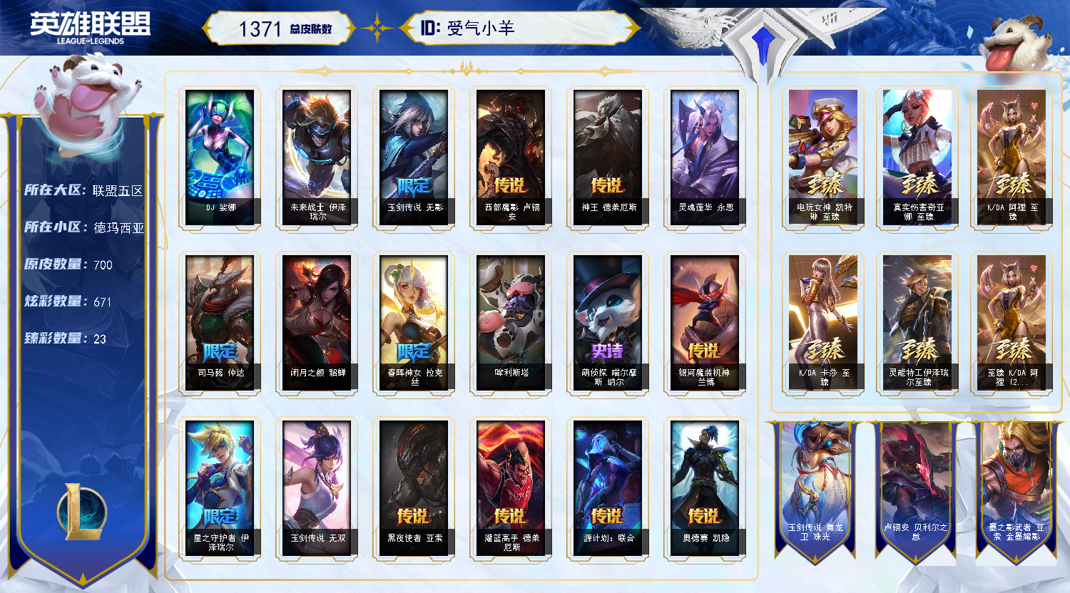 【联盟五区】1347皮丨28神话丨灵魂莲华腕豪丨至臻金卡莎丨至臻狼人 亚索 金克斯 狐狸 冰女