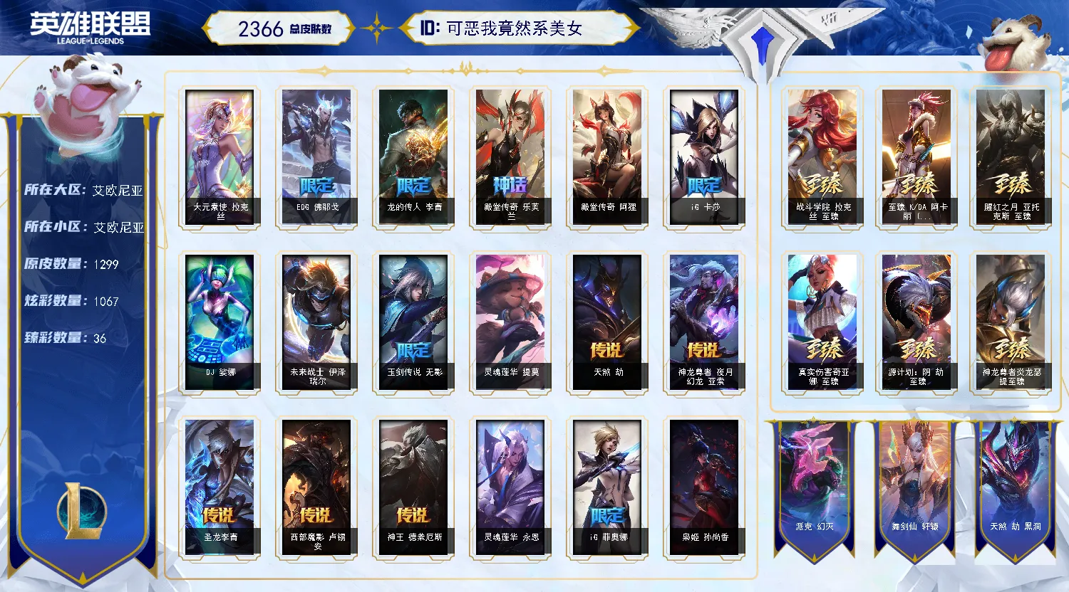 殿堂阿狸|艾欧尼亚|2384p90神话l13周年真实伤害|灵魂莲华|玉剑男女刀|龙瞎|斩星穿星