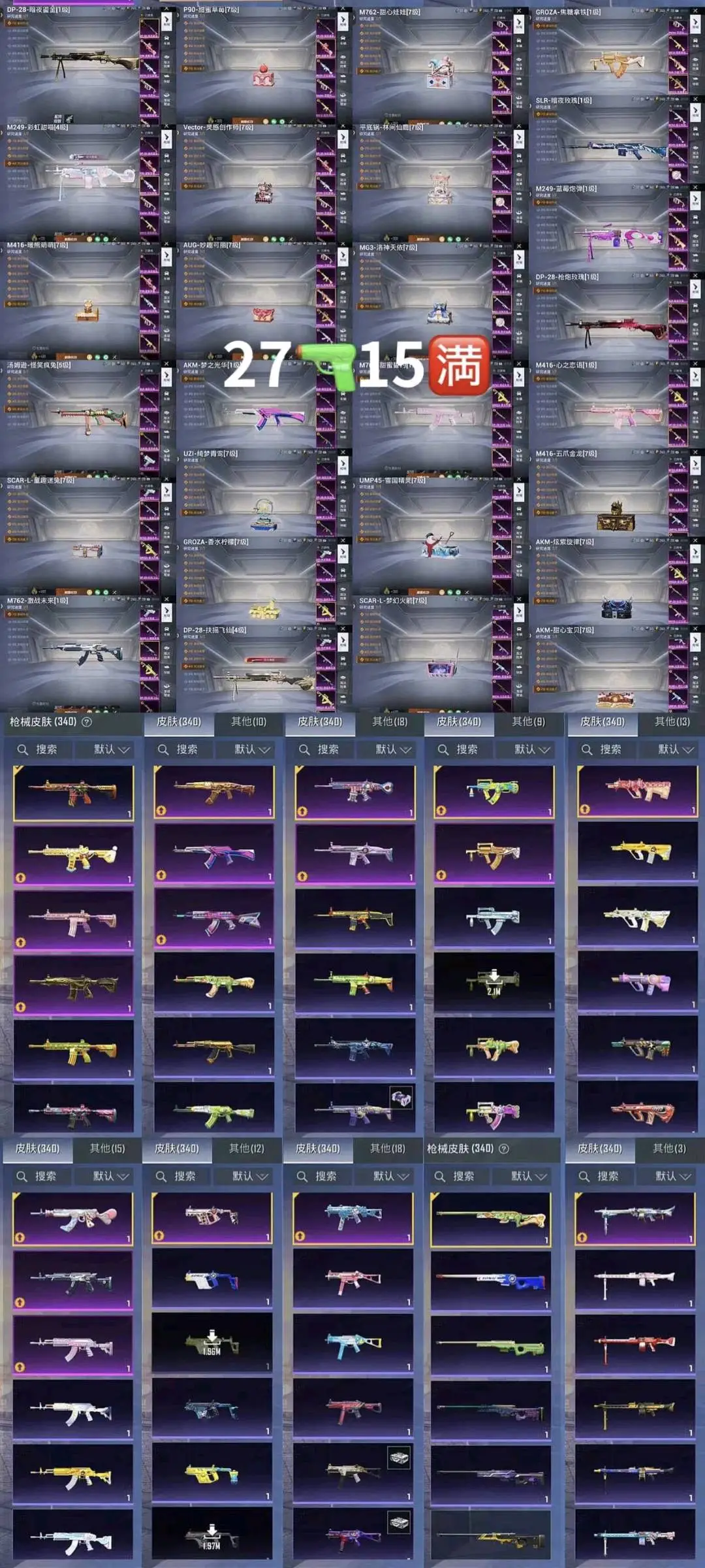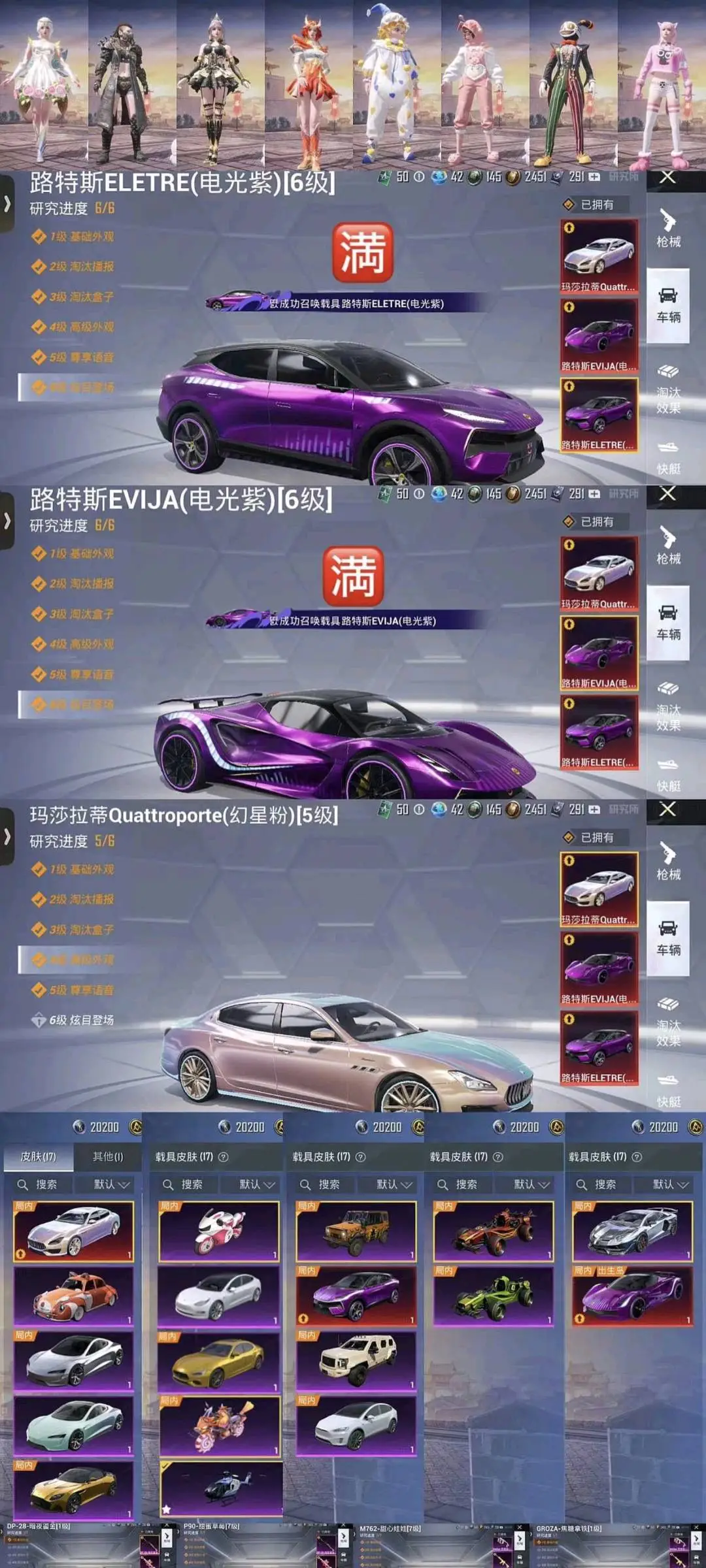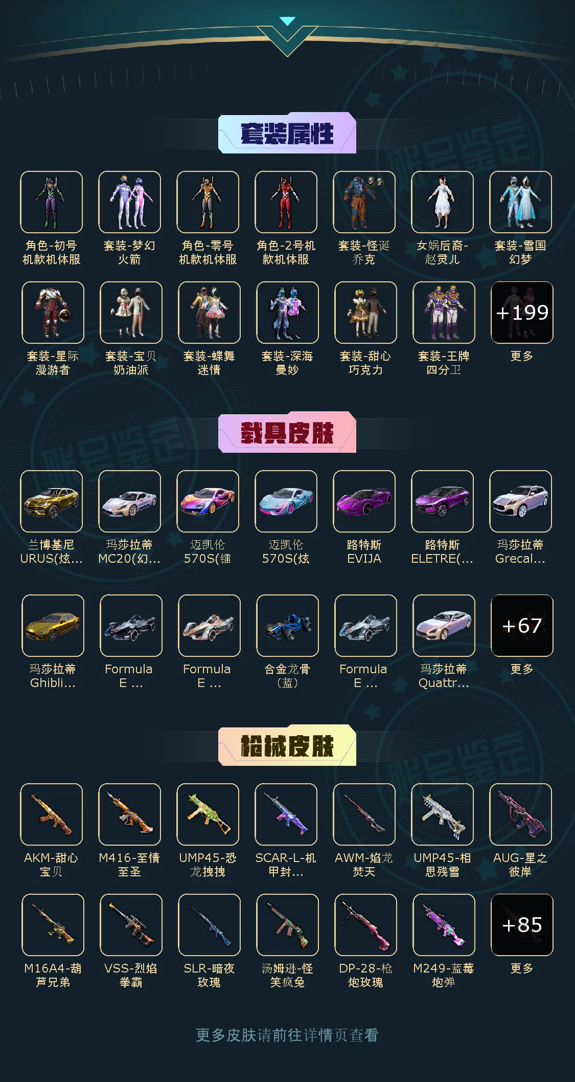 41粉,17载具,27特效枪 265套装 UZI-绮梦青鸾/AKM-甜心宝贝/DP-28-扶摇飞仙/SCAR-L-梦幻火箭/SCAR-L-童趣迷兔/Kar98K-伏魔团/SKS-碧影闪光/M416-风花雪月/AUG-星之彼岸/SCAR-L-甜梦小狐/AWM-花间之火/M762-甜心娃娃/汤姆逊-怪笑疯兔/AWM-焰龙焚天/Vector-红伞翩翩/SKS-诡面斩/MG3-炙焰牛王/M762-激战未来/GROZA-香水柠檬/AWM-橘柚倾心/M416-心之恋语/平底锅-林间仙鹿/M16A4-葫芦兄弟/Mini14-荧光虫舞/M416-五爪金龙/M24-暗星紫秘/DP-28-枪炮玫瑰/DP-28-幻梦音符/AKM-炫紫旋律/Mini14-绚金瑰梦/MG3-洛神天依/GROZA-焦糖拿铁/SCAR-L-青春物语/M249-古战神甲/M762-冷魅冰骑/AKM-百合蜜语/UZI-筑梦精灵/SLR-暗夜玫瑰/S12K-海渊国主/VSS-烈焰拳霸/Kar98K-暗翼战神/UMP45-雪国精灵/M762-甜蜜誓约/UMP45-相思残雪/SCAR-L-机甲封神/M24-星之信仰/UMP45-恐龙拽拽/Mini14-龙虾霸霸/M249-蓝莓炮弹/野牛-流星咚咚/AKM-梦之光华/Kar98K-绿意幻情/路特斯EVIJA(星际黄)/兰博基尼Aventador(翡翠绿)/玛莎拉蒂Ghibli(金)/萌喵橘座/双人摩托-双刃魅影(绿)/阿斯顿·马丁DBX(橙)/特斯拉Model X(珍珠白)/俏皮小熊猫/路特斯ELETRE(冰川蓝)/兰博基尼URUS(炫光金)/特斯拉Roadster(尊享铂)/快艇-自由的鲸/海龙奔腾/特斯拉Roadster(沁心粉)/特斯拉Model 3(珍珠白)/玛莎拉蒂Ghibli(蓝)/阿斯顿·马丁DBS(红)/双人摩托-梦幻火箭/兰博基尼URUS(尊享铂)/特斯拉Model X(奇幻紫)/特斯拉Cybertruck(极昼黑)/特斯拉Cybertruck(荒芜蓝)/兰博基尼Estoque(炫光金)/金龙耀世/快艇-塞莎KL27(深潜蓝)/焰龙咆哮/兰博基尼URUS(明艳黄)/快艇-塞莎KL27(霓虹粉)/特斯拉Cybertruck(镭光铂)/双人摩托-双刃魅影(红)/兰博基尼Estoque(银翼灰)/双人摩托-双刃魅影(金)/合金龙骨(蓝)/灵鼠银迹/阿斯顿·马丁DBS(绿)/阿斯顿·马丁DBX(金)/特斯拉Model 3(奇幻紫)/特斯拉Model 3(冷光银)/合金龙骨(绿)/特斯拉Roadster(水滴蓝)/阿斯顿·马丁DBS(金)/路特斯ELETRE(花绽灰)/极速兔兔/鬼马风驰/南瓜骑士/合金龙骨(红)/兰博基尼Estoque(尊享铂)/玛莎拉蒂Ghibli(粉)/兰博基尼SVJ(尊享铂)/兰博基尼SVJ(炫光金)/软萌羊咩咩/快艇-塞莎KL27(鲸之蓝)/阿斯顿·马丁DBX(蓝)/特斯拉Model X(冷光银)