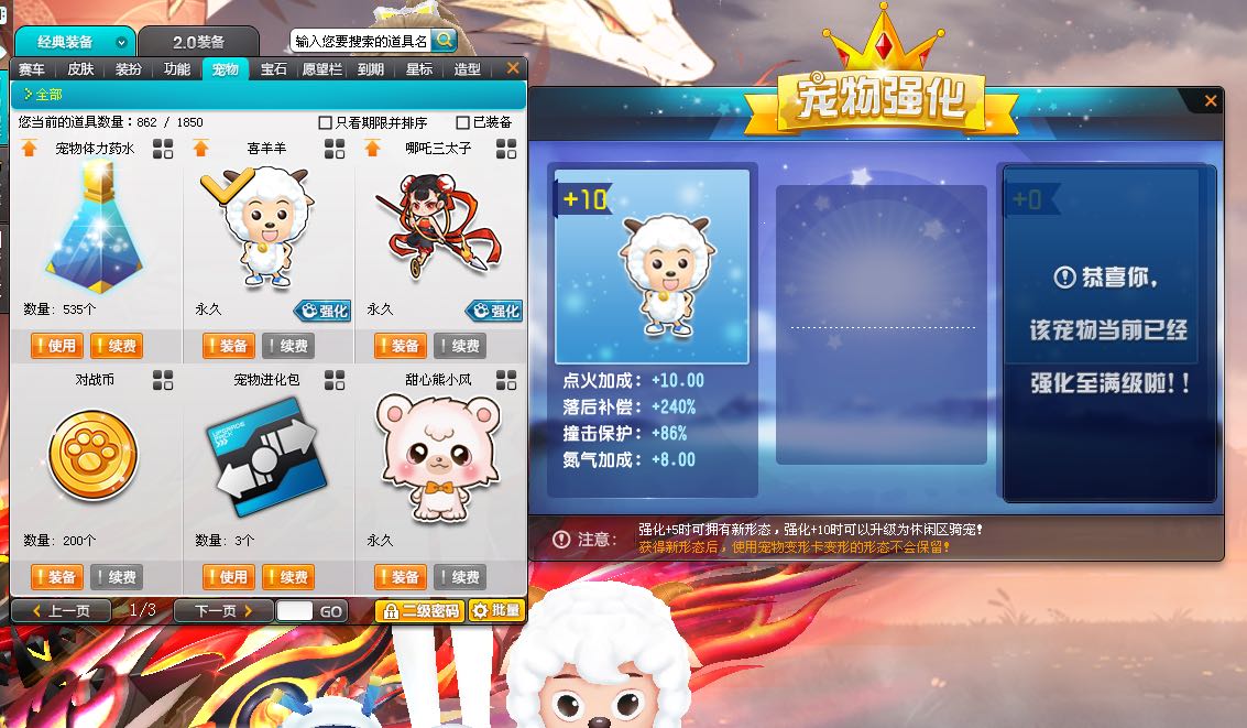竞速宠:喜羊羊10。哪吒三太子10。青丘仙狐。申公豹等。有座骑,有钻皇。