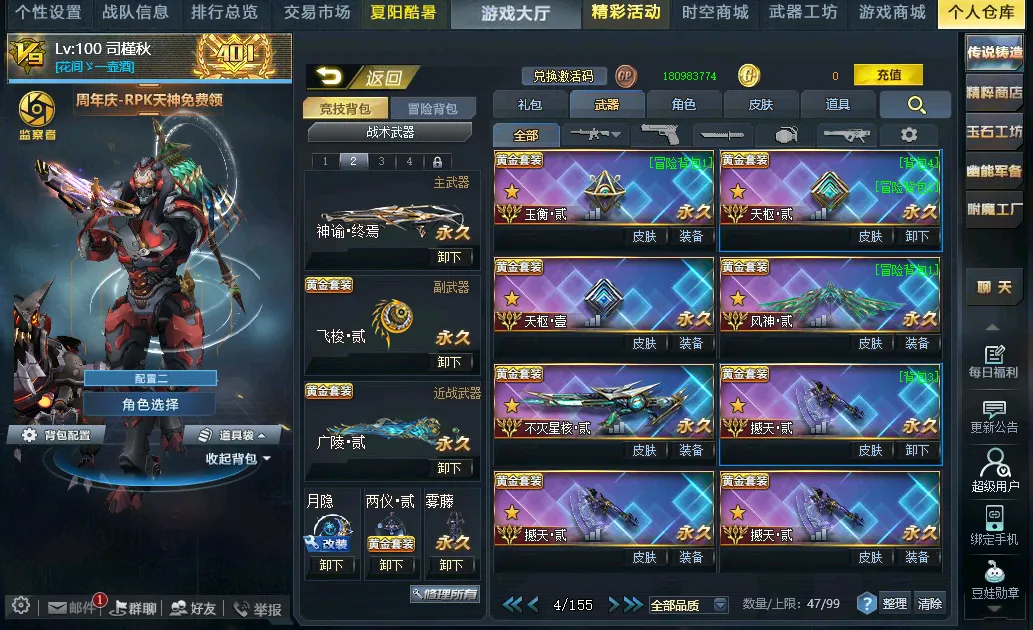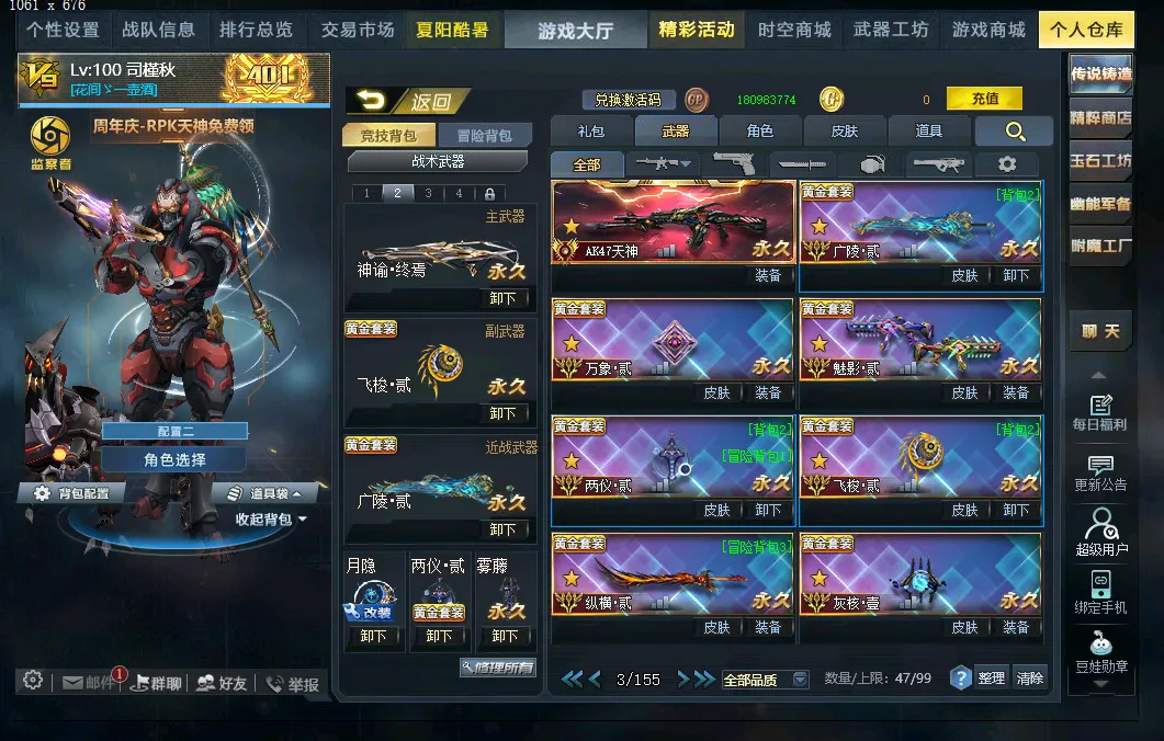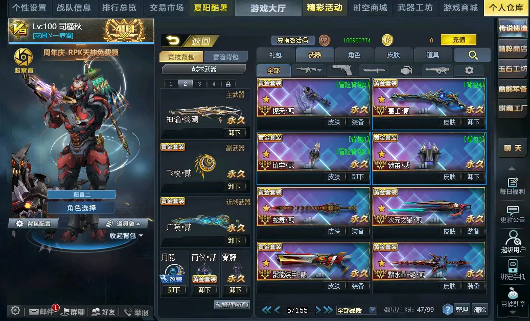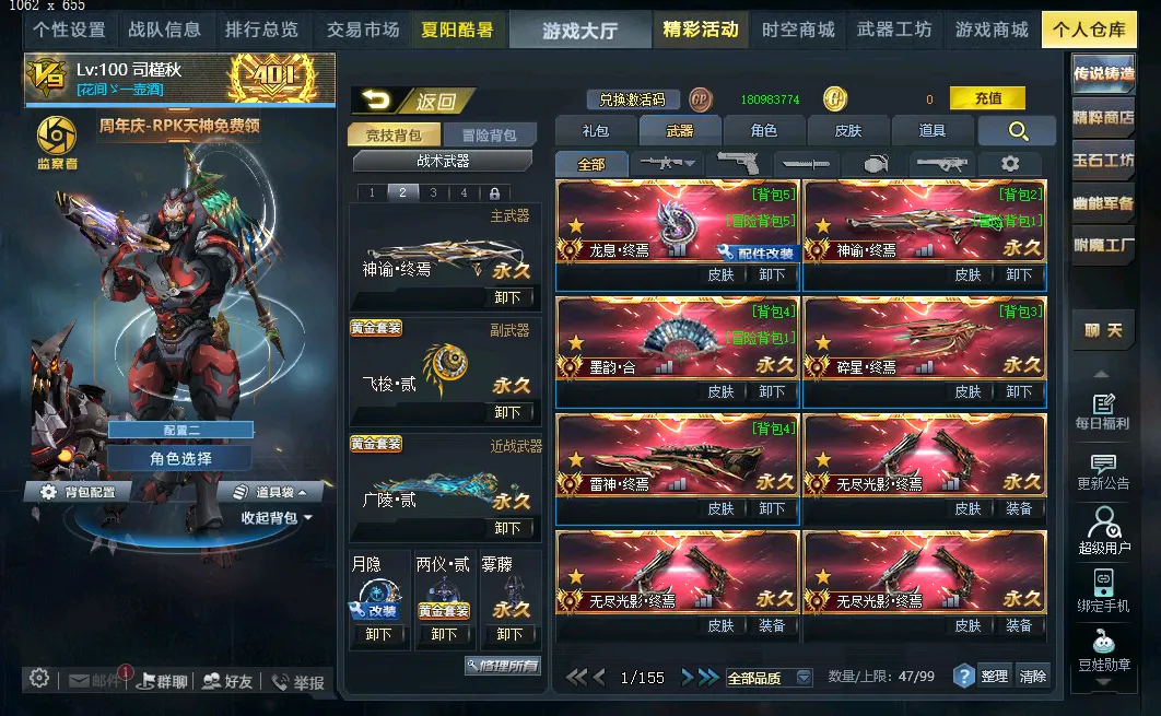 【传说武器】龙息·终焉、 神谕·终焉、墨韵·合、碎星·终焉(祥龙)、雷神·终焉(黑渊)、无尽·终焉*5、万化无限·爆裂、无限EX(紫水晶)、屠魔(御雷)、AK天神*2、rpk天神