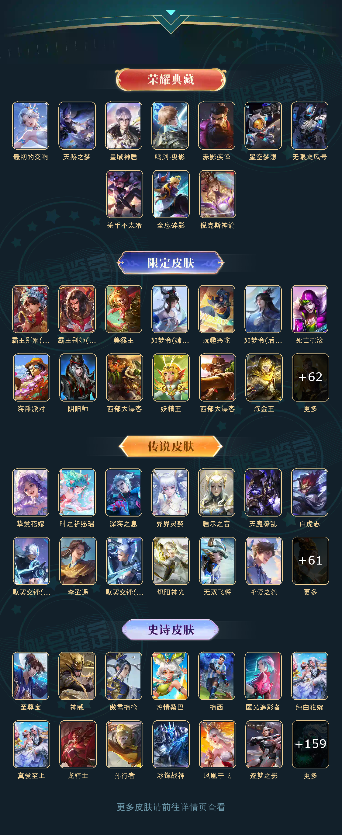 贵族等级V10典藏皮肤数9,纯白花嫁/天魔缭乱/至尊宝/真爱至上/热情桑巴/梅西/青龙志/白虎志/朱雀志/久胜战神/飞衡/倪克斯神谕/匿光追影者/鸣剑·曳影/无双飞将/时之祈愿瑶/星域神启/李逍遥/武圣/深海之息/玉兔公主/补天/异界灵契/神威/炽阳神光/启示之音/傲雪梅枪/时雨天司/纯白花嫁/天魔缭乱/至尊宝/真爱至上/热情桑巴/梅西/青龙志/白虎志/朱雀志/久胜战神/飞衡/倪克斯神谕/匿光追影者/鸣剑·曳影/无双飞将/时之祈愿瑶/星域神启/李逍遥/武圣/深海之息/玉兔公主/补天/异界灵契/神威/炽阳神光/启示之音/傲雪梅枪/时雨天司
