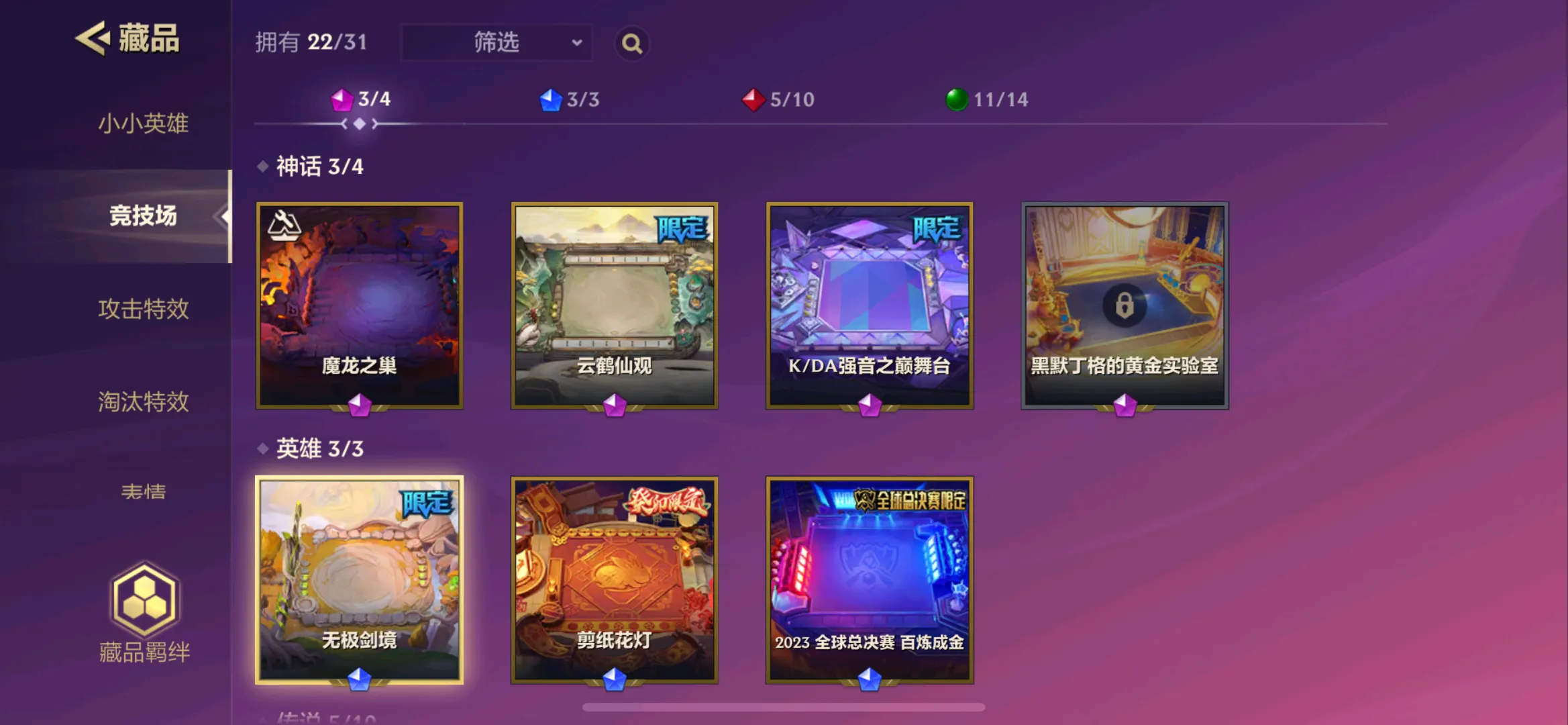金鳞魔龙之巢✅星界魔龙之巢✅碧波魔龙之巢✅云鹤仙观✅K/DA强音之巅舞台✅无极剑境✅剪纸花灯✅2023 全球总决赛 百炼成金