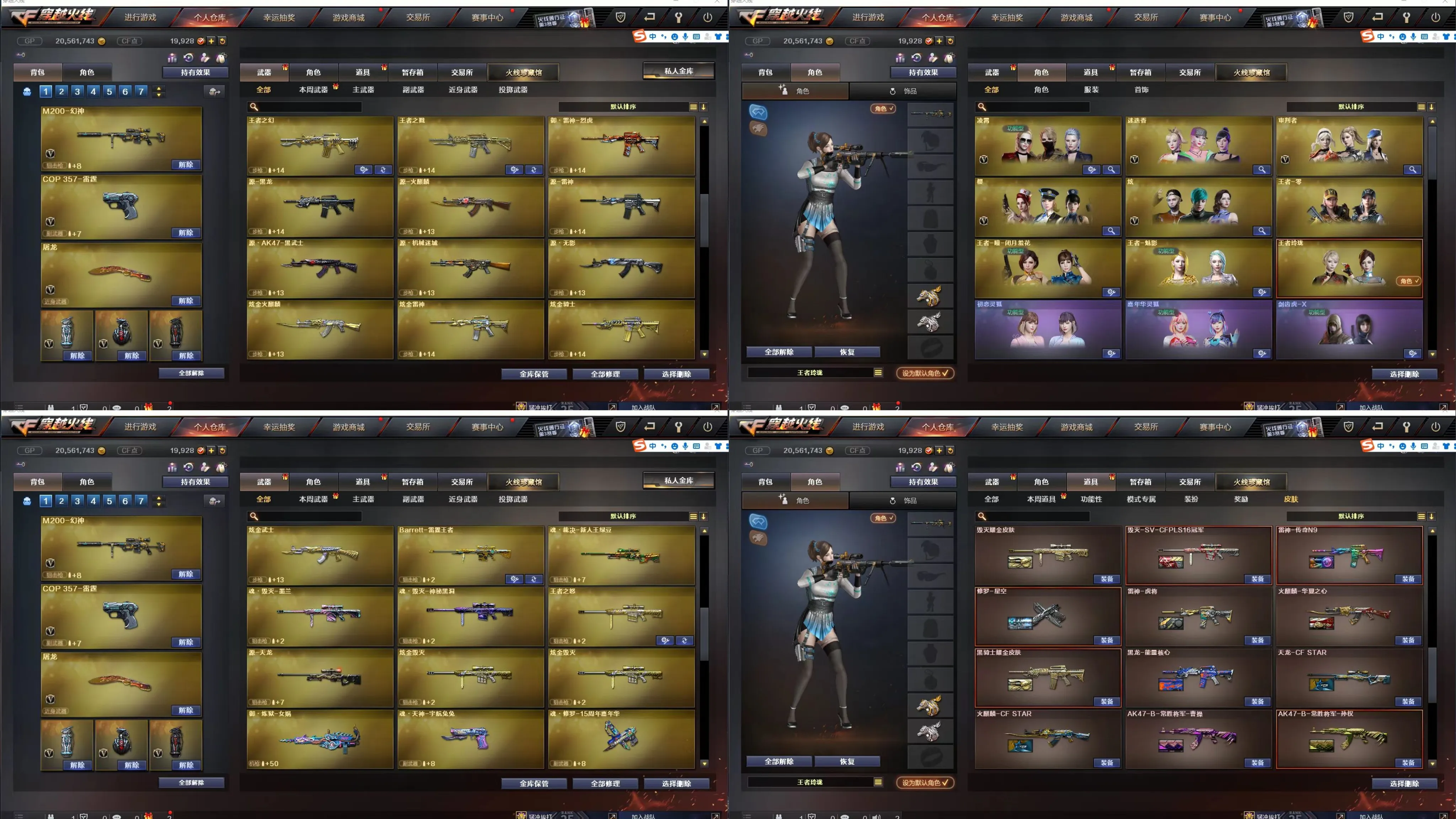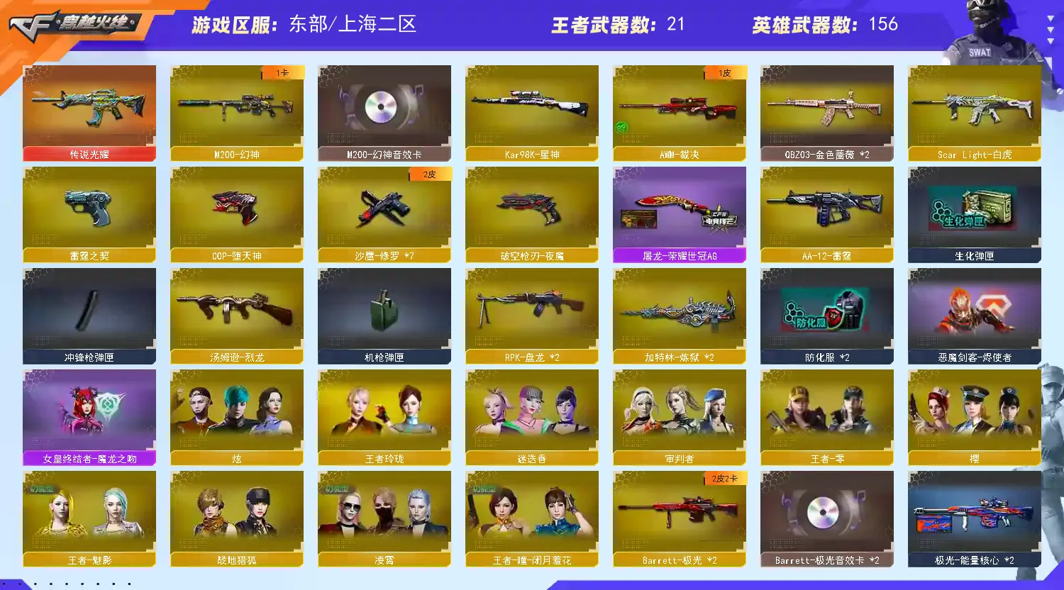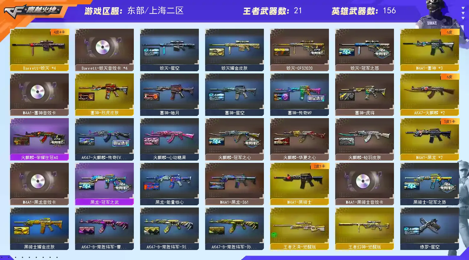 王者之心,王者之翼,王者之武,王者之魄,王者之势,王者炎心,王者火魄,王者之幻,王者之戮,王者之力,王者之决,王者幻神,Barrett-雷 霆王者,王者之怒,王者之灵,王者之魂,王者之锋,王者之击,王者之刺,炫金毁灭,炫金火麒麟,炫金雷神,炫金骑士,炫金武士,98K星神,7修罗,M200-幻神,HK417-朱雀 ,Scar Light-白虎,传说光耀,雷神星空,烈龙星空,毁灭耀金,火麒麟-冠军之心,毁灭冠军之怒,黑龙冠军之武,毁灭-CFS2020,火麒麟轻羽,黑骑士-冠军之势,凌霄,迷迭香,审判者,