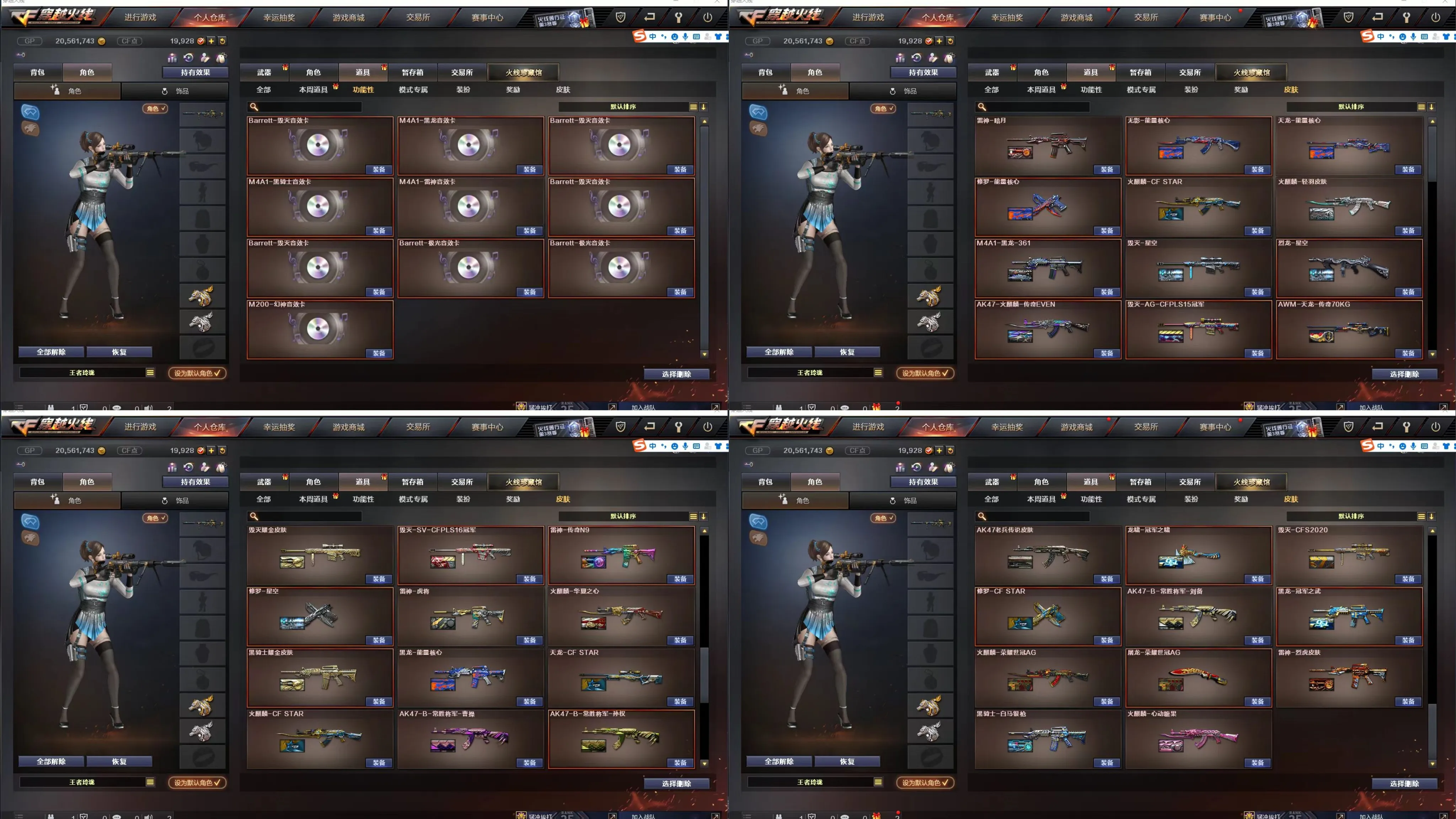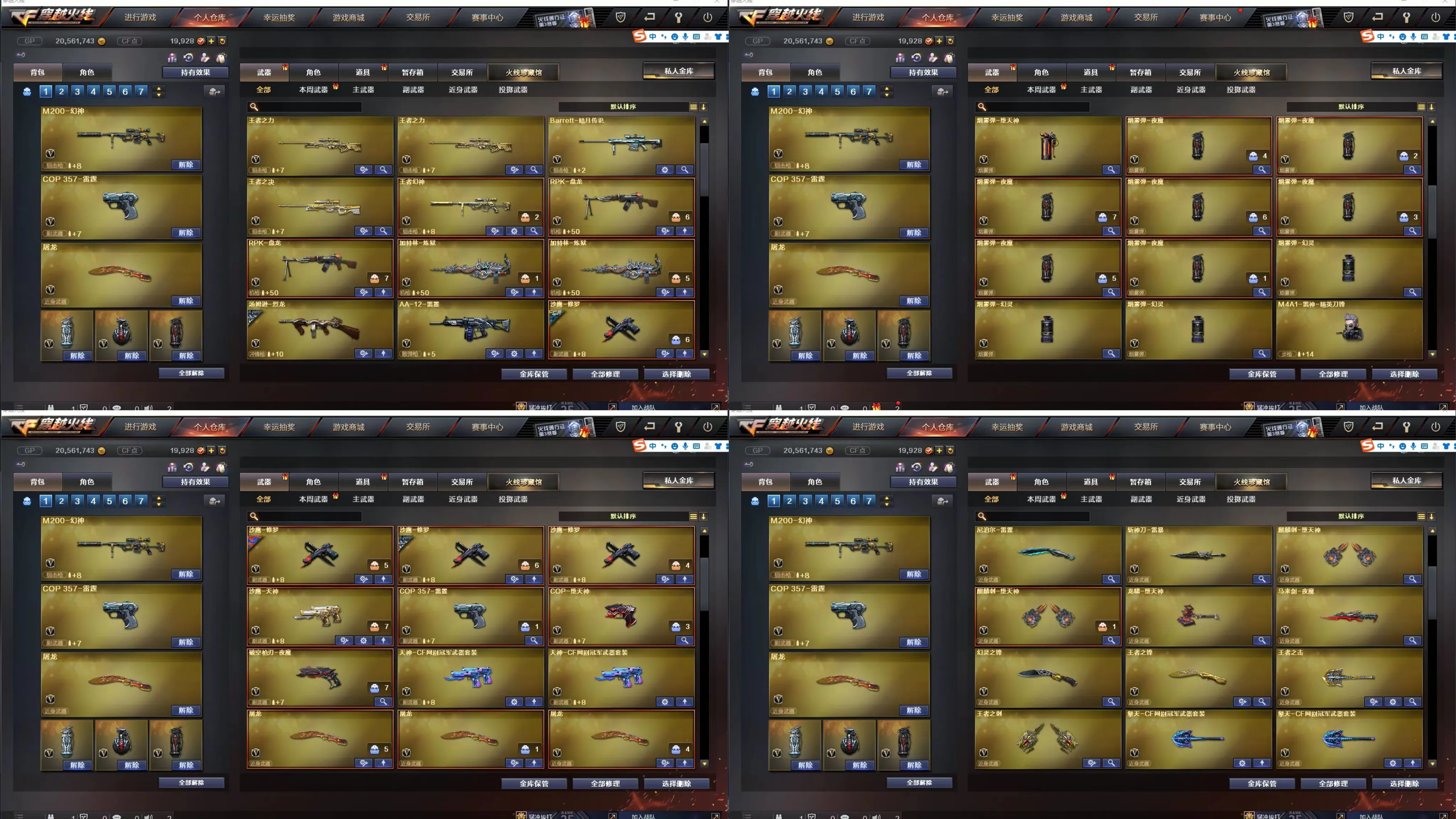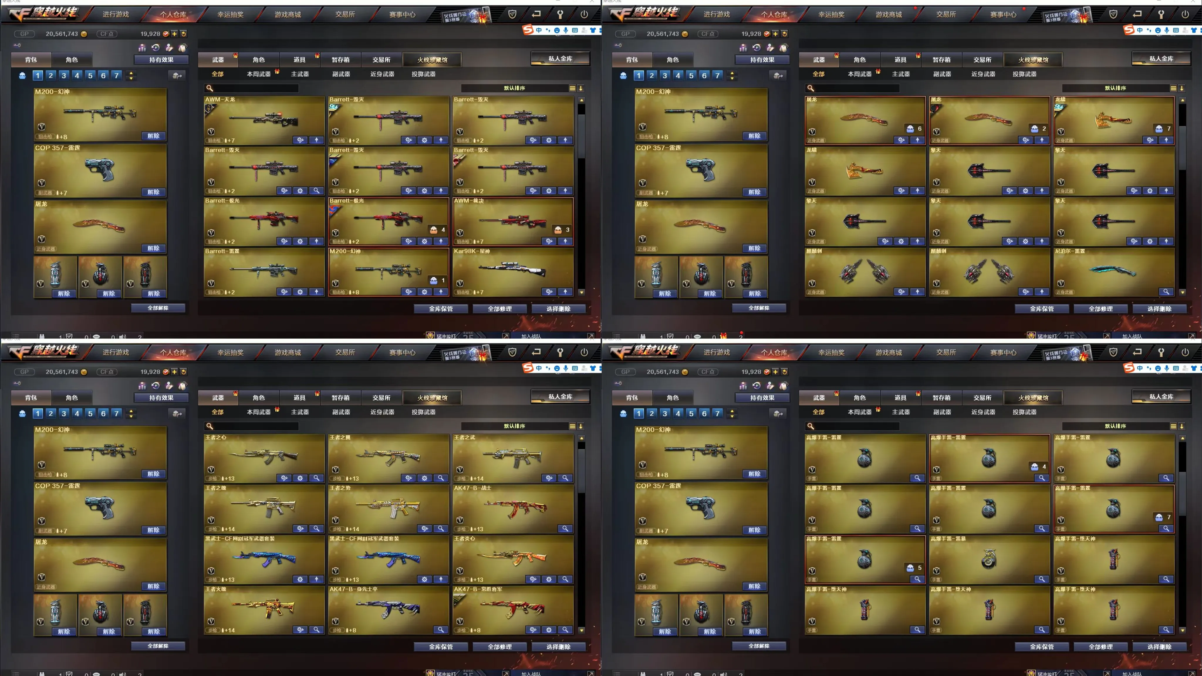 王者之心,王者之翼,王者之武,王者之魄,王者之势,王者炎心,王者火魄,王者之幻,王者之戮,王者之力,王者之决,王者幻神,Barrett-雷 霆王者,王者之怒,王者之灵,王者之魂,王者之锋,王者之击,王者之刺,炫金毁灭,炫金火麒麟,炫金雷神,炫金骑士,炫金武士,98K星神,7修罗,M200-幻神,HK417-朱雀 ,Scar Light-白虎,传说光耀,雷神星空,烈龙星空,毁灭耀金,火麒麟-冠军之心,毁灭冠军之怒,黑龙冠军之武,毁灭-CFS2020,火麒麟轻羽,黑骑士-冠军之势,凌霄,迷迭香,审判者,
