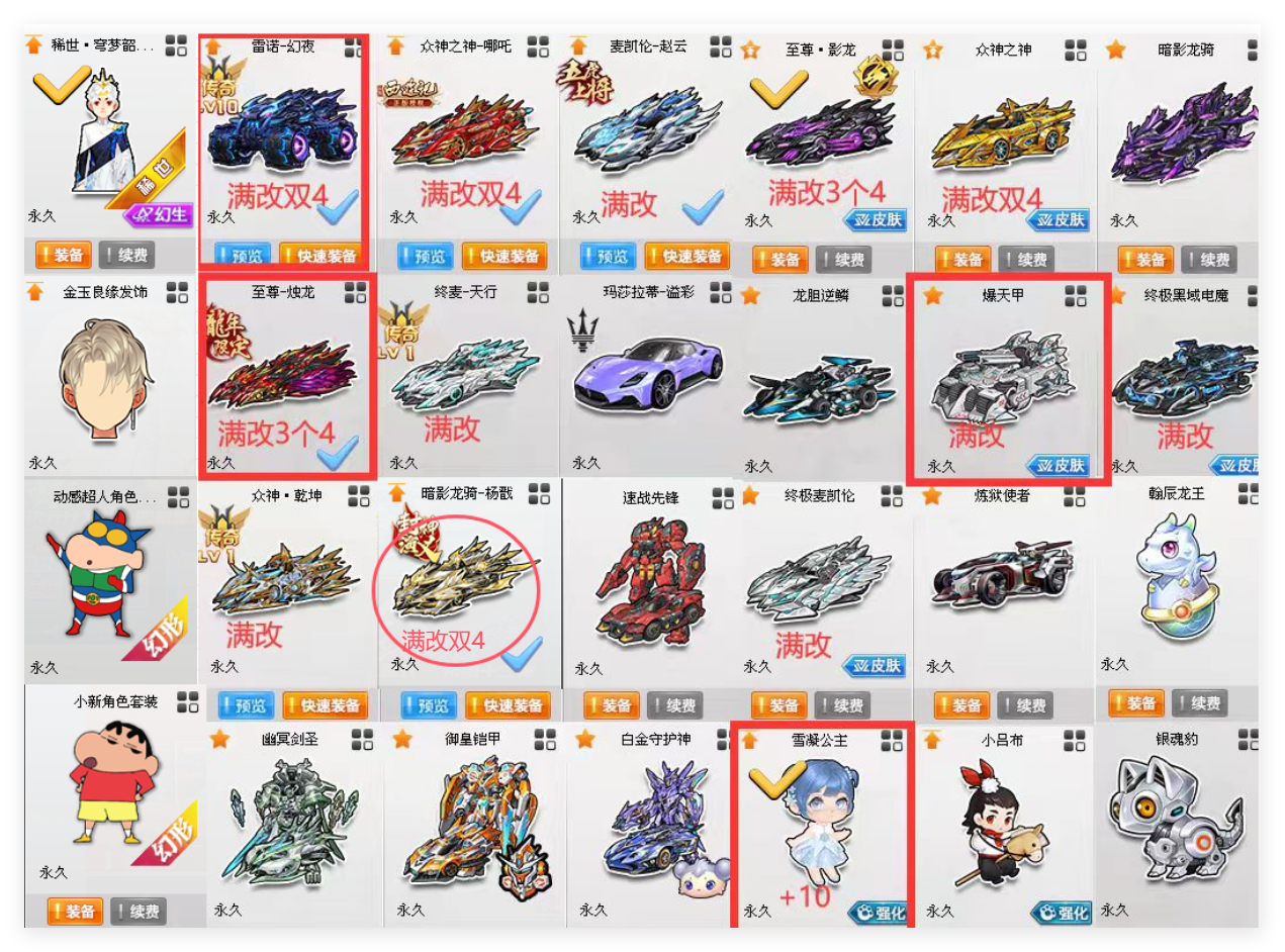 八S叁T2贰T1=3幻套装稀世•穹梦韶宇=影龙烛龙=雷诺幻夜10阶=众神之神哪吒=爆天甲曜影=迈凯伦赵云天行=终极黑域电魔=暗影龙骑=炼狱使者=龙胆逆鳞=雪凝10=男女悬浮套若干小型衣柜男女都有(排位•边境)都可,祝老板游戏愉快,有空常来吖!