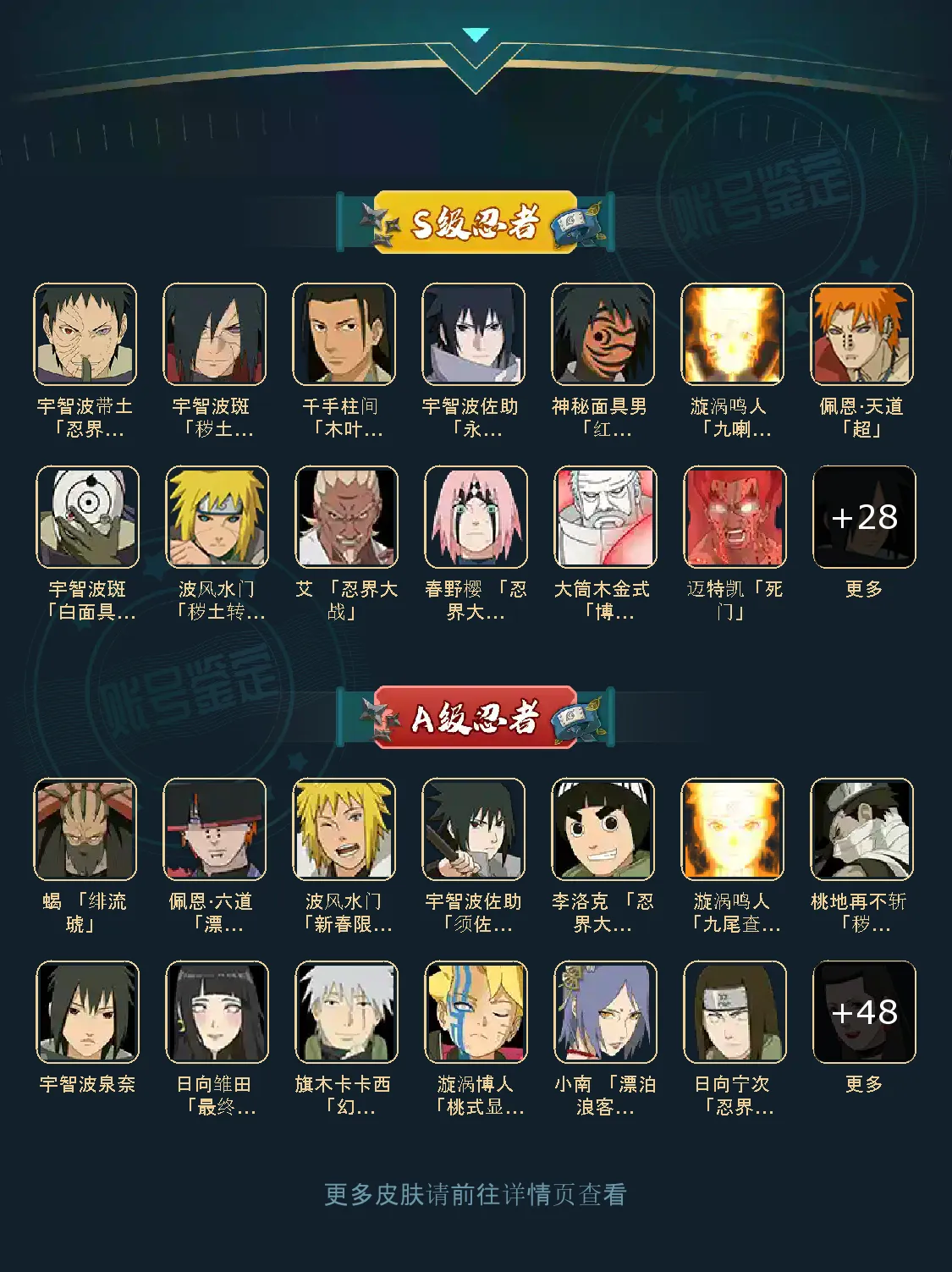 A级忍者(54个):宇智波鼬,飞段「死司凭血」,角帮,飞段,我爱罗「风传」,飞阿斯玛「秽土转生」,波风水门「新春限定」,迪达拉,地再不斩。,迈特凯,猿飞阿斯玛,干柿鬼靛,宇智波止水,小南,旗木卡卡西「万花筒写轮眼」,为都「地怨虎」,漩洲鸣人「仙人模式」,奇拉比,惠村团藏,宇智波佐助「万花筒写轮眼」,猿飞日新「火影维承人」,照美冥「五代目水影」。勘九郎「忍界大战」,春野樱「百豪」,大蛇丸「晓」。秋道丁次「忍界大战」。小南「夏日泳装」,我受罗「忍界大战」,宇智波佐的「疾风传印」,地陆,宇智波「新春限定」药师兜「半蛇斗蓬」,千代「近松十人卫」。角都「晓创生」。涡鸣人「九尾查克拉」。照美冥「夏日泳装」,臻飞本时丸「博人传」,宇智波带土「暴怒」。迪达拉「秽土转生」,加藤断,宇智液佐助「须佐能乎」,黑士「博人传」。奇拉比「忍界大战」。波风水门「青年!,不风。达鲁伊「铺人传」。艾「青年」。恩·六道 「漂泊浪客」,长门「青年」,长十郎 「六代目水影」,不缘,日向宁次「忍界大战」,小南「漂泊浪客1