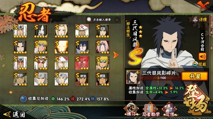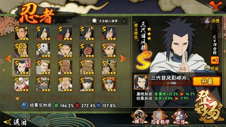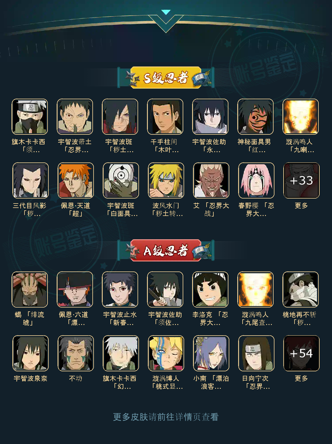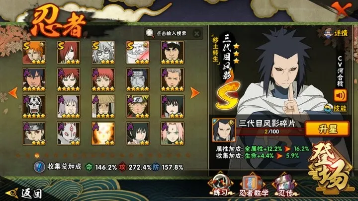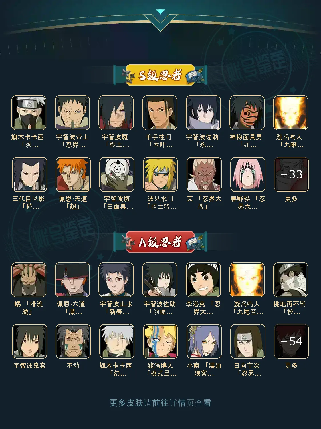 S忍数: 46 A忍数: 61 战力值(万): 2547 贵族等级: V13 战力排行: S级忍者: 千手柱间「秽土转生」,罗砂「四代目风影」,宇智波鼬「秽土转生」,佩恩·天道「超」,药师兜「仙人模式」,宇智波斑.