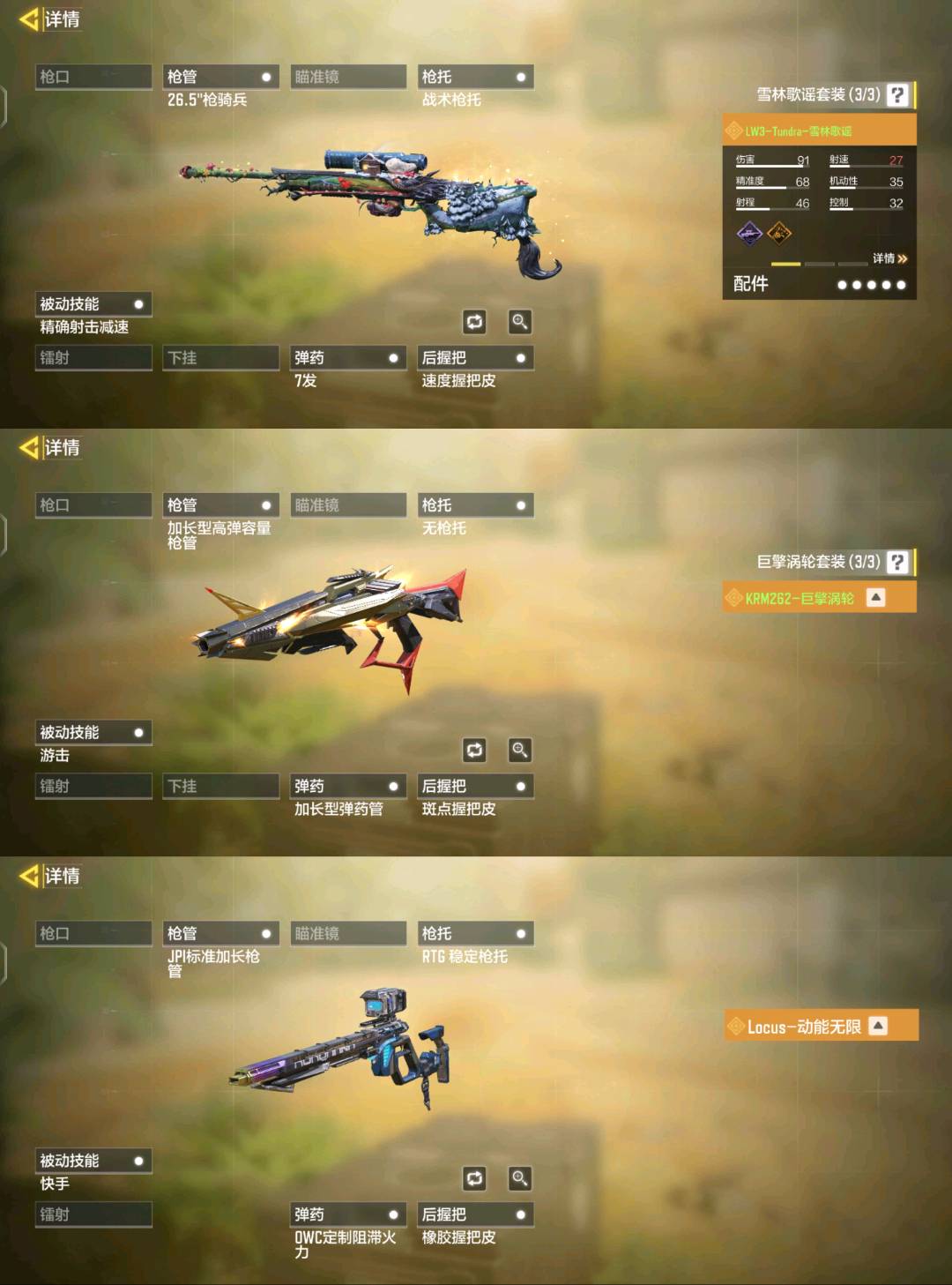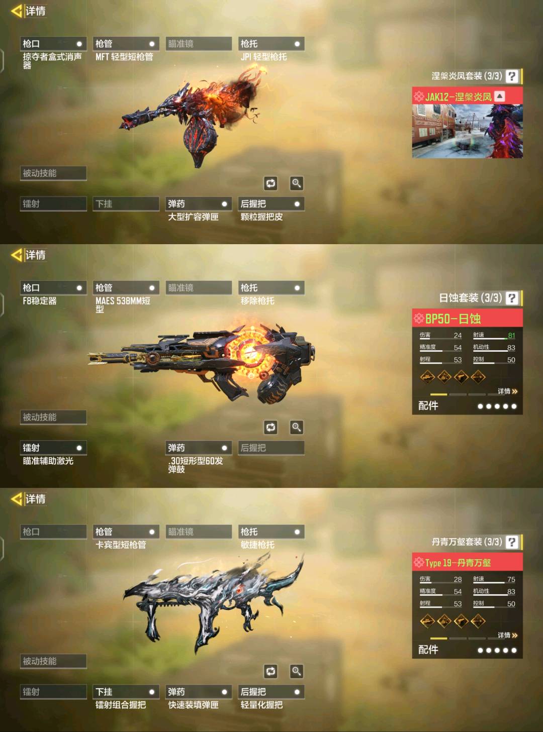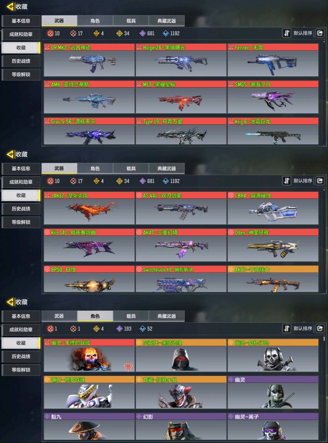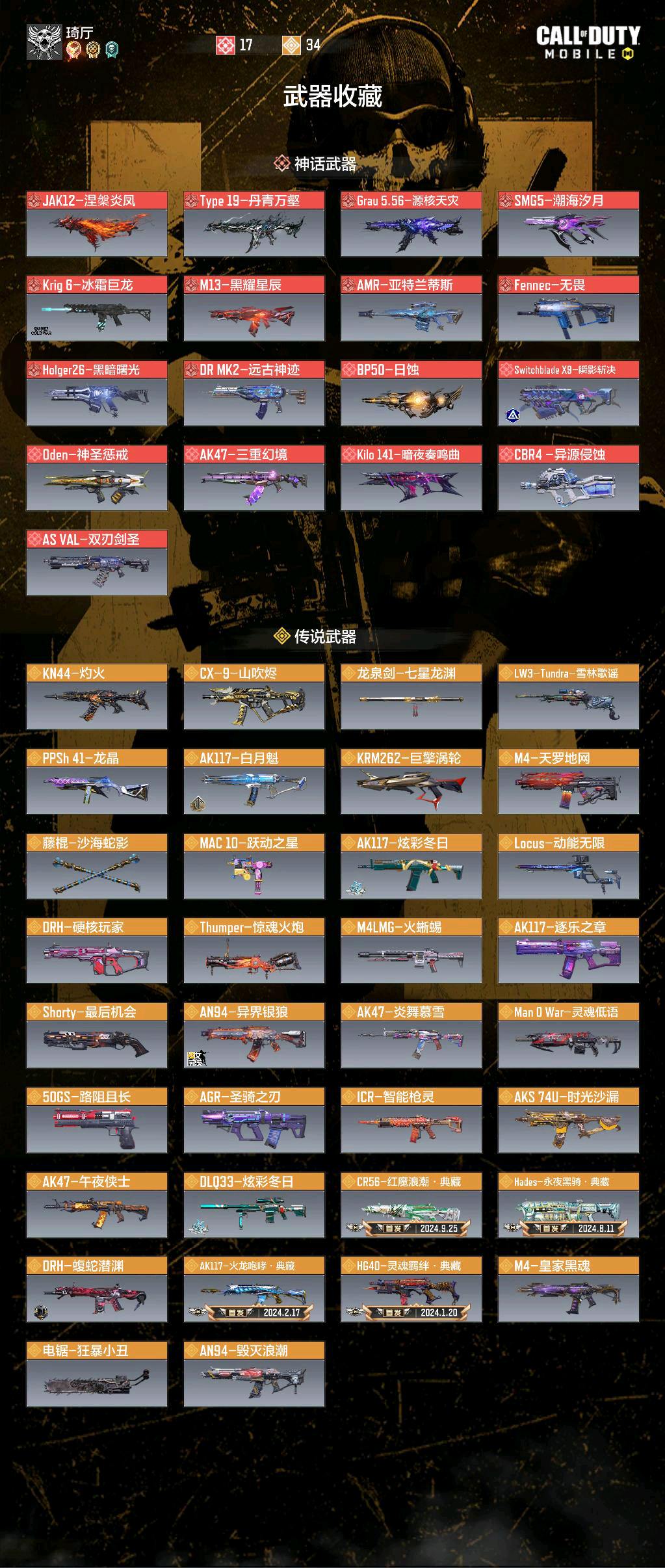 JAK12-涅繁炎凤 Type 19-丹青万壑 Grau 5.56-源核天灾 SMG5-潮海汐月 冰霜巨龙 M13-黑耀星辰 AMR-亚持兰蒂斯 Fennec-无畏 Holger26-黑暗曙光 DR MK2-远古神迹 BP50-日蚀 瞬影斩决 0den-神圣惩戒 AK47-三重幻境 Kilo 141-暗夜奏鸣曲 CBR4-异源侵蚀双刃剑圣