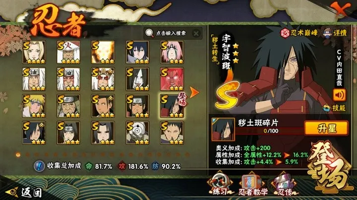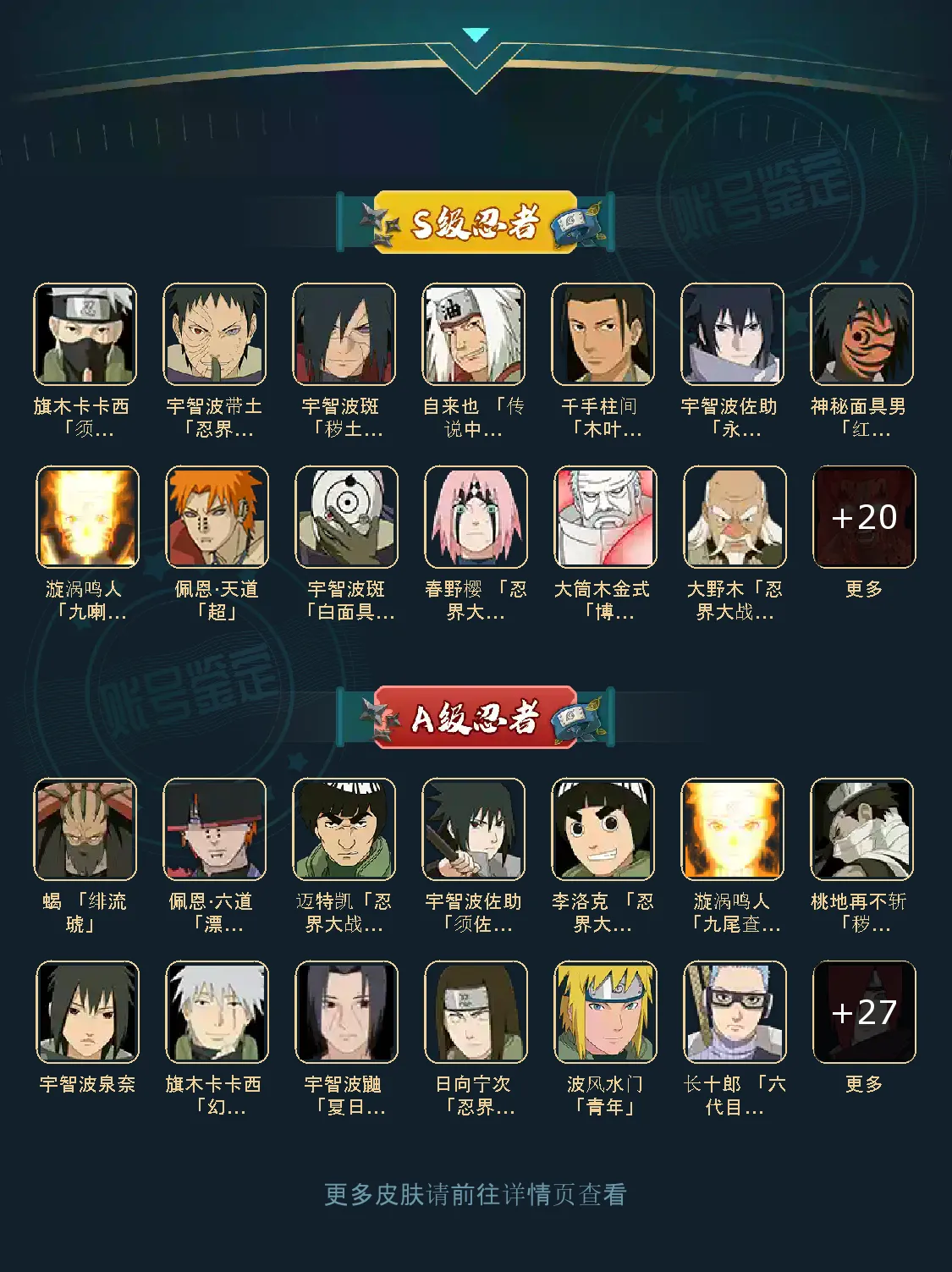 战力:1345W+;VIP11级;S忍30个;A忍29个,通灵兽19个,S忍:普通纲手猿飞日斩九喇嘛鸣人永恒万花筒佐助忍战樱仙人自来也大蛇丸死门凯普通自来也豪杰自来也波风水门秽土猿飞木叶创立柱间秽土柱间秽土斑木叶创立斑须佐鼬秽土鼬白面具忍战