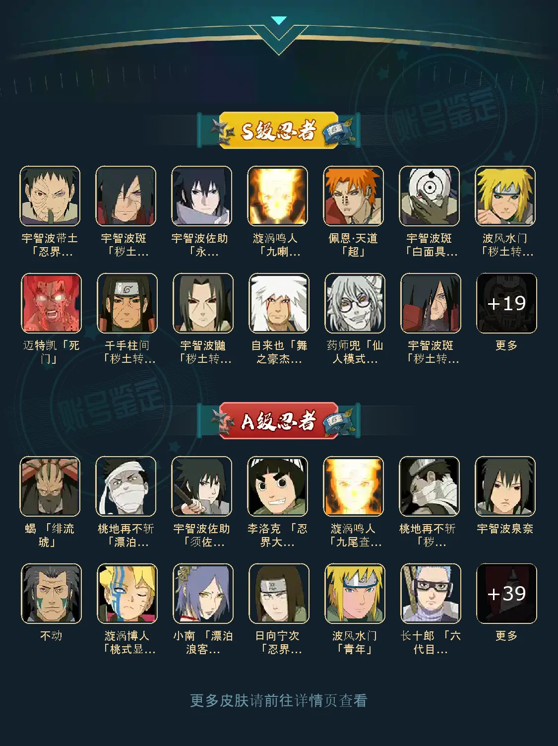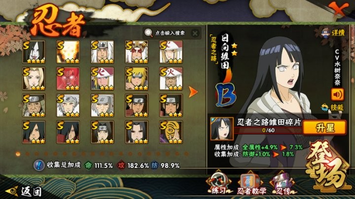 战力:1347W+;VIP12级;S忍28个;A忍44个,通灵兽20个,S忍:大蛇丸九喇嘛鸣人普通自来也豪杰自来也百豪纲手普通纲手死门凯波风水门秽土水门猿飞日斩秽土猿飞秽土扉间千手扉间千手柱间秽土柱间秽土斑宇智波斑须佐鼬秽土鼬神秘面具男白面