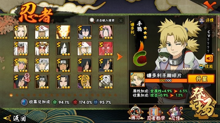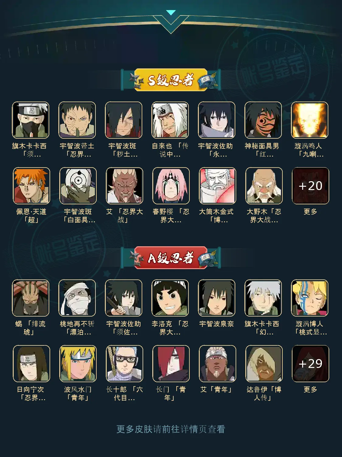 战力:1503W+;VIP13级;S忍28个;A忍34个,通灵兽21个,S忍:普通纲手猿飞日斩九喇嘛鸣人永恒万花筒佐助忍战樱仙人自来也大蛇丸百豪纲手死门凯豪杰自来也波风水门千手扉间秽土柱间秽土斑木叶创立斑秽土解斑须佐鼬秽土鼬神秘面具男白面具