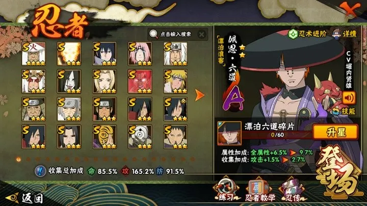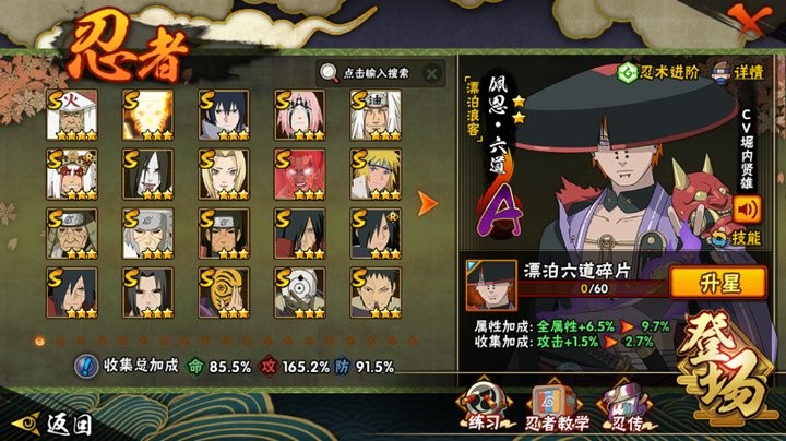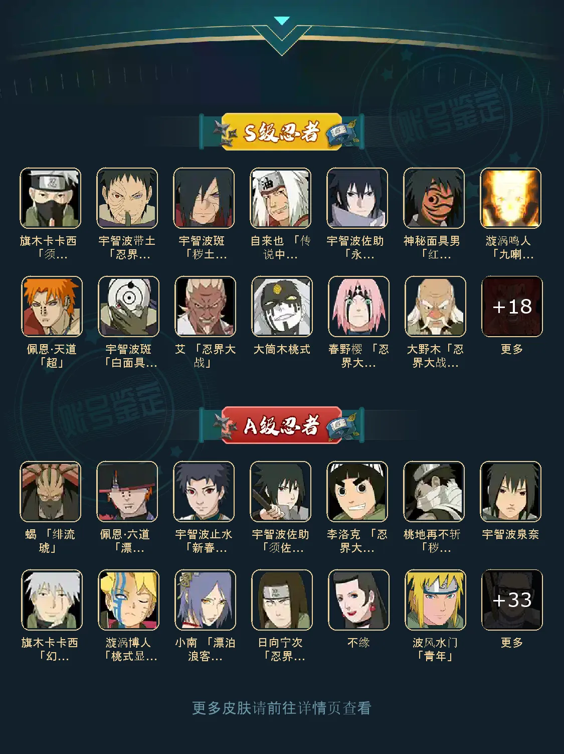 战力:1091W+;VIP11级;S忍30个;A忍36个,通灵兽17个,S忍:猿飞日斩九喇嘛鸣人永恒万花筒佐助忍战樱普通自来也大蛇丸普通纲手死门凯波风水门豪杰自来也秽土猿飞秽土扉间秽土柱间秽土斑木叶创立斑秽土解斑秽土鼬神秘面具男白面具忍战带