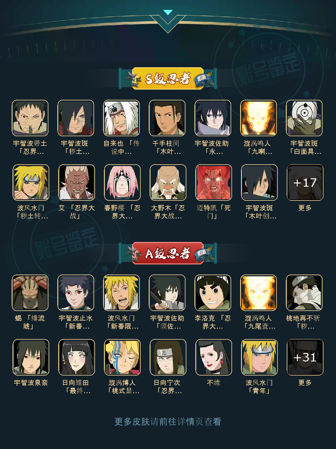 28S/35A//V12/1153W S忍:纲手,九喇嘛,永恒佐助,自来也,仙人自来也,蜀面,大蛇丸,百豪纲手,死门凯,水门,秽土水门,猿飞日斩,秽土三代,秽土扉间,柱间,创立柱间,秽土斑,创立斑,解斑,白面具,忍战带土,忍战大野木,秽土半...展开全部