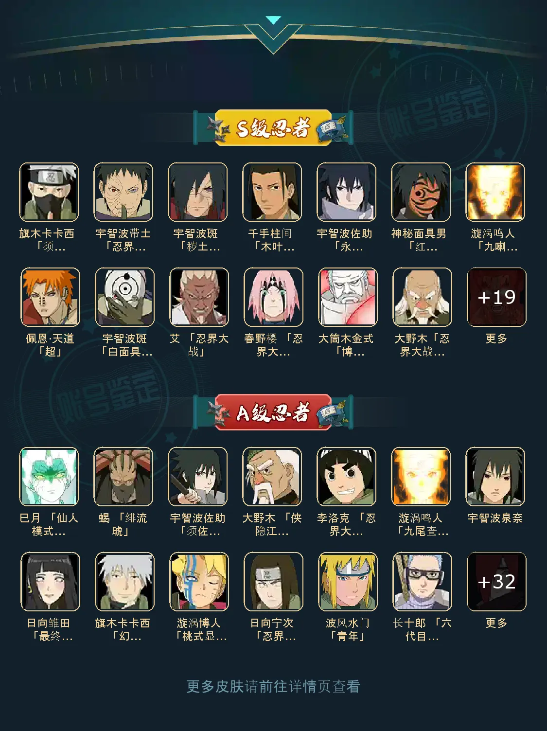 战力:1329W+;VIP11级;S忍28个;A忍34个,通灵兽17个,S忍:普通纲手猿飞日斩九喇嘛鸣人永恒万花筒佐助忍战樱仙人自来也大蛇丸死门凯波风水门豪杰自来也秽土猿飞秽土扉间千手扉间木叶创立柱间秽土柱间秽土斑木叶创立斑秽土解斑须佐鼬秽