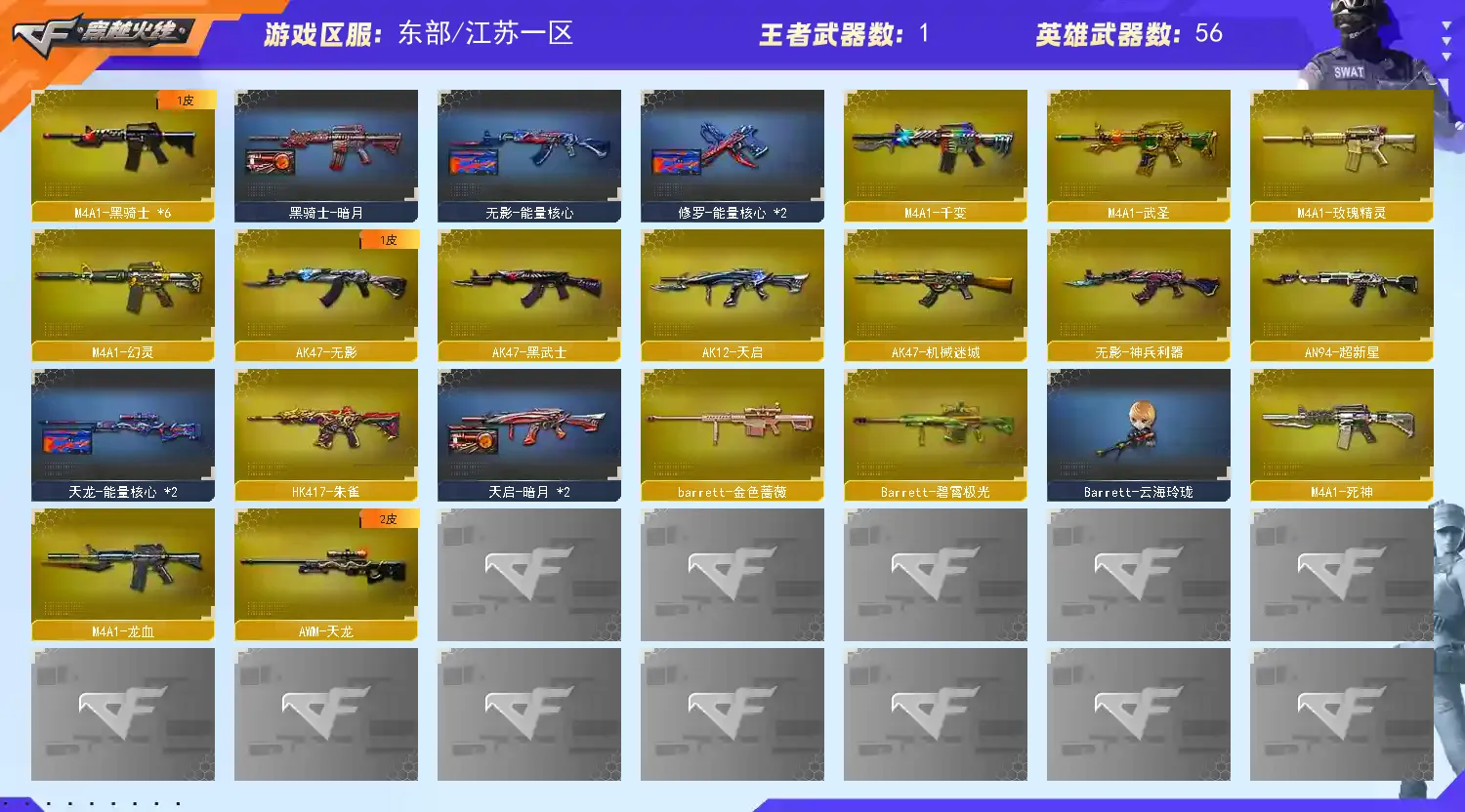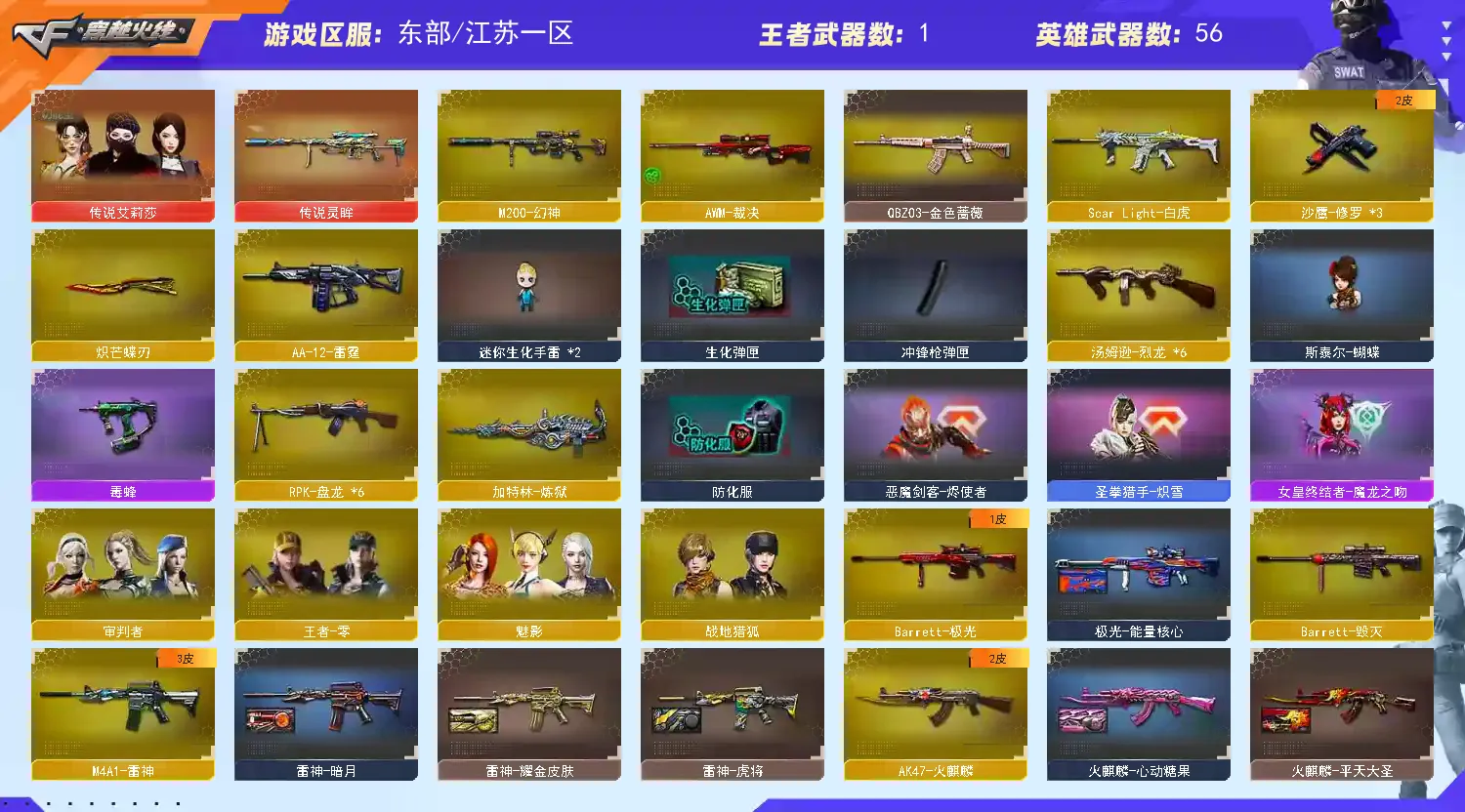 传说灵眸 6盘6烈+斯泰尔蝴蝶+炽芒蝶刃 【重要角色】传说艾莉莎/审判者/魅影/王者-零/胡司令/零-水下丽影【英雄武器】_M200-幻神/Barrett-毁灭/Barrett-极光/barrett-金色蔷薇/AWM-天龙/AWM-裁决/M4A1-雷神/M4A1-死神/M4A1-龙血/M4A1-千变/M4A1-黑骑士(6)/M4A1-武圣/M4A1-幻灵/M4A1-玫瑰精灵/HK417-朱雀/_Scar Light-白虎/AK12-天启/AK47-火麒麟/AK47-无影/无影-神兵利器/AK47-黑武士/AK47-机械迷城/AN94-超新星/QBZ03-金色蔷薇/9A91-烈火/RPK-盘龙(6)/汤姆逊-烈龙(6)/AA-12-雷霆/加特林-炼狱/沙鹰-修罗(3)/麒麟刺/龙啸/擎天(2)/王者之击-觉醒版/屠龙/炽芒蝶刃/Barrett-云海玲珑【重要武器皮肤】极光-能量核心/天龙-能量核心/雷神-虎将/雷神-耀金皮肤/雷神-暗月/黑骑士-暗月/火麒麟-平天大圣/火麒麟-心动糖果/无影-能量核心/天启-暗月/修罗-CFSTAR/修罗-能量核心/天神-暗月