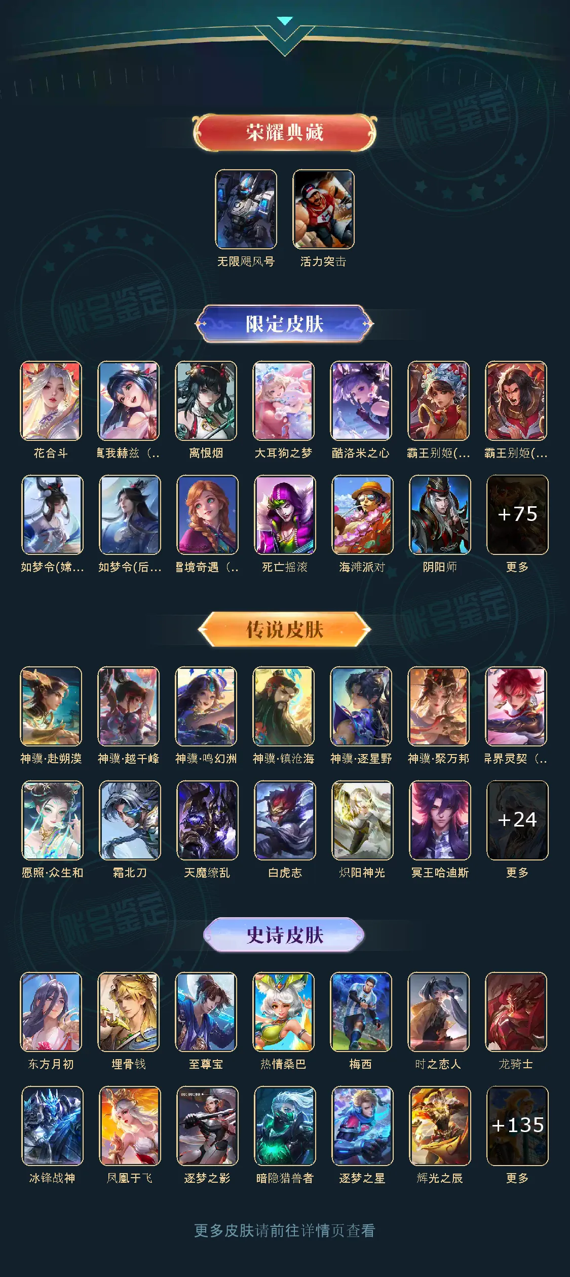贵族等级V10,英雄数量127,典藏皮肤数2,皮肤数量440,冰锋战神/街头霸王/天魔缭乱/至尊宝/王者之锤/凤求凰/热情桑巴/逐梦之影/武陵仙君/梅西/无限飓风号/黄金狮子座/一生所爱/大圣娶亲/冰霜恋舞曲/青龙志/白虎志/朱雀志/活力突击/太华/久胜战神/飞衡/梁祝/龙胆
