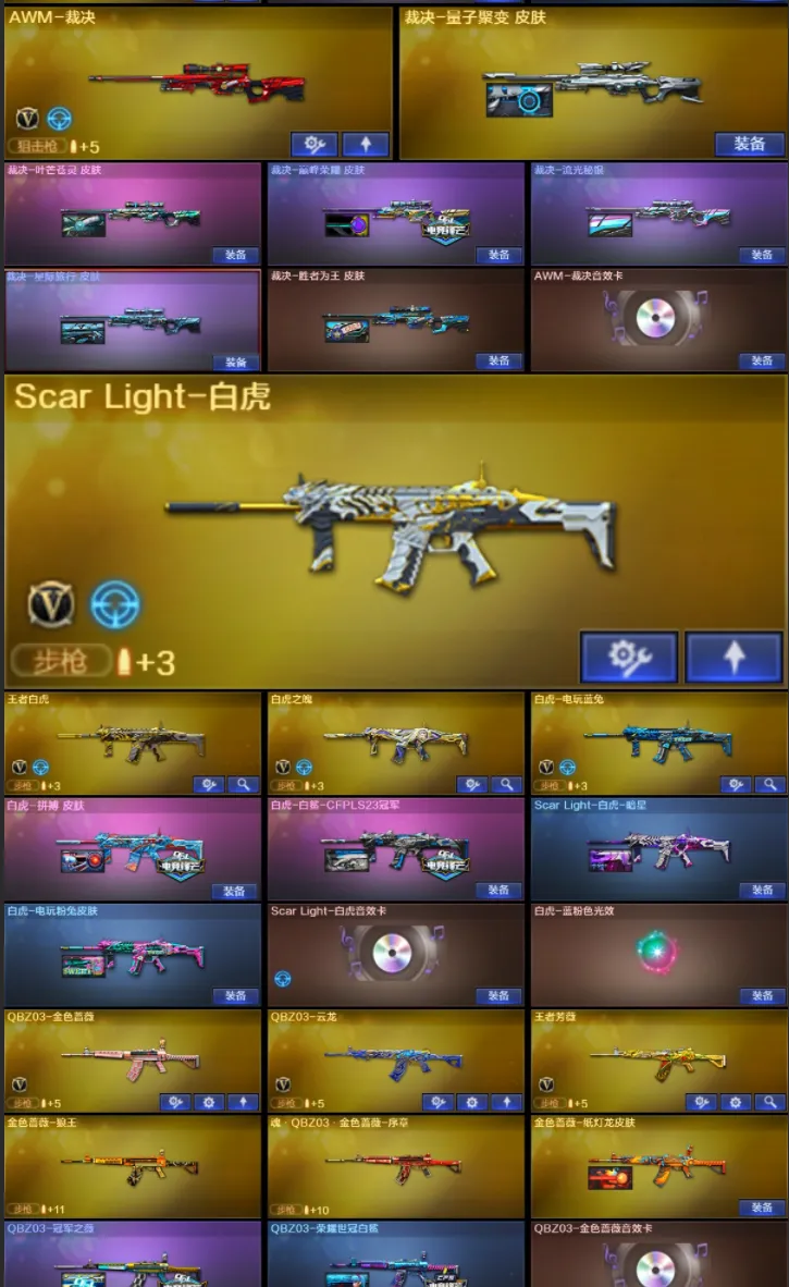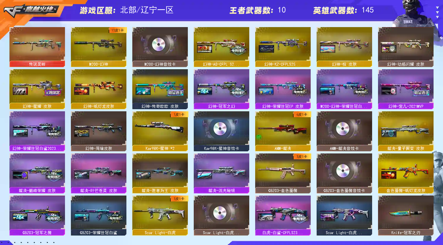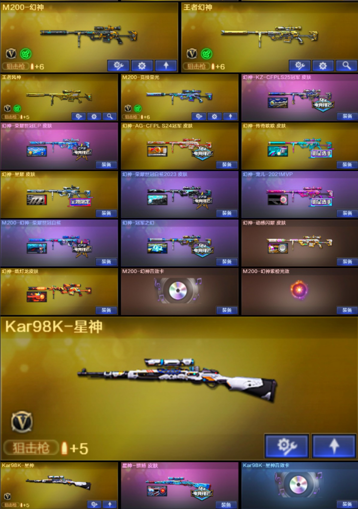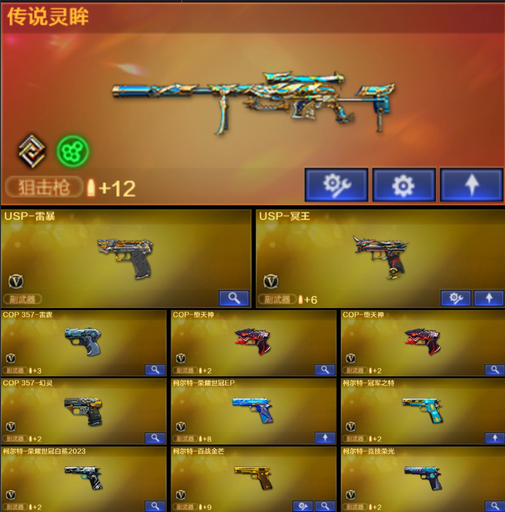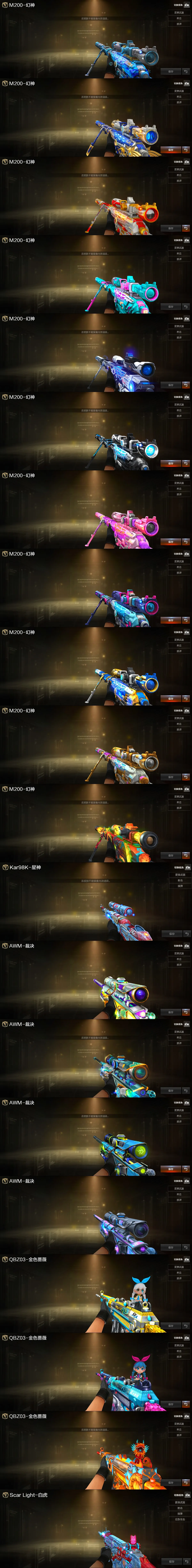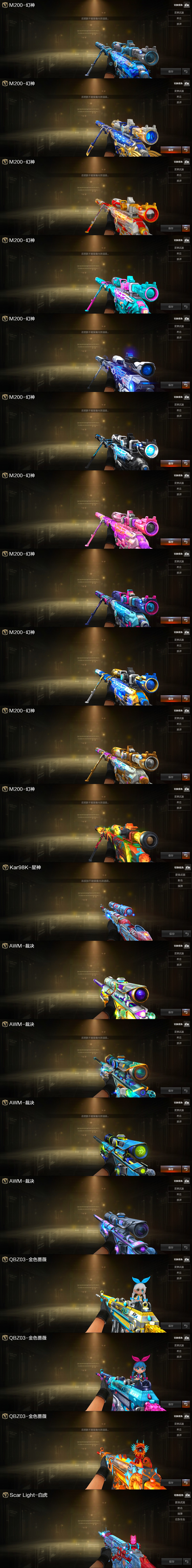 【稀有武器】传说灵眸/M200-幻神/Kar98K-星神(2)/ScarLight-白虎/M14EBR-玄武/M4A1-幻灵/M4A1-堕天神/雷霆之契/USP-雷暴/COP-堕天神(2)/COP357-幻灵/柯尔特-竞技荣光/天神-动感闪耀/柯尔特-荣耀世冠白鲨2023/修罗-古蛇迷踪/柯尔特-冠军之特/金色蔷薇-古蛇迷踪/QBZ03-云龙/QBZ03-金色蔷薇/AK47-火麒麟(2)/M4A1-雷神/M4A1-黑骑士/白虎-电玩蓝兔/Barrett-毁灭/Barrett-极光/AWM-裁决/M200-竞技荣光/汤姆逊-烈龙(4)/AA-12-雷霆/炽芒蝶刃/麒麟刺-堕天神/龙啸-堕天神/幻灵之锋(4)/擎天-竞技荣光
