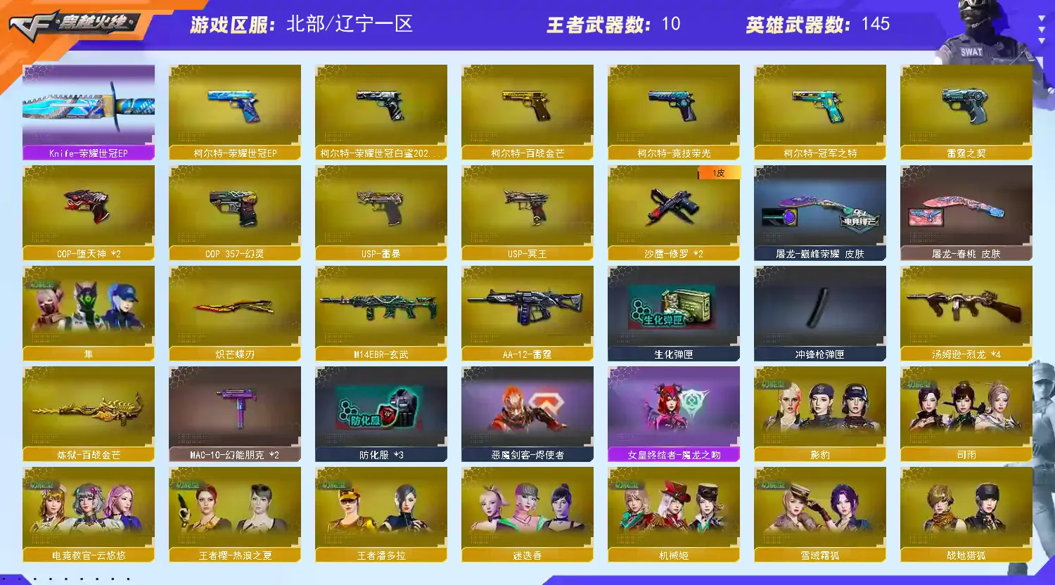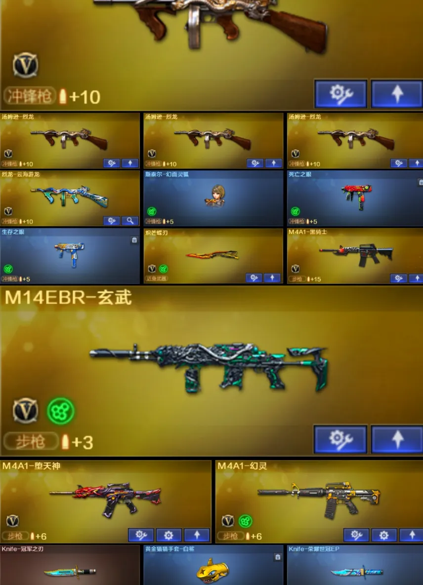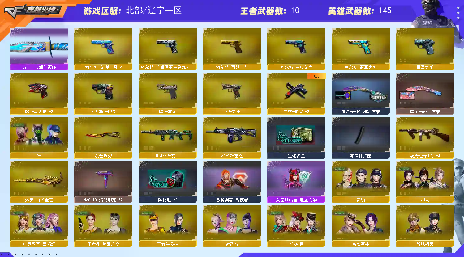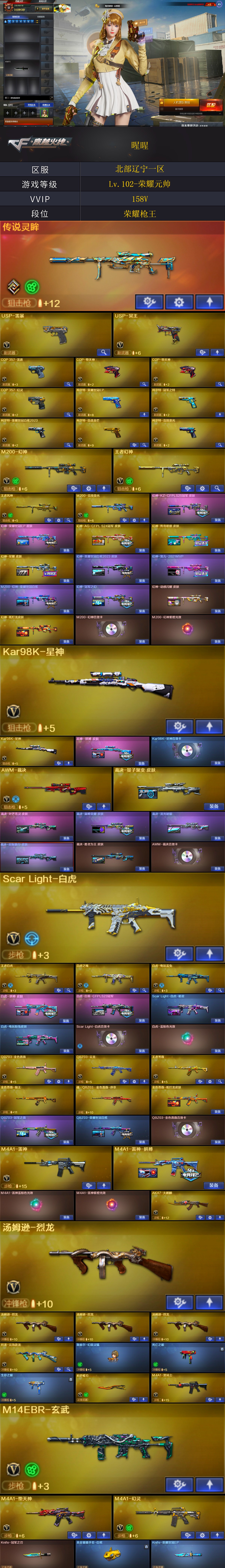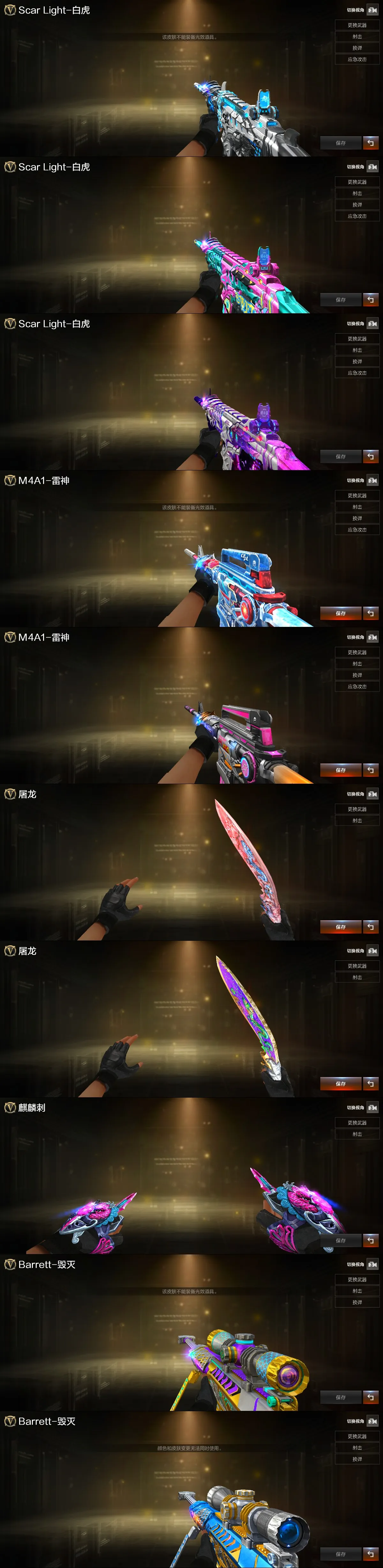 【稀有武器】传说灵眸/M200-幻神/Kar98K-星神(2)/ScarLight-白虎/M14EBR-玄武/M4A1-幻灵/M4A1-堕天神/雷霆之契/USP-雷暴/COP-堕天神(2)/COP357-幻灵/柯尔特-竞技荣光/天神-动感闪耀/柯尔特-荣耀世冠白鲨2023/修罗-古蛇迷踪/柯尔特-冠军之特/金色蔷薇-古蛇迷踪/QBZ03-云龙/QBZ03-金色蔷薇/AK47-火麒麟(2)/M4A1-雷神/M4A1-黑骑士/白虎-电玩蓝兔/Barrett-毁灭/Barrett-极光/AWM-裁决/M200-竞技荣光/汤姆逊-烈龙(4)/AA-12-雷霆/炽芒蝶刃/麒麟刺-堕天神/龙啸-堕天神/幻灵之锋(4)/擎天-竞技荣光