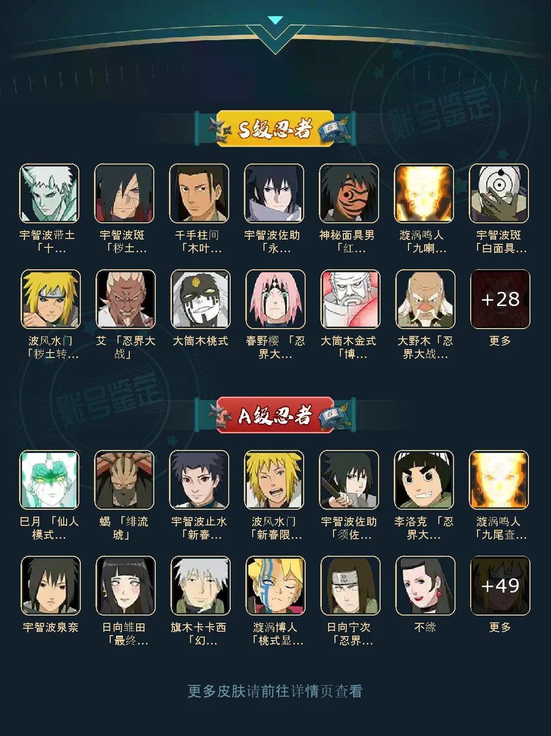 40S/55A//V14/1645W S忍;大蛇丸 纲手 水门 秽土水门 九喇嘛 须佐佐助 忍战樱 自来也 百豪纲手 死门凯 秽土袁飞 秽土扉间 千手扉间 千手柱间 秽土柱间 创立柱间 宇智波斑 秽土斑 解斑 须佐鼬 秽土鼬 虎皮 白面 红夜 幻月 四代艾 三代艾 金角 大野木 无 忍战大野木 半藏· 佩恩 长门 仙人兜 金氏 A忍;须佐佐助 鸡翅佐助 忍战宁次 终章雏田 新春水门 显现博人