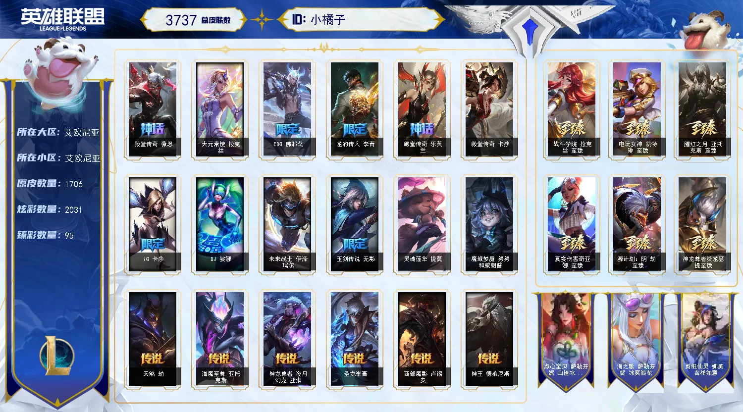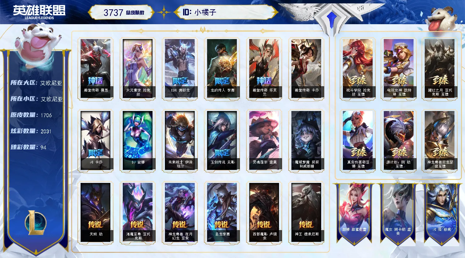 【特价】█3737皮█海克斯满级█允许排位█艾欧尼亚█94臻彩█踏雪寻梅█马年限定█龙虾█手办猫猫头