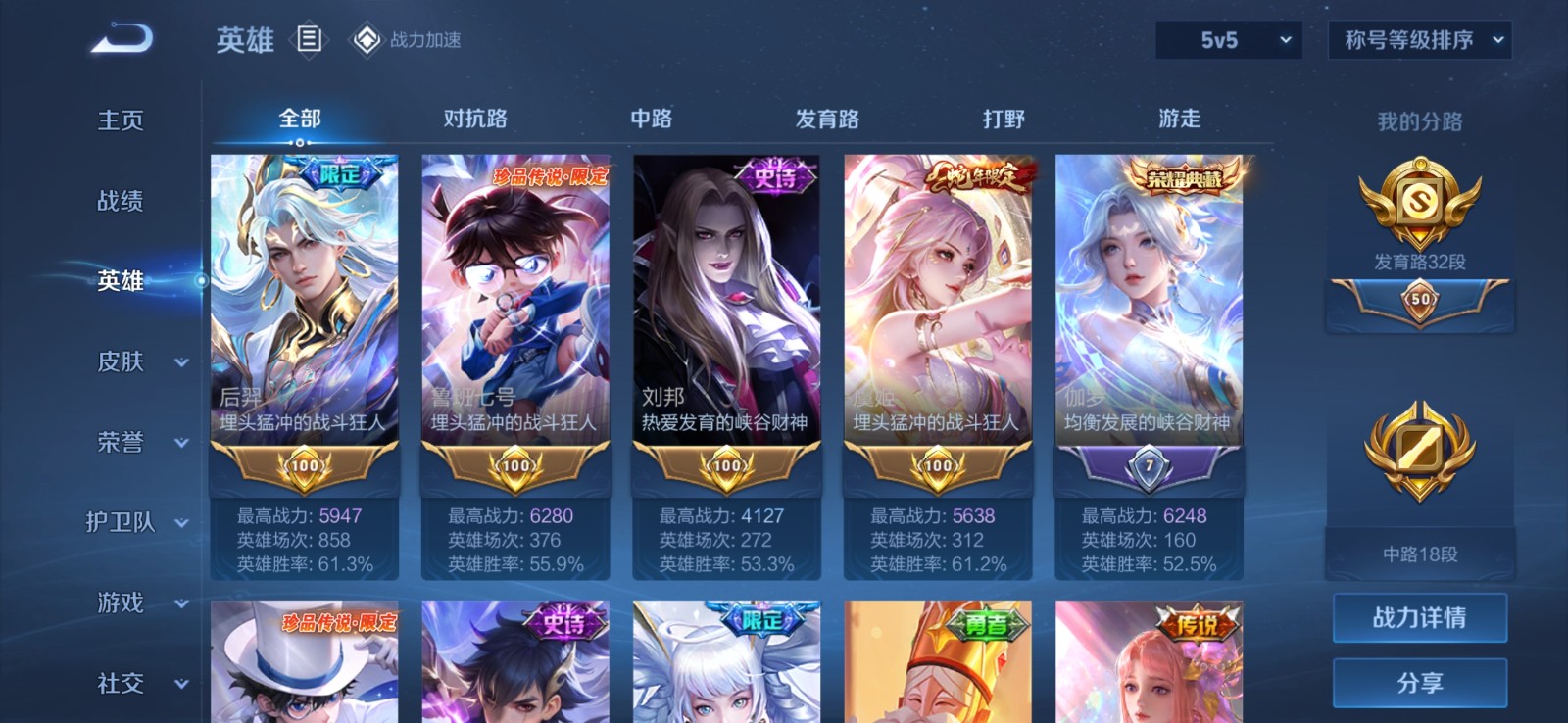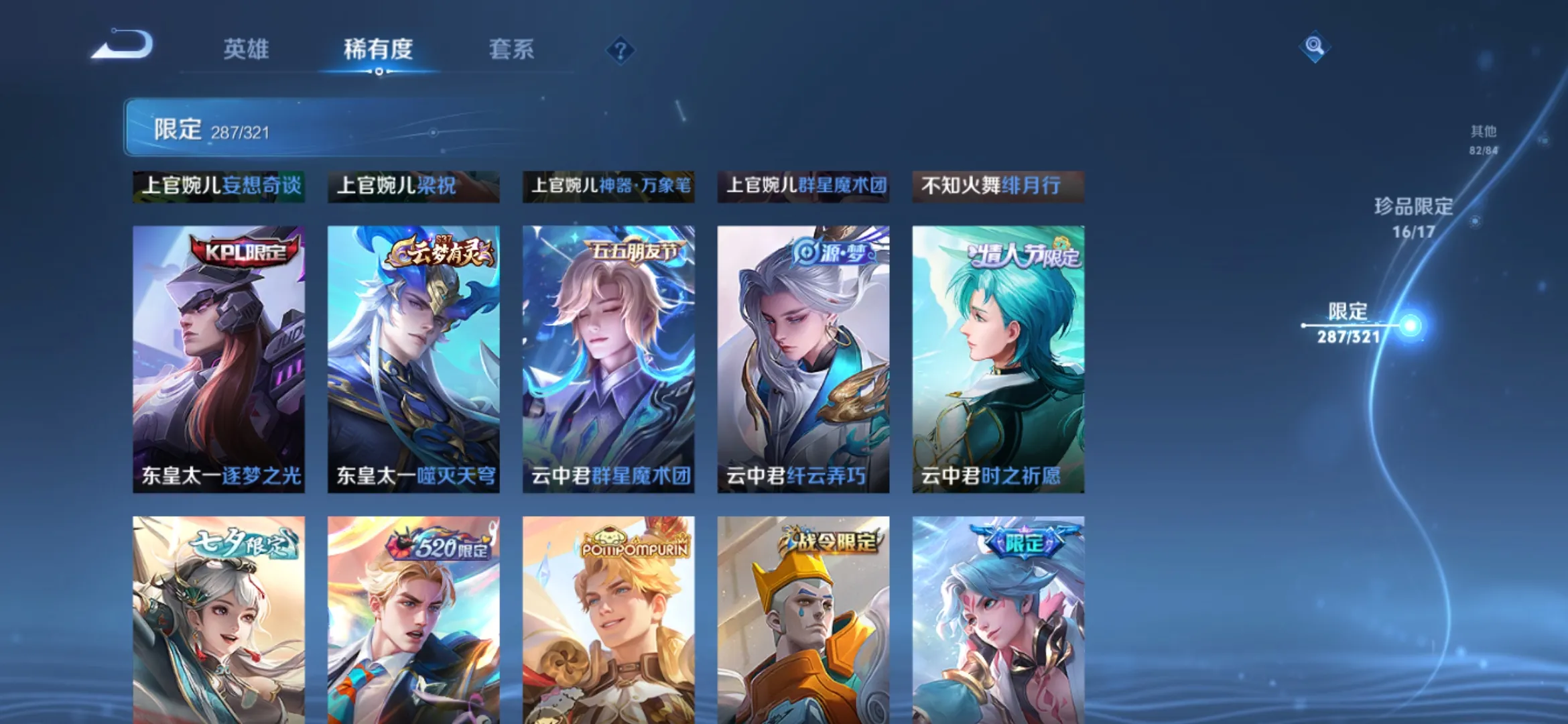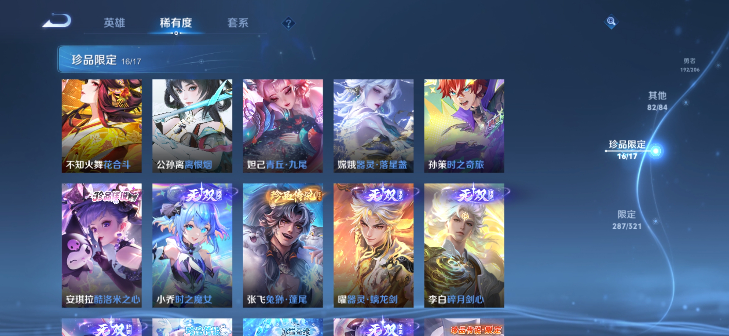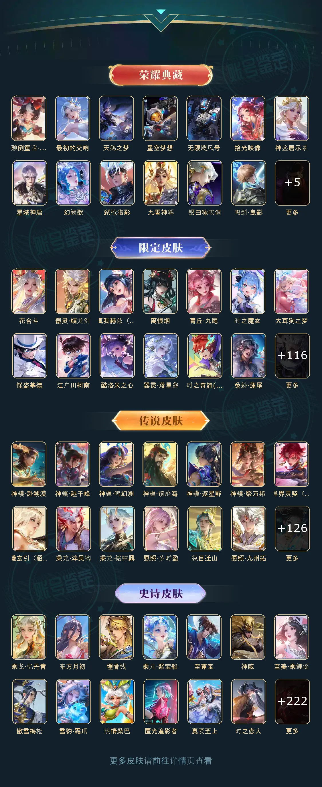 贵族等级V10无双贵族,英雄数量125,典藏皮肤数16,皮肤数量670,冰锋战神/街头霸王/天鹅之梦/至尊宝/真爱至上/王者之锤/大秦宣太后/逐梦之影/神奇女侠/星空梦想/无限飓风号/黄金狮子座/一生所爱/全息碎影/大圣娶亲/冰霜恋舞曲/青龙志/白虎志/朱雀志/活力突击/太华/久胜战神/飞衡/梁祝/白鹤梁神女/匿光追影者/鸣剑·曳影/遇见胡旋/龙胆/星域神启/李逍遥/武圣/奔雷神使/孙行者/玉兔公主/补天/异界灵契/神威/傲雪梅枪/淬星耀世/时雨天司