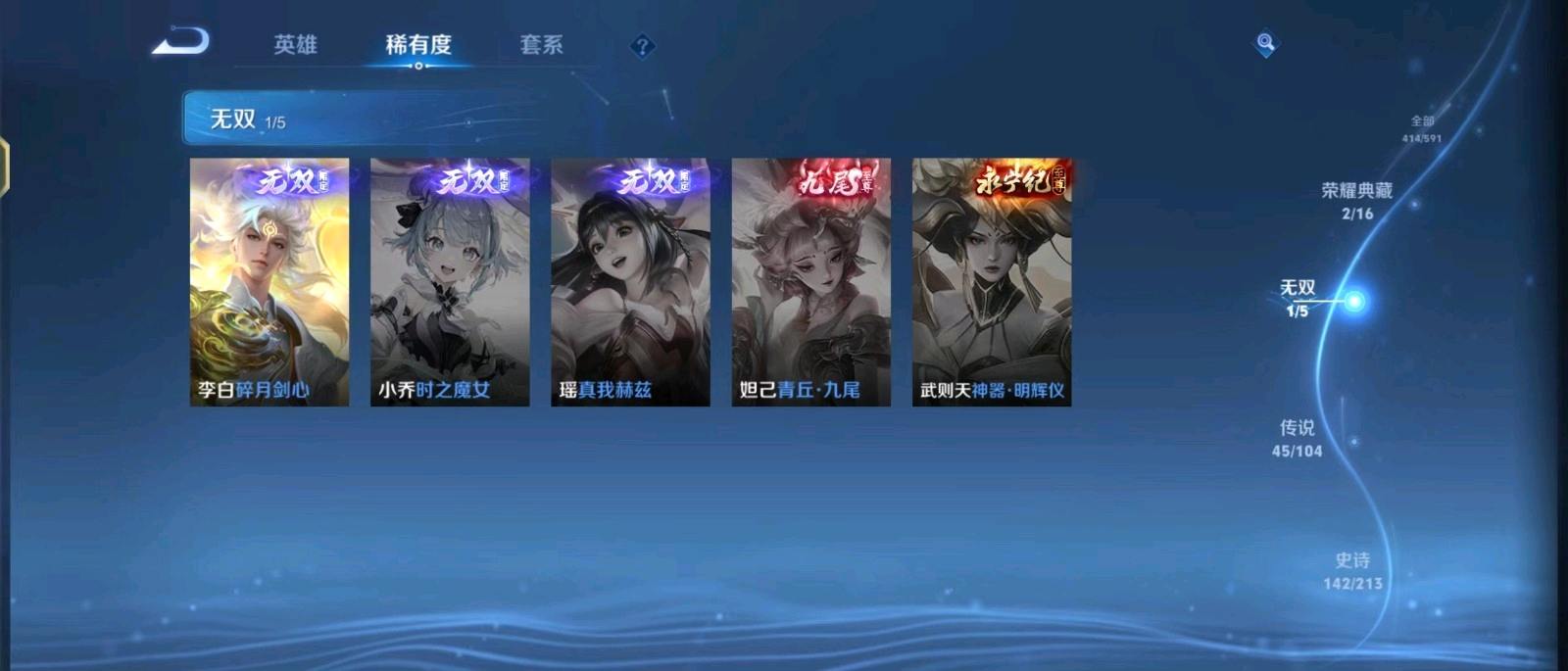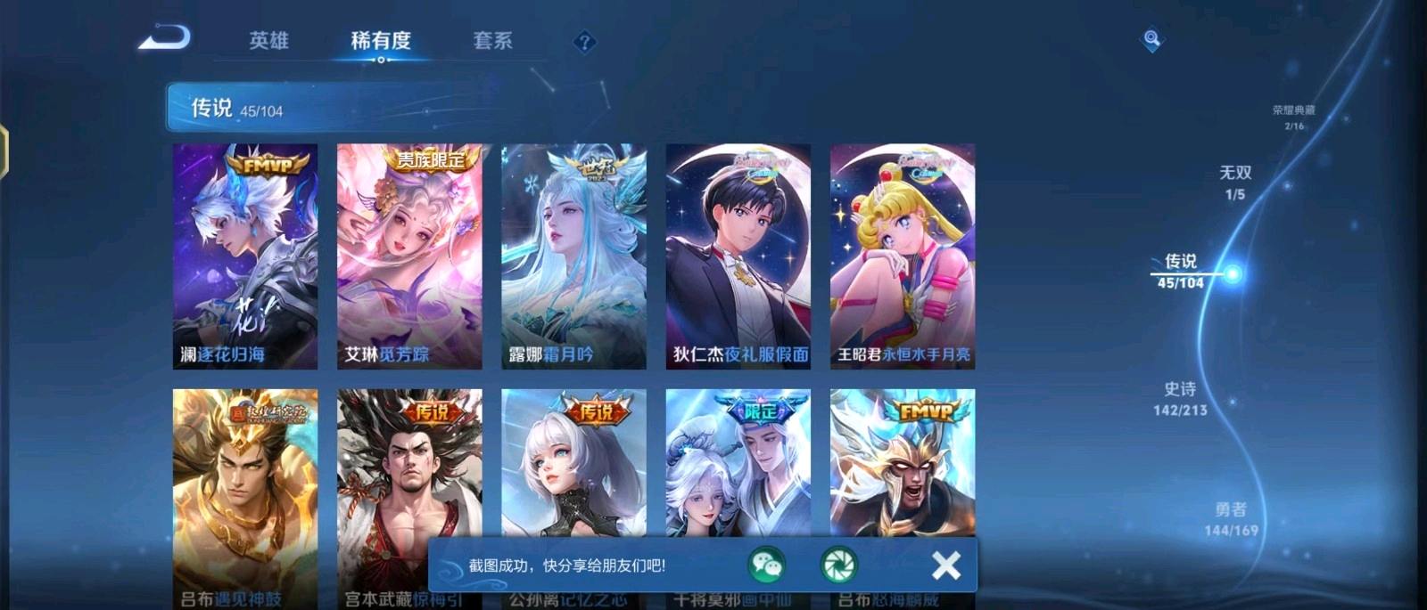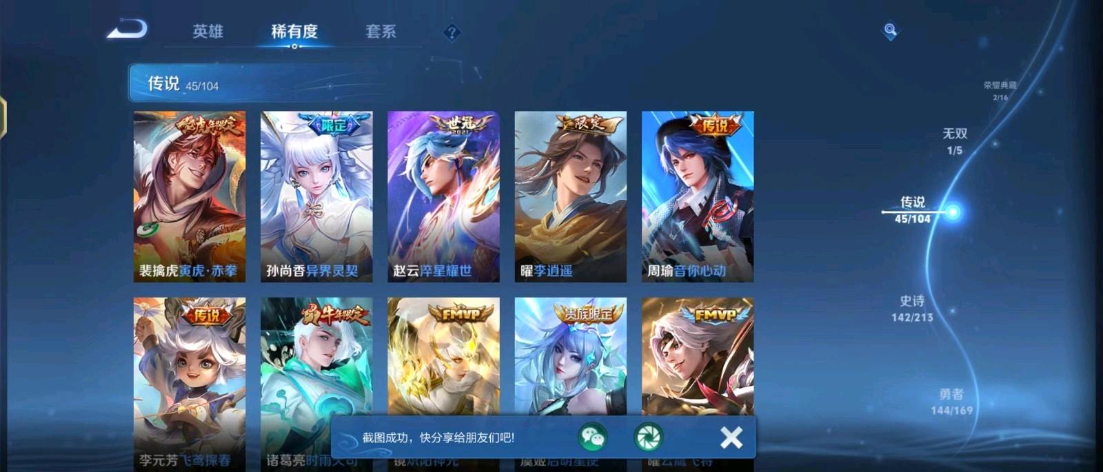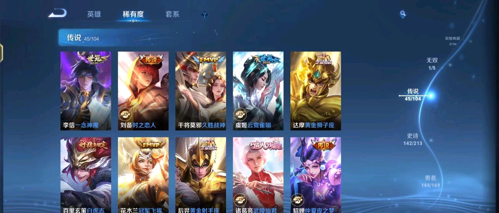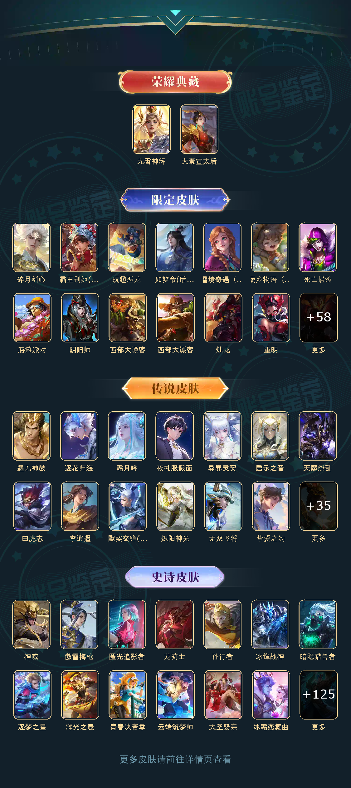 贵族等级V10,段位荣耀王者,英雄数量122,典藏皮肤数2,皮肤数量427,天魔缭乱/青龙志/白虎志/朱雀志/久胜战神/飞衡/匿光追影者/无双飞将/遇见神鼓/李逍遥/逐花归海/琥珀纪元(伽罗)/霜月吟/夜礼服假面/玉兔公主/补天/惊梅引/异界灵契/神威/炽阳神光/启示之音/九霄神辉/傲雪梅枪/时雨天司/天魔缭乱/青龙志/白虎志/朱雀志/久胜战神/飞衡/匿光追影者/无双飞将/遇见神鼓/李逍遥/逐花归海/琥珀纪元(伽罗)/霜月吟/夜礼服假面/玉兔公主/补天/惊梅引/异界灵契/神威/炽阳神光/启示之音/九霄神辉/傲雪梅枪/时雨天司