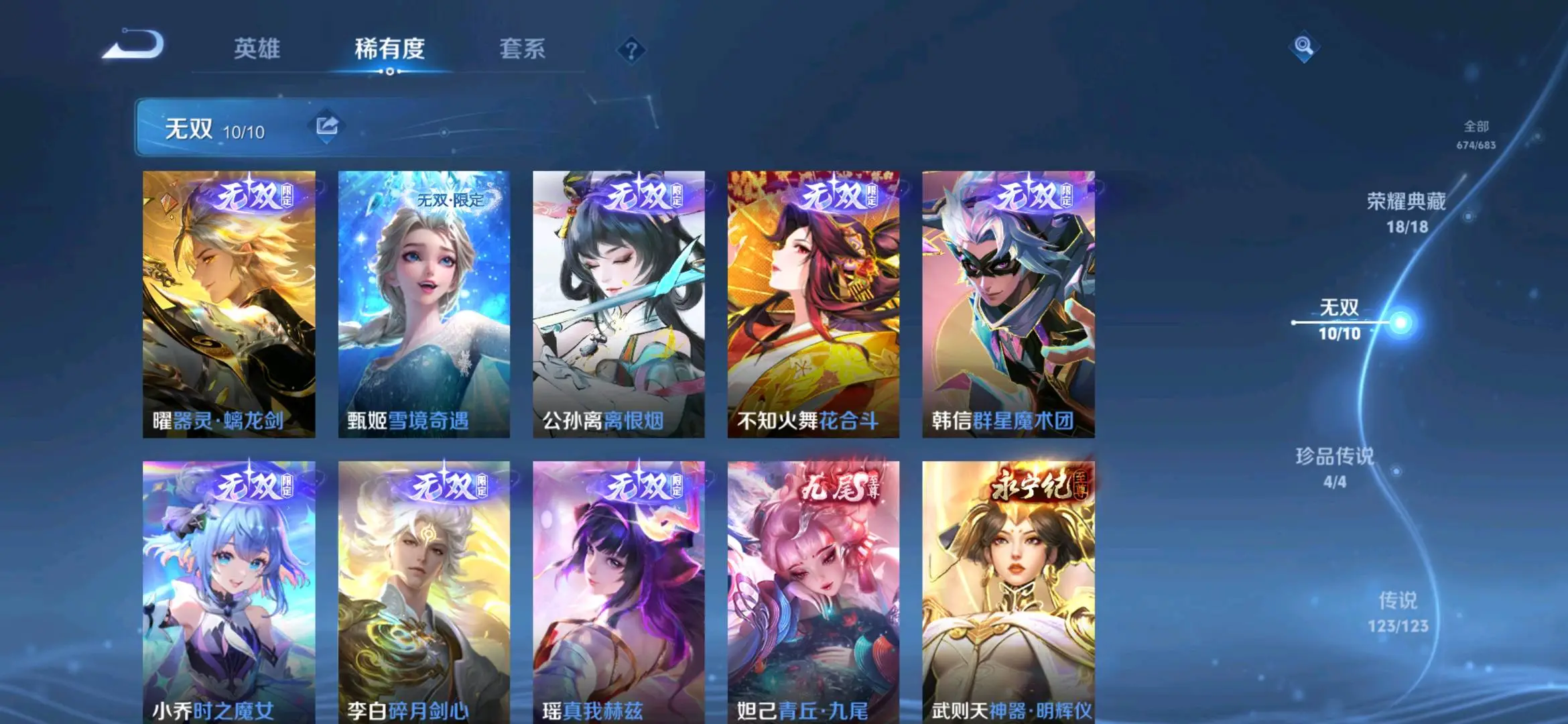恶意掉信誉分永久拉黑!贵族等级V10,英雄数量122,典藏皮肤数20,皮肤数量777,冰锋战神/街头霸王/天鹅之梦/纯白花嫁/天魔缭乱/至尊宝/杀手不太冷/真爱至上/圣诞老人/王者之锤/大秦宣太后/凤求凰/热情桑巴/逐梦之影/武陵仙君/神奇女侠/星空梦想/梅西/无限飓风号/黄金狮子座/一生所爱/全息碎影/大圣娶亲/冰霜恋舞曲/青龙志/白虎志/朱雀志/活力突击/太华/久胜战神/飞衡/梁祝/倪克斯神谕/白鹤梁神女/匿光追影者/鸣剑·曳影/遇见胡旋/龙胆/星域神启/李逍遥/武圣/奔雷神使/孙行者/玉兔公主/补天/异界灵契/神威/启示之音/傲雪梅枪/淬星耀世/时雨天司
