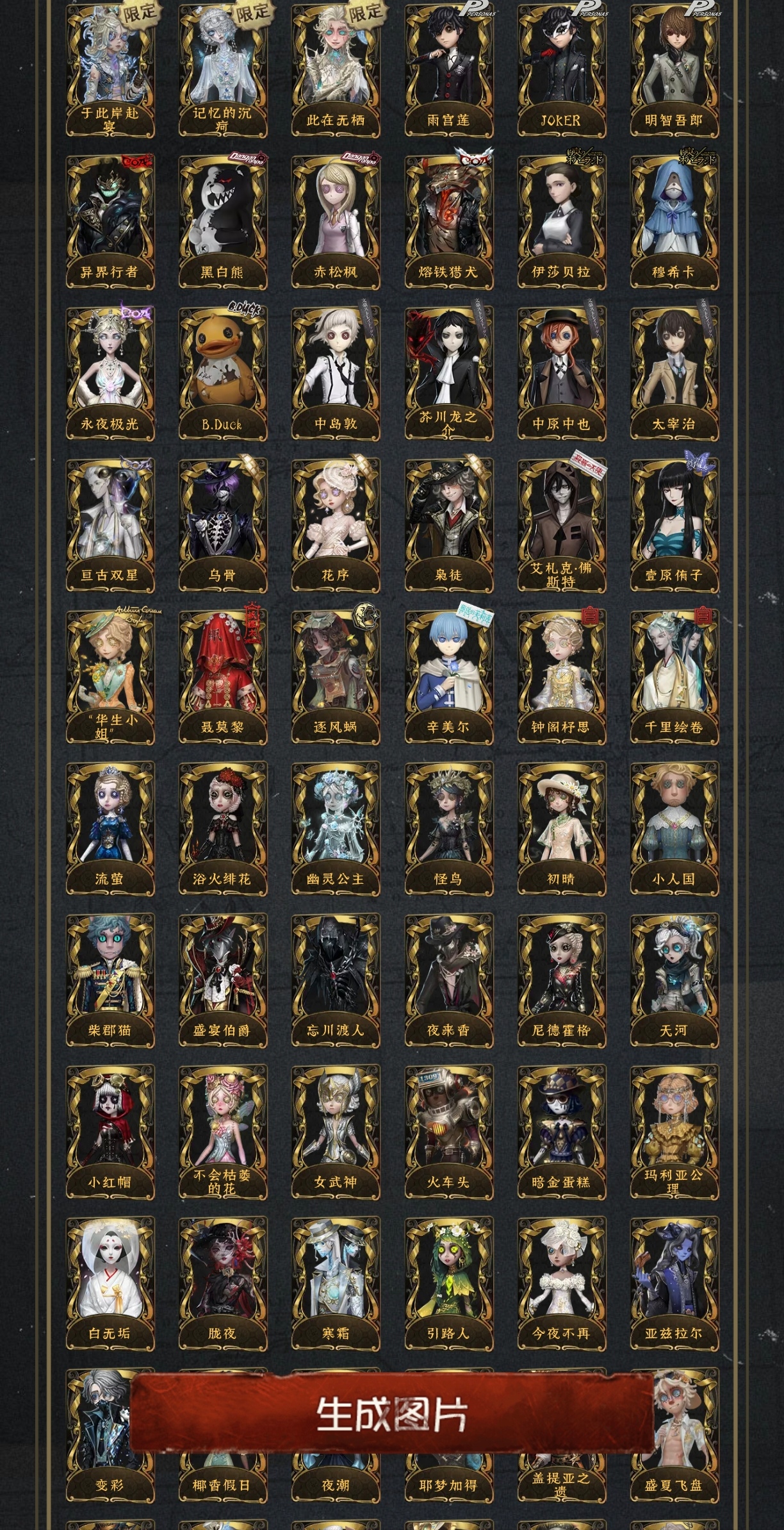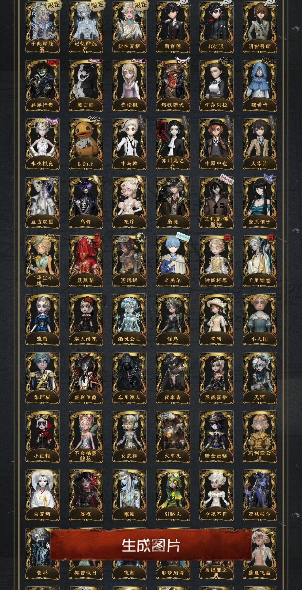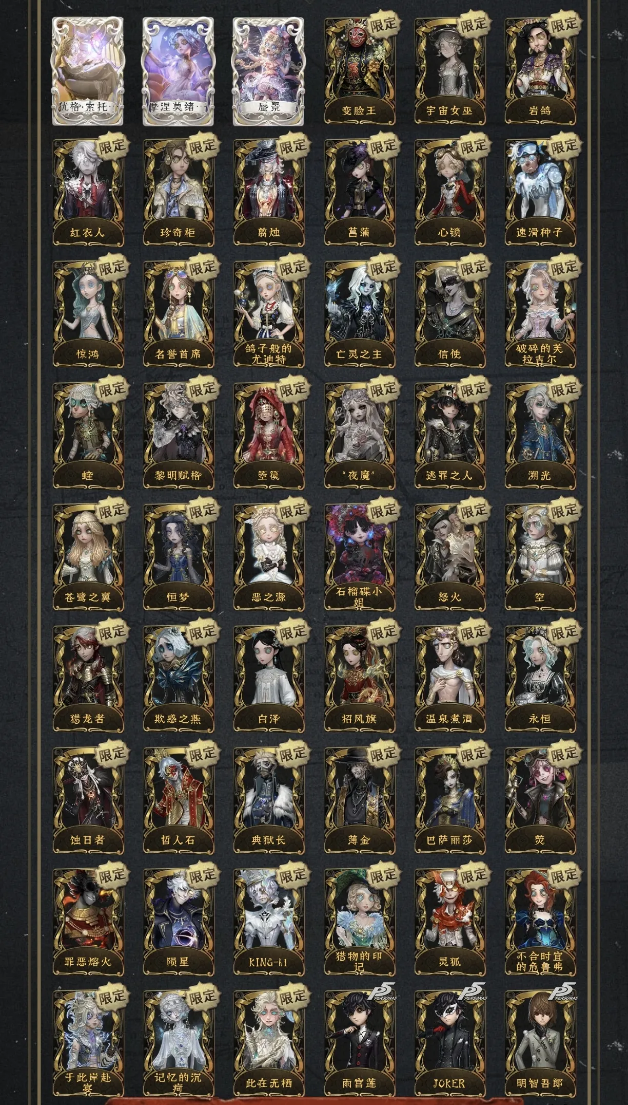 小绵羊恶之源 调香师鸽子 病患逃罪之人 心理学家苍鹭之翼 拉拉队员荧 雕像师夜魔 佣兵珍奇柜红衣人 火灾调查员灵狐 温泉煮酒 典狱长 箜篌等等伴生金一限二限定金联动金等