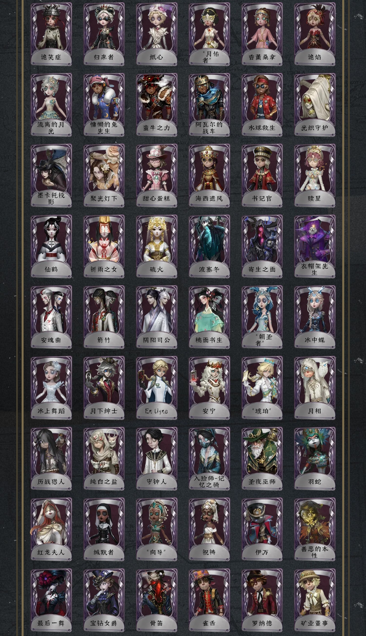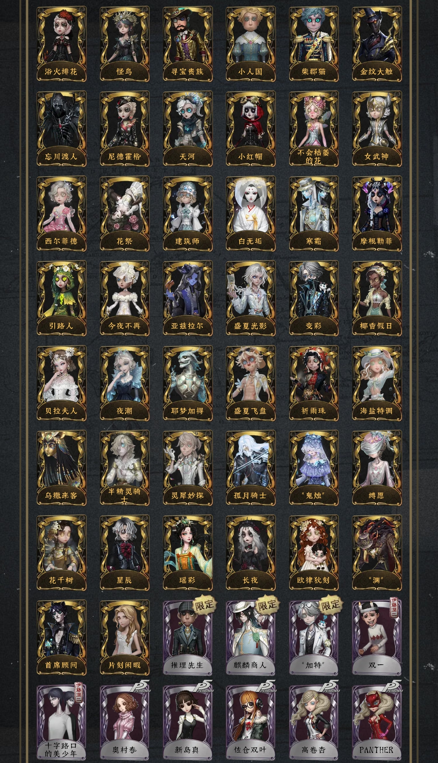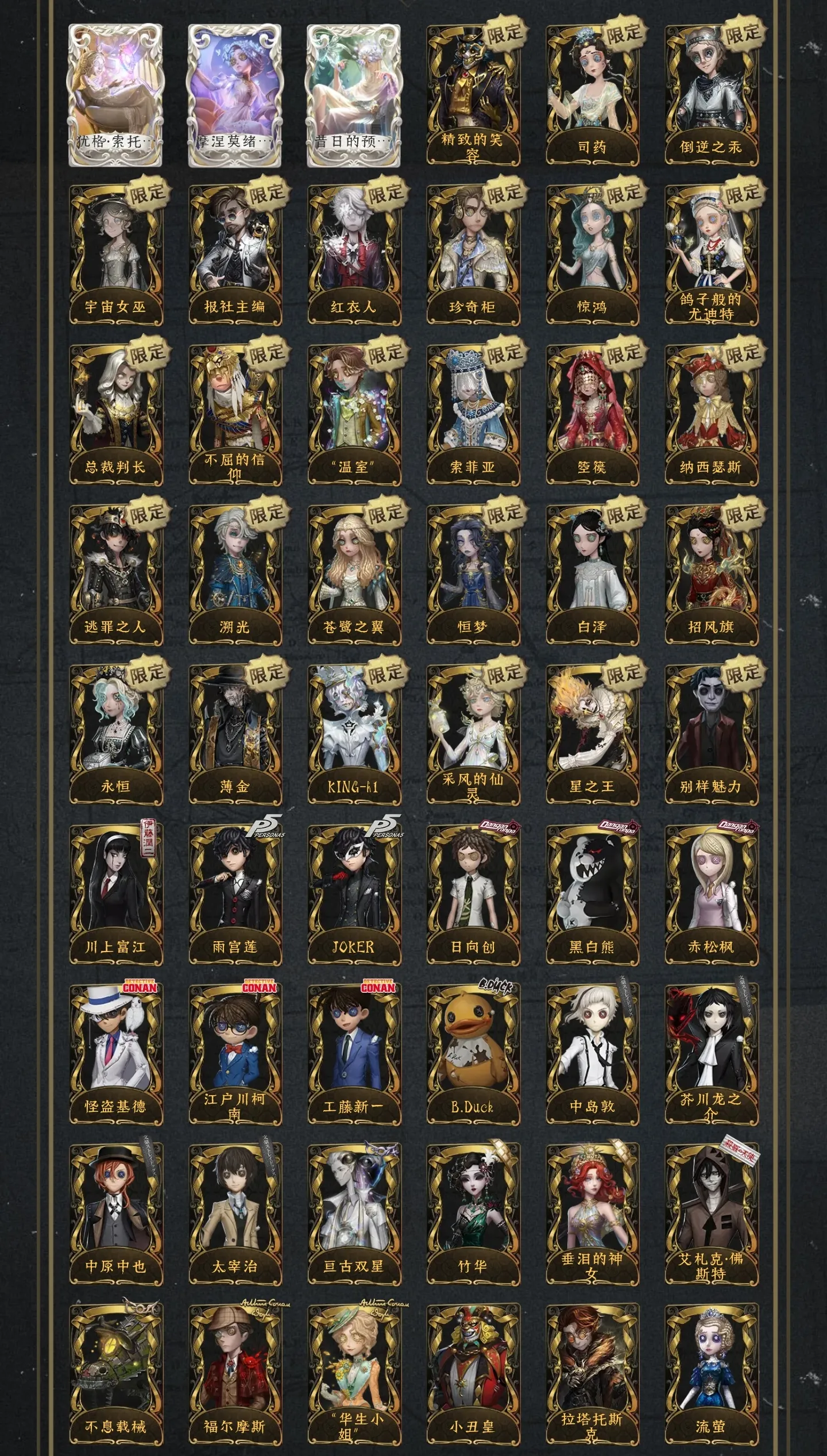 金皮有:司药 倒逆之汞 宇宙女巫 红衣人 珍奇柜 报社主编 总裁判长 温室 惊鸿 鸽子般的尤迪特 索菲亚 箜篌 纳西瑟斯 逃罪之人 溯光 苍鹫之翼 恒梦 白泽 招风旗 永恒 KING-h1薄金 星之王 采风的仙灵 B.Duck 中岛敦 中原中也 芥川龙之介 太宰治 亘古双星 不息载械 怪盗基德 江户川河南 工藤新一 黑白熊 日向创 赤松枫 艾札克 扎克 川上富江 福尔摩斯 华生小姐 竹华 垂泪的神女 雨宫莲 JOKER 拉塔托斯克 流萤 浴火绯花 怪鸟 金纹大触 忘川渡人 柴郡猫 尼德霍格 天河 小人国 白无垢 亚兹拉尔 盛夏光影 贝拉夫人 夜潮 小丑皇 寒霜 盛夏飞盘 椰香假日 变彩 摩根勒菲 引路人 小红帽 不会枯萎的花 今夜不再 海盐特调 鬼烛 缚愿 祈雨珠 建筑师 花千树 寻宝贵族 花祭 半精灵骑士 星辰 长夜 女武神 希尔菲德 孤月骑士 欧律狄刻 瑶彩 灵犀妙探 首席顾问 渊 乌撒来客 耶梦加得