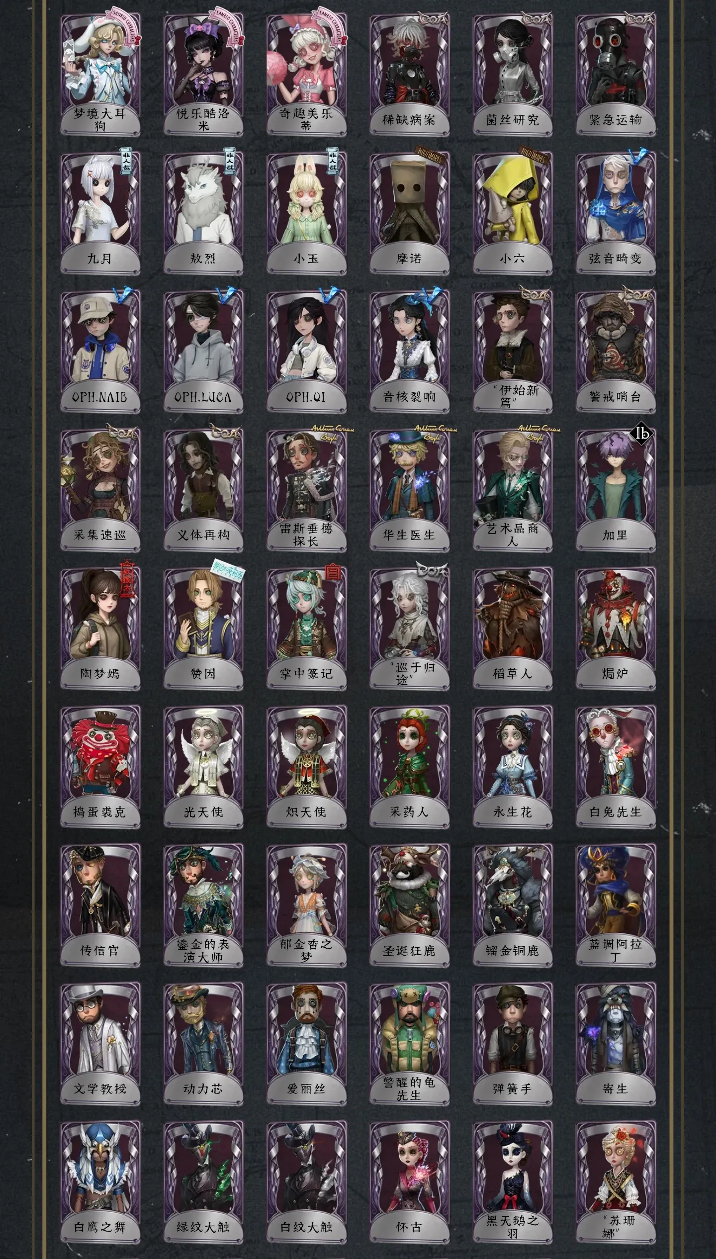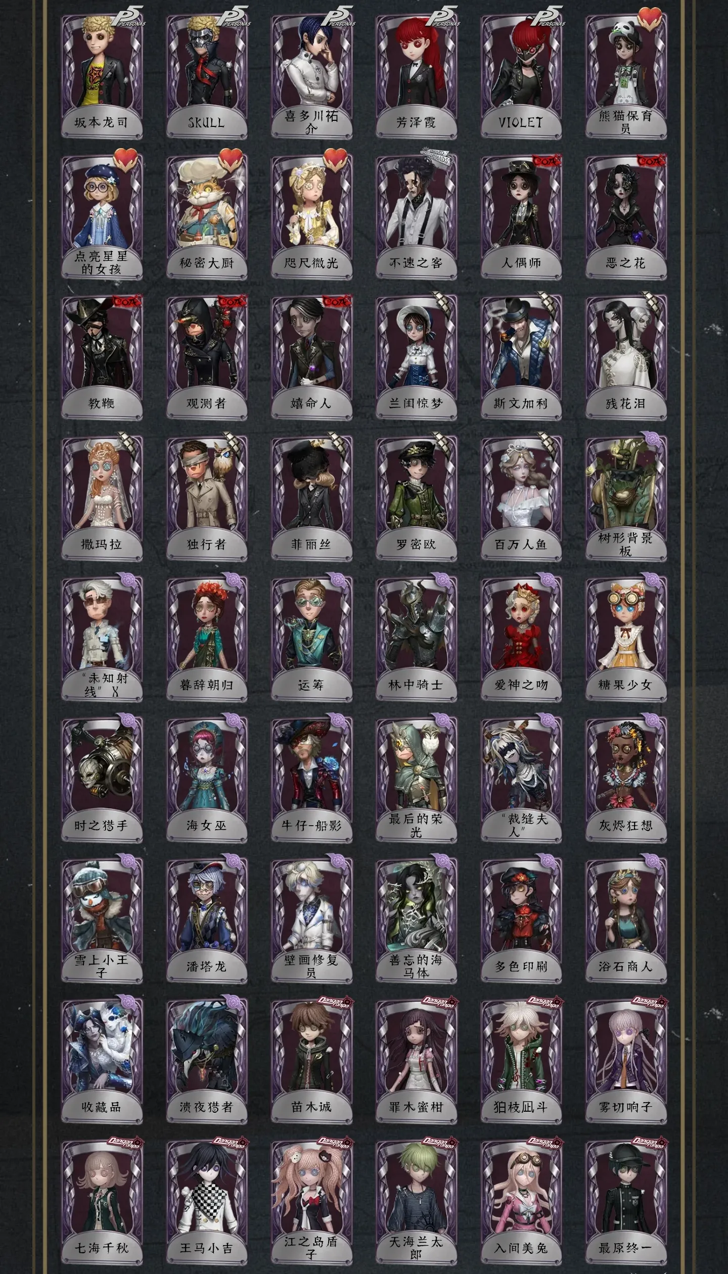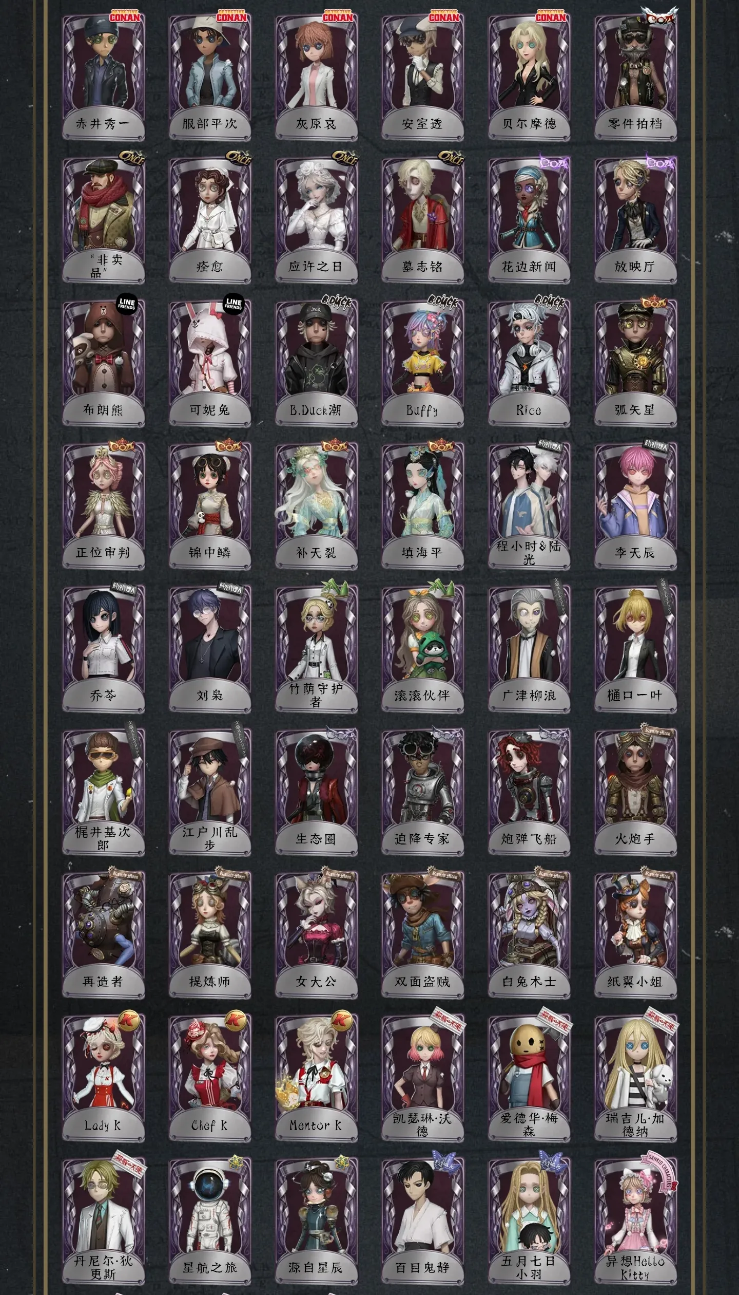 紫皮有:潮奈 Buffy Rice 苗木诚 罪木蜜柑 雾切响子 七海千秋 王马小吉 江之岛盾子 天海兰太郎 入间美兔 最原终一 芳泽霞 坂本龙司 高卷杏 九月 敖烈 小玉 赤井秀一 服部平次 灰原哀 安室透 贝尔摩德 HelloKitty 梦境大耳狗 悦乐库洛米 奇趣美乐蒂 百目鬼静 五月七日小羽 瑞吉儿 凯瑟琳 爱德华 摩诺 小六 布朗熊 可妮兔 不速之客 捣蛋裘克 星航之旅 LadyK ChefK 熊猫保育员 滚滚伙伴 点亮星星的女孩 程小时 佣兵电竞NAIB 李天辰 咫尺微光 囚徒电竞LUCA 古董电竞QI 乔苓 刘枭