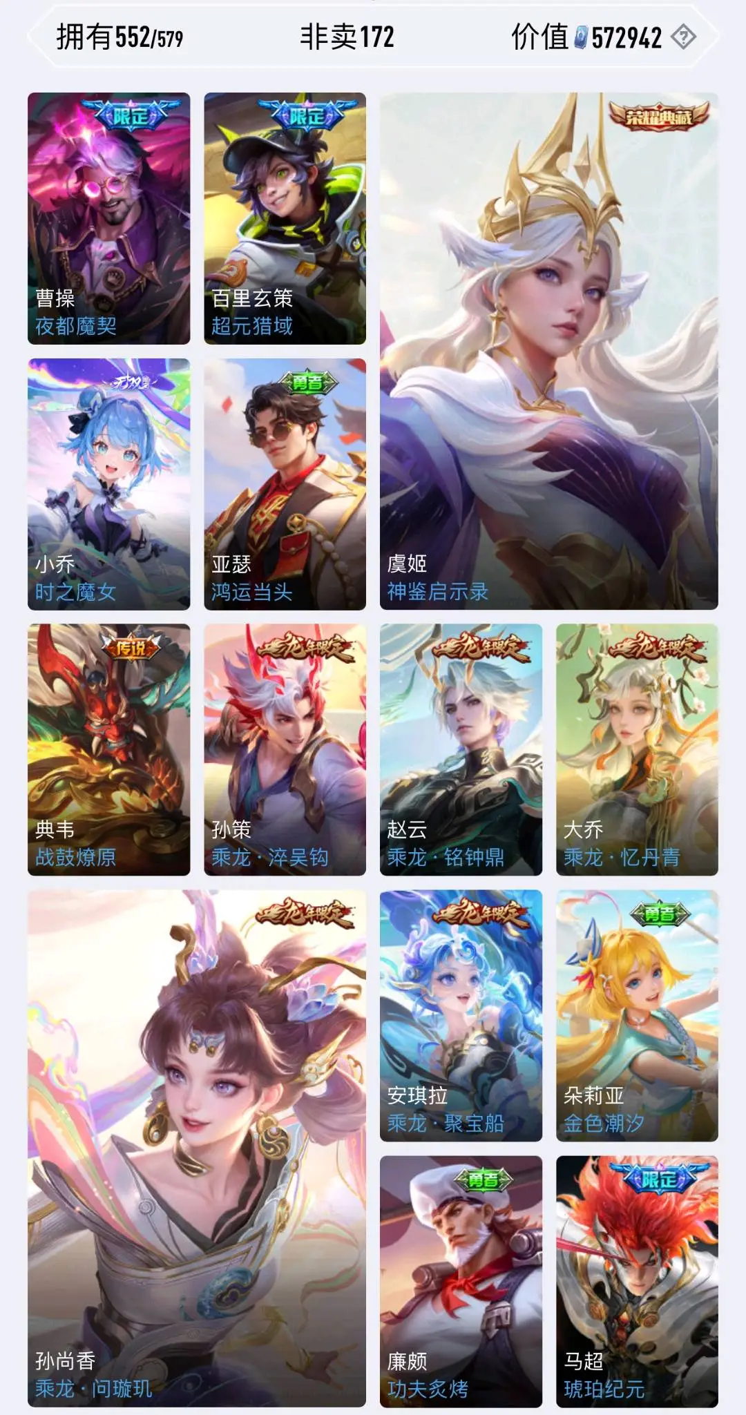【安卓】 包天58【无双v10】778皮肤,李信新无双问心剑,马年全套,伽罗珍品,差6满皮肤,历史小国李白