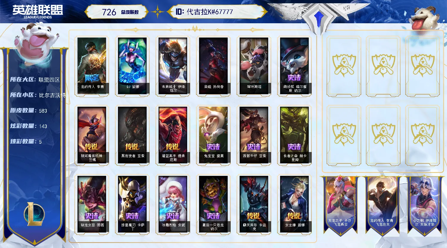 750皮肤多限定可排位全英雄黑龙瞎龙猴冰原狙击广寒仙子黑夜亚索吕布花木兰卧虎藏龙防暴士兵