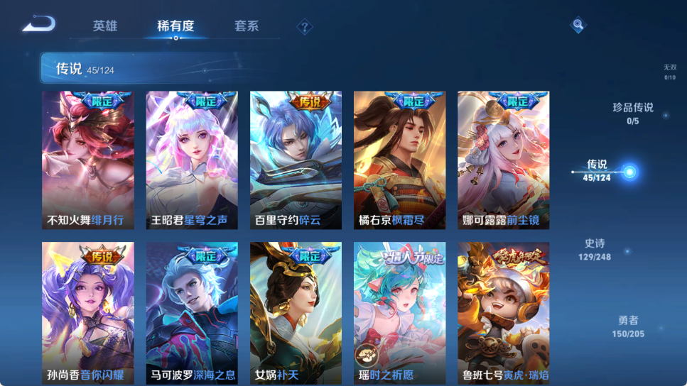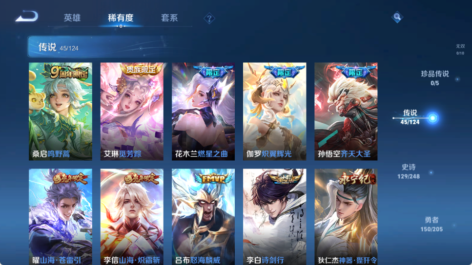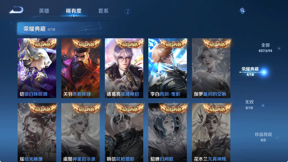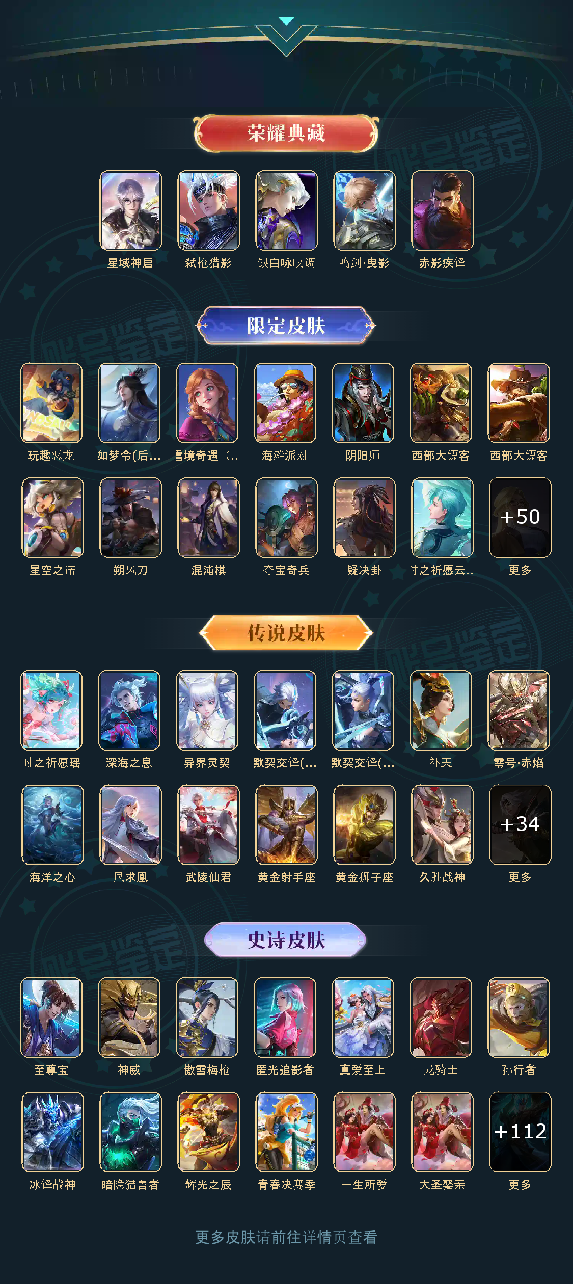 贵族等级V9,英雄数量123,典藏皮肤数4,皮肤数量407,冰锋战神/街头霸王/至尊宝/真爱至上/凤求凰/武陵仙君/黄金狮子座/一生所爱/大圣娶亲/青龙志/朱雀志/久胜战神/飞衡/梁祝/匿光追影者/鸣剑·曳影/星域神启/武圣/孙行者/玉兔公主/补天/异界灵契/神威/傲雪梅枪/淬星耀世