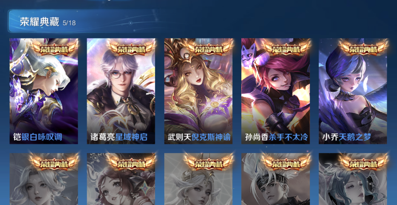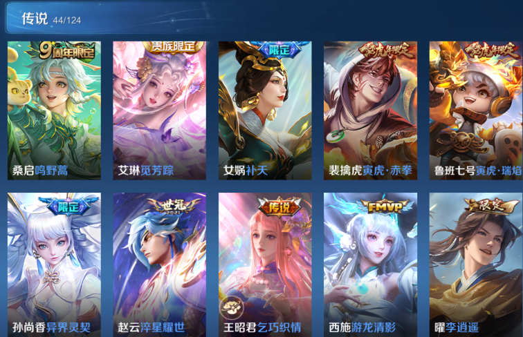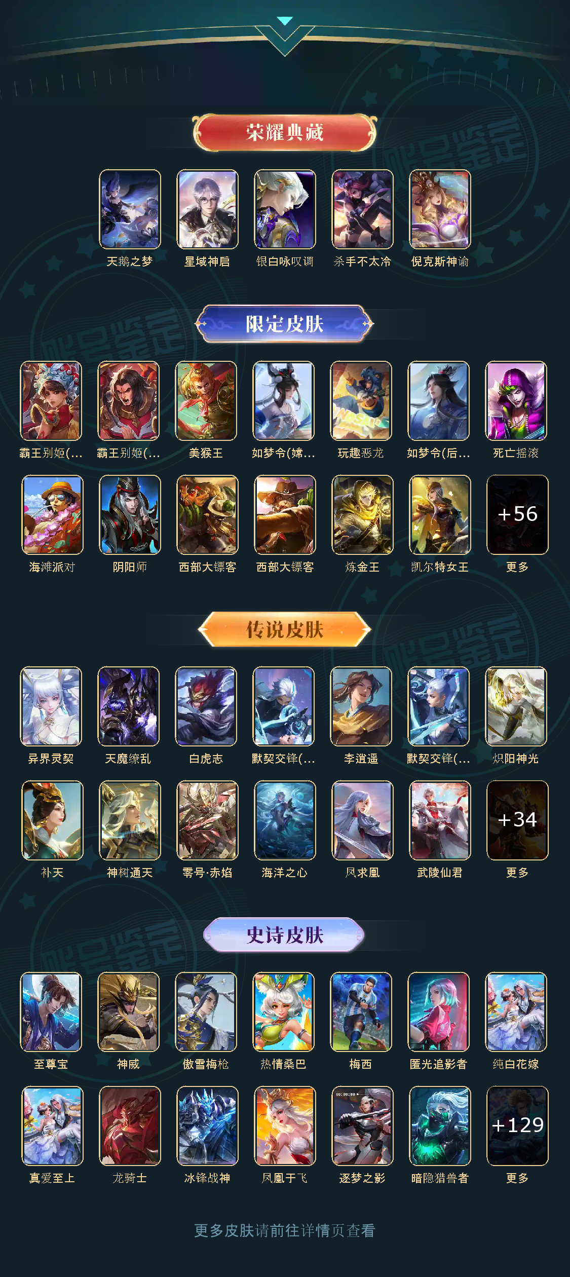 贵族等级V10,英雄数量124,典藏皮肤数5,皮肤数量422,
