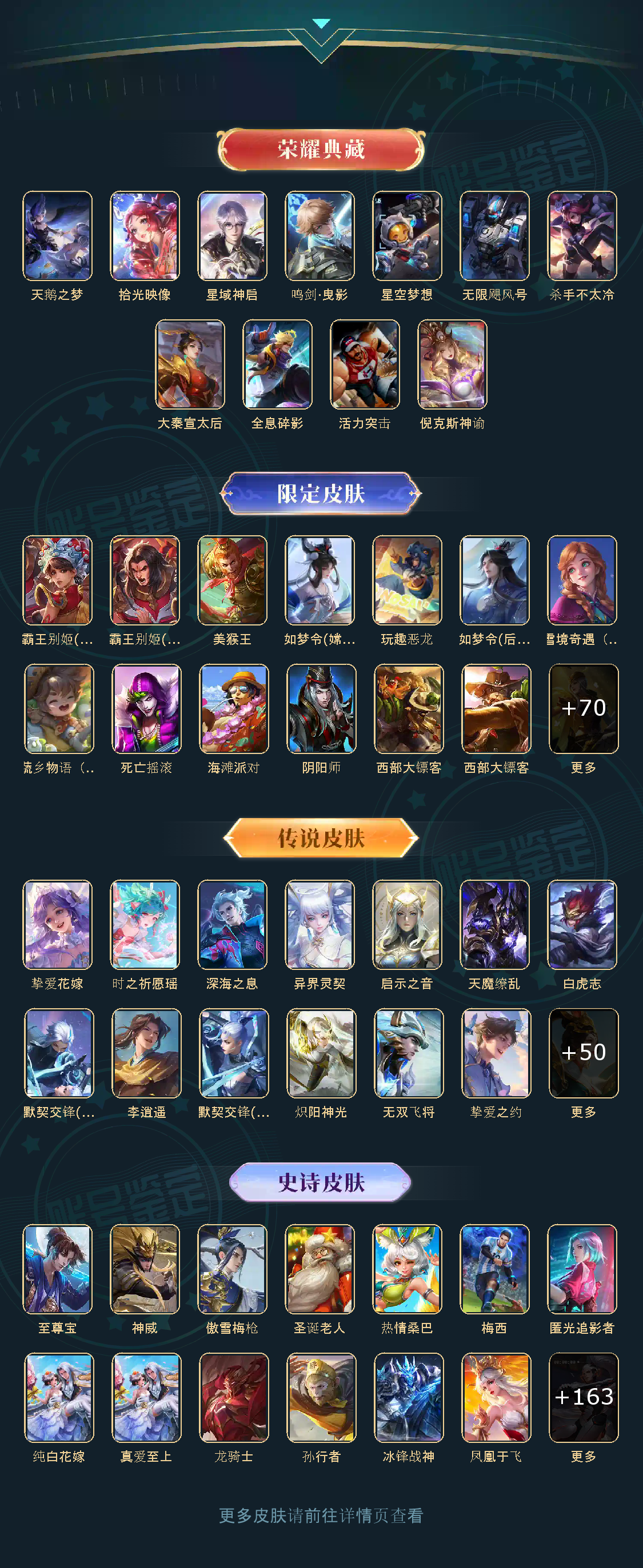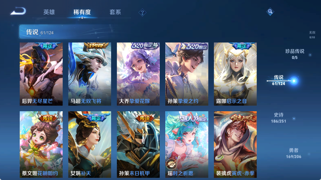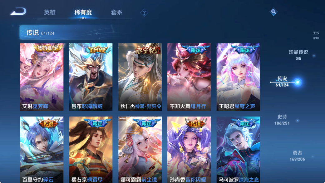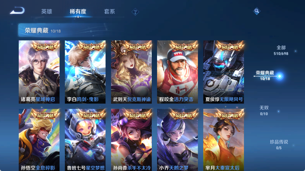 贵族等级V10,英雄数量125,典藏皮肤数10,皮肤数量510,