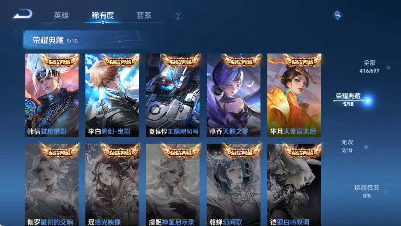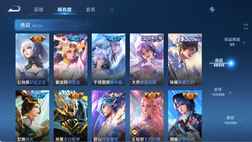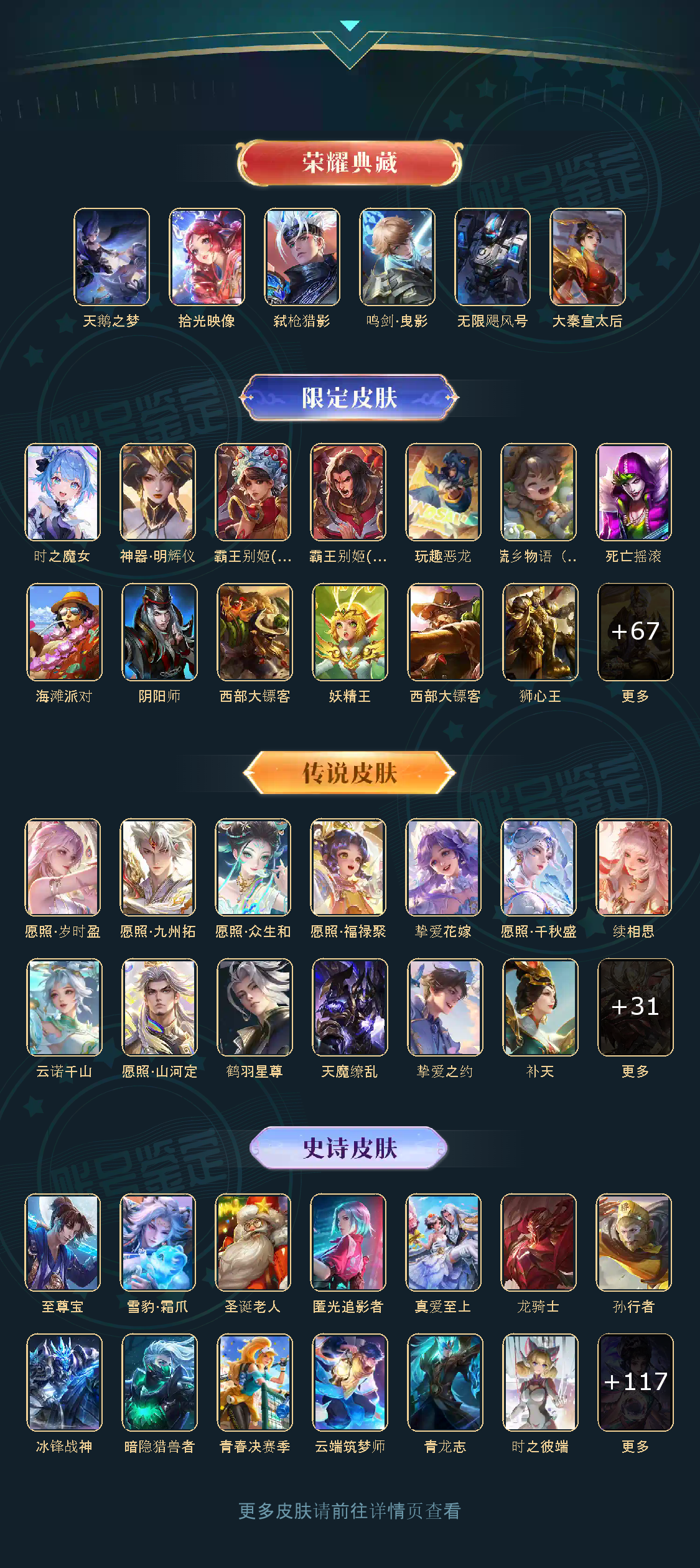贵族等级V10,英雄数量125,典藏皮肤数5,皮肤数量417,
