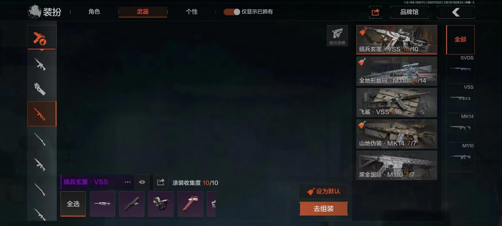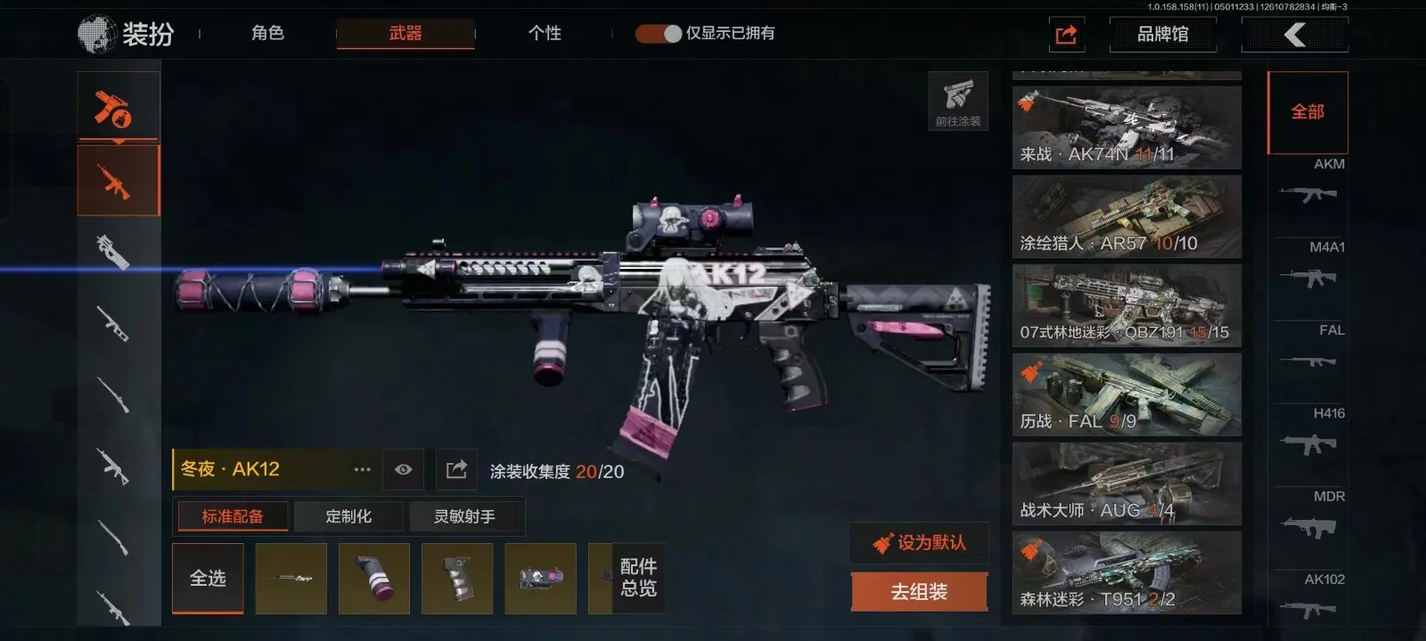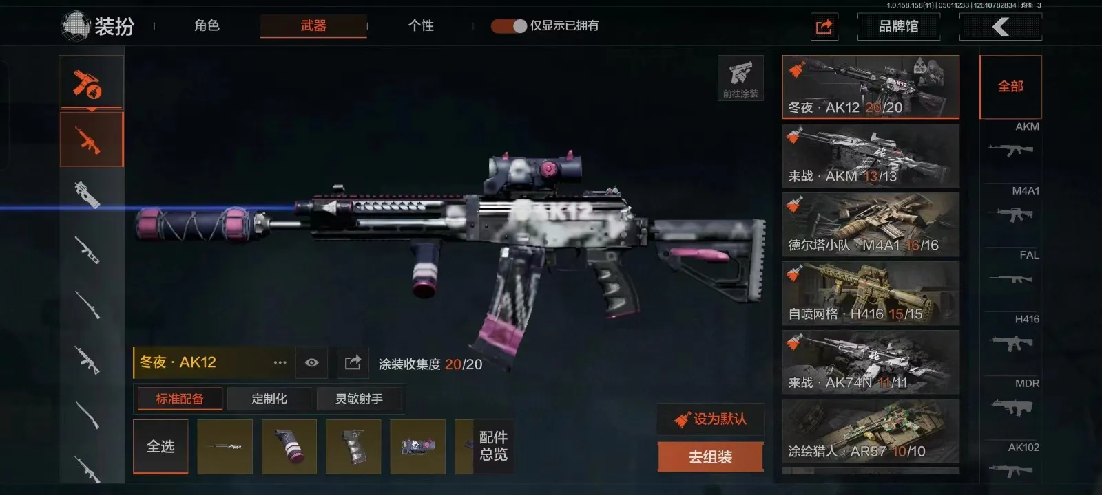 等级30 冬日冰镐 冬夜AK 来战AK 散花海涂装 盛冬涂装 历战FAL 玄戈梨花MPX 灰鼠幻歌P90 娜迦RPK 缟兵玄墨VSS 盛冬SK 营房棉服