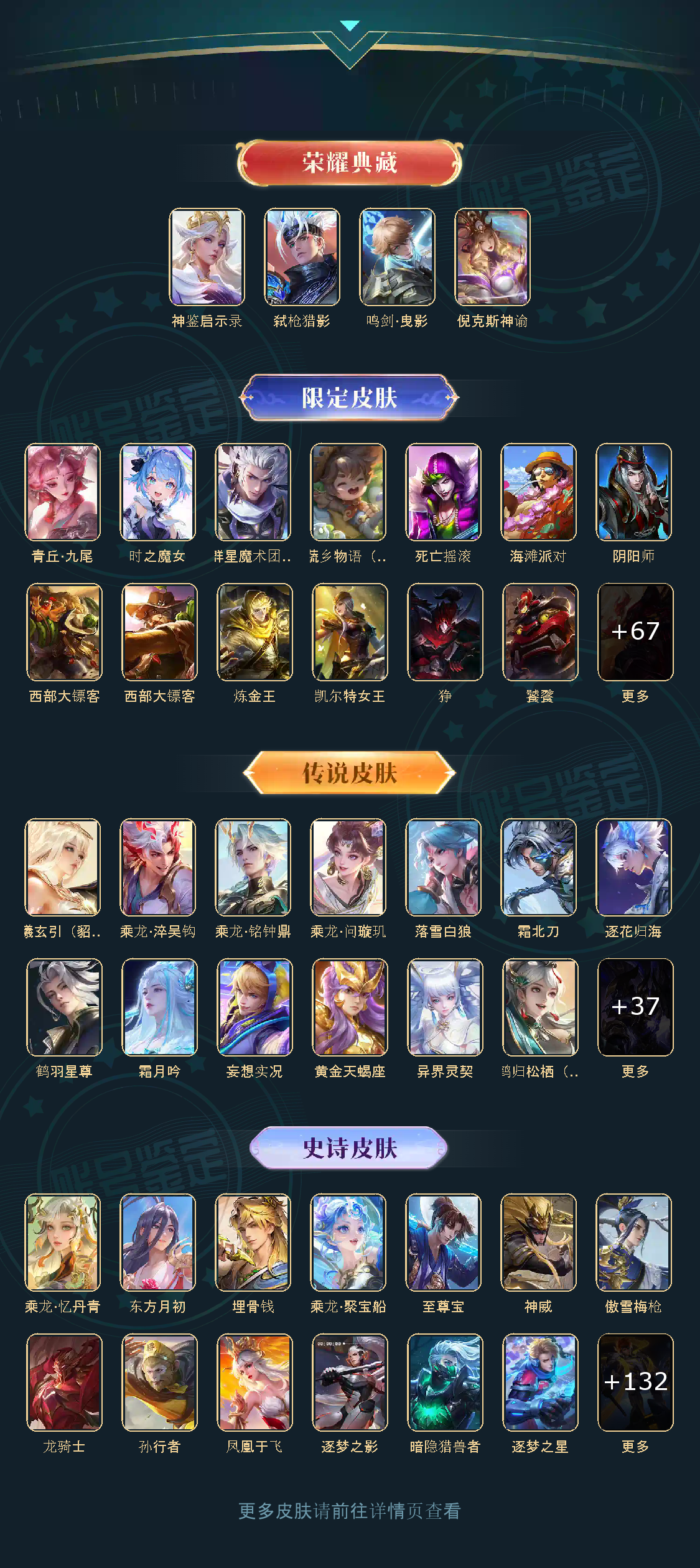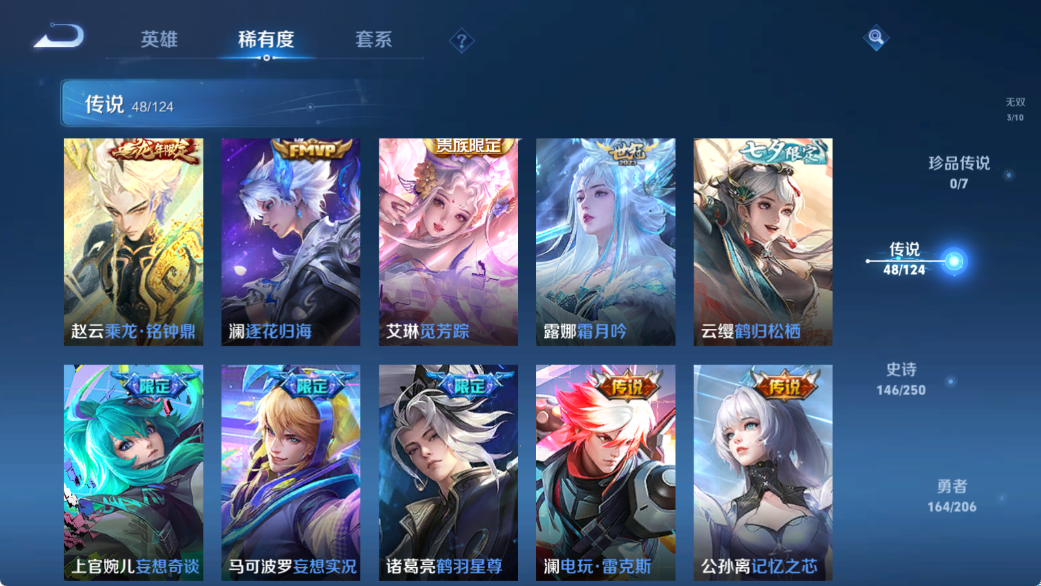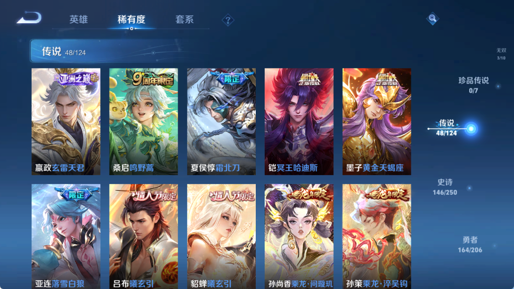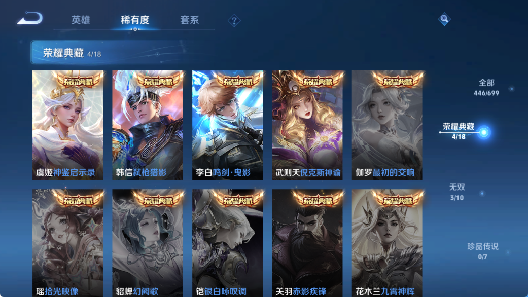 贵族等级V10,英雄数量125,典藏皮肤数4,皮肤数量446,