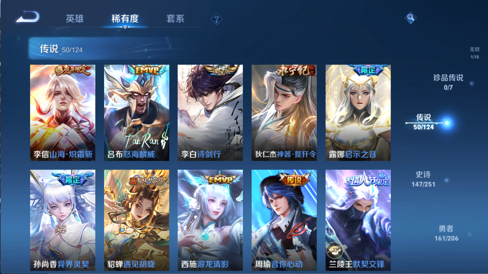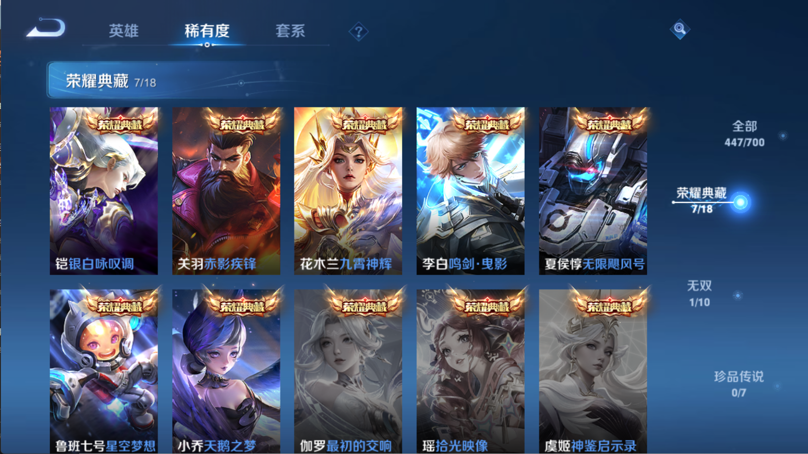 贵族等级V9,英雄数量122,典藏皮肤数7,皮肤数量447,