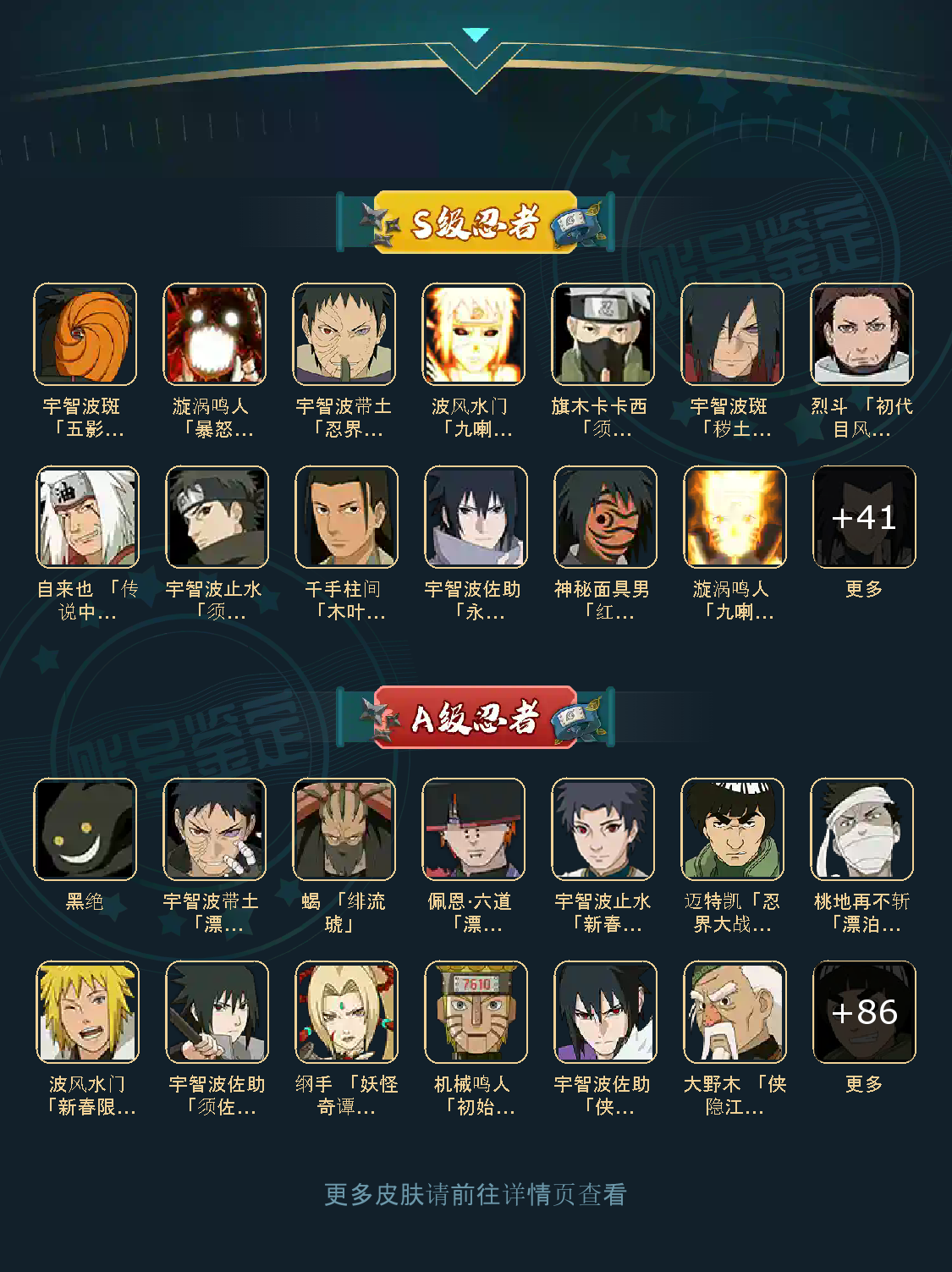 54S 98A 405忍者 宇智波带土「暴怒」/干柿鬼鲛「鲛肌融合」/宇智波佐助「疾风传咒印」/迈特凯「忍界大战」/宇智波带土「忍界大战」/宇智波斑「木叶创立」/佩恩·天道「超」
