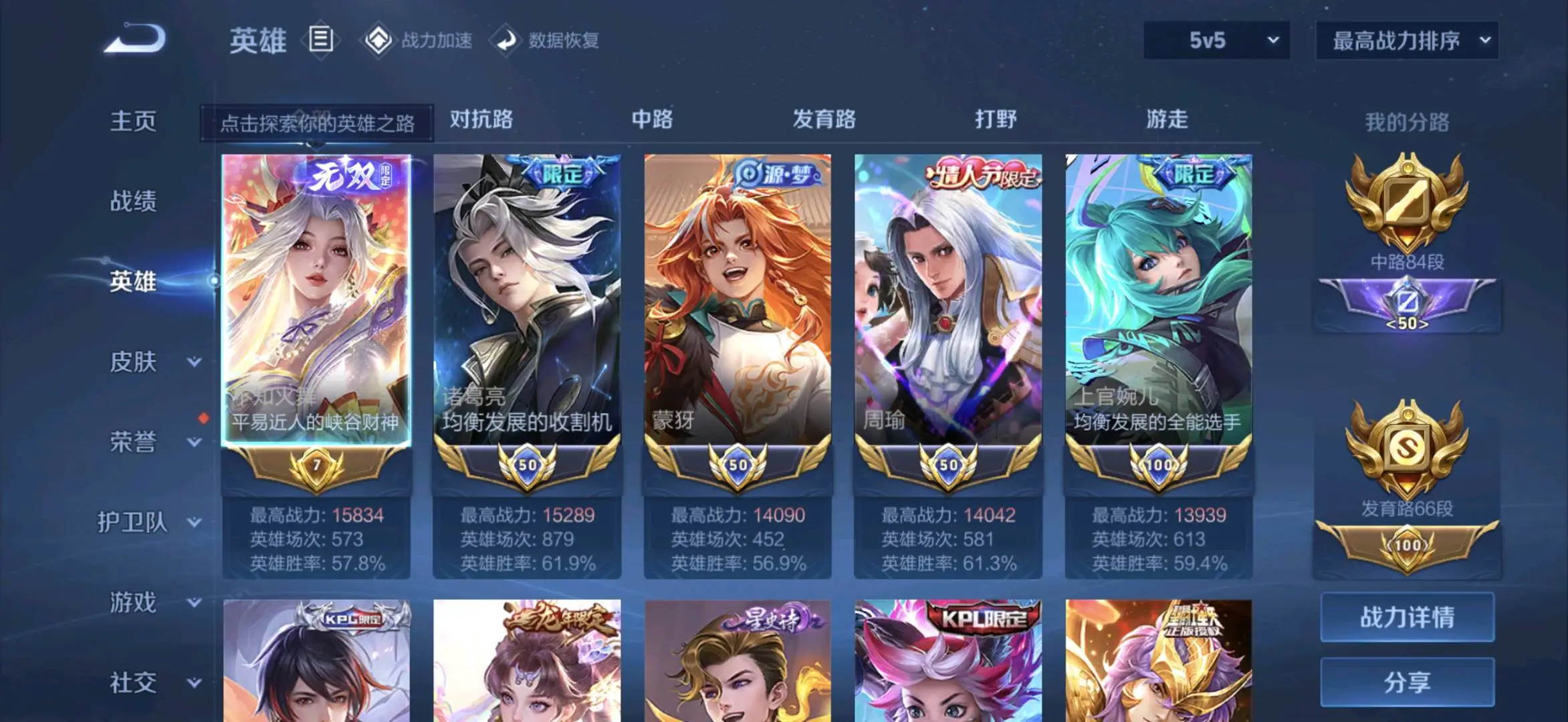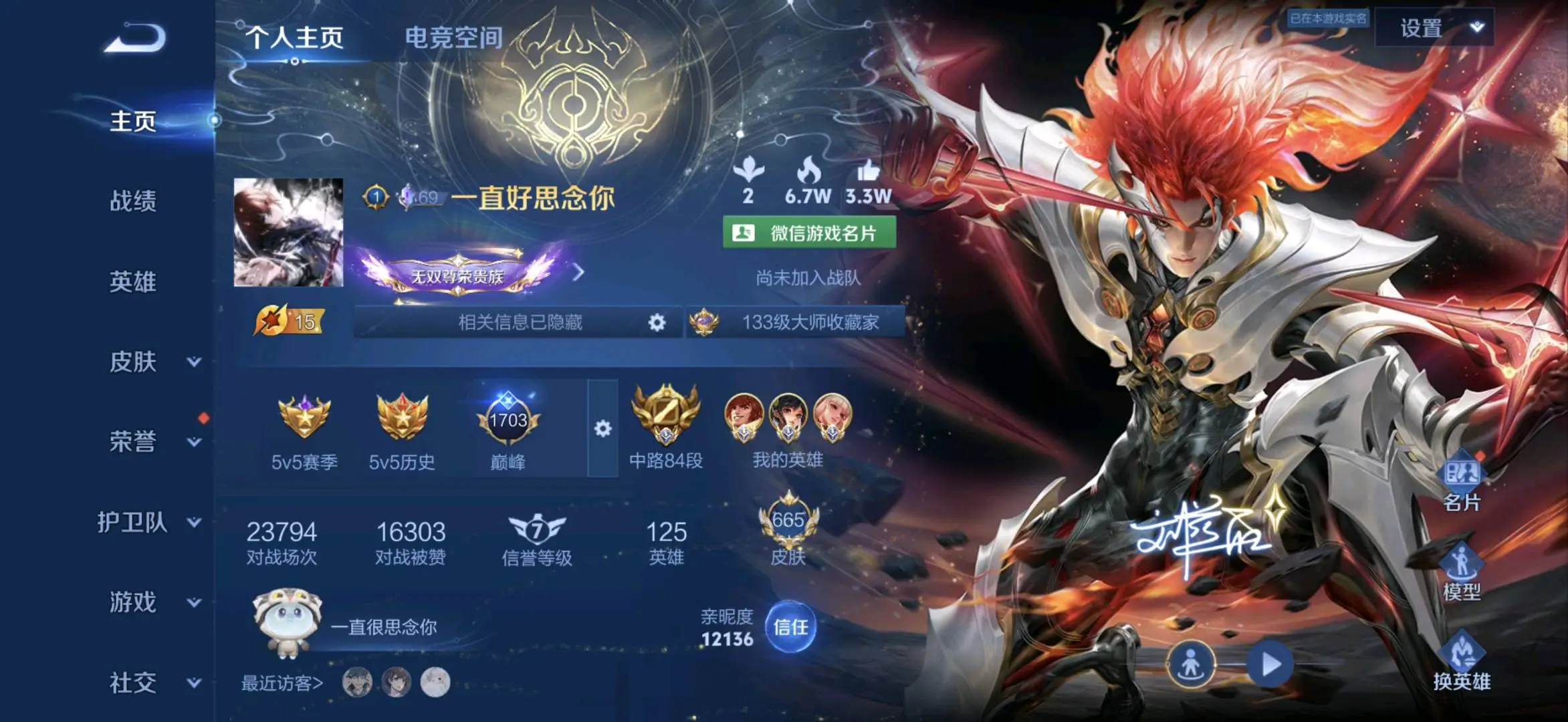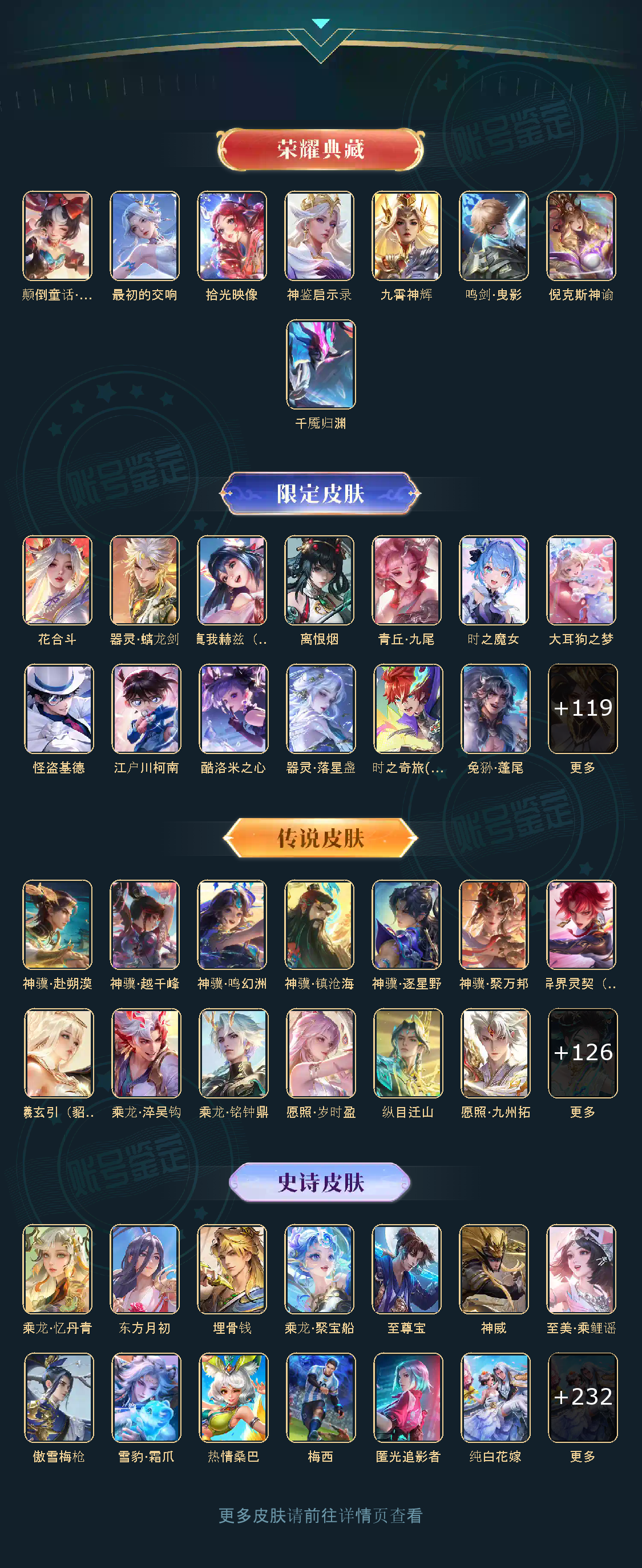 贵族等级V10无双贵族,英雄数量129,典藏皮肤数8,皮肤数量755,冰锋战神/街头霸王/纯白花嫁/天魔缭乱/至尊宝/真爱至上/王者之锤/凤求凰/热情桑巴/逐梦之影/武陵仙君/神奇女侠/梅西/黄金狮子座/一生所爱/大圣娶亲/冰霜恋舞曲/青龙志/白虎志/朱雀志/太华/久胜战神/飞衡/梁祝/倪克斯神谕/白鹤梁神女/匿光追影者/鸣剑·曳影/遇见胡旋/龙胆/李逍遥/武圣/奔雷神使/孙行者/玉兔公主/补天/异界灵契/神威/启示之音/傲雪梅枪/淬星耀世/时雨天司